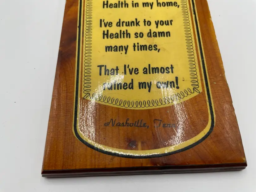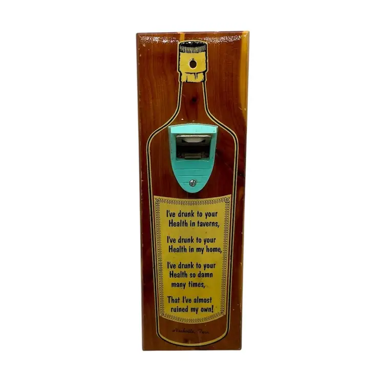 This product is a vintage wooden bottle opener featuring a funny toast, perfect for adding a touch of nostalgia to any bar or man cave. The wall-mounted opener is a unique souvenir from Nashville, showcasing a piece of 1960s culture. With a theme centered around drinking, this collectible item is a must-have for any beer enthusiast looking to add a quirky accent to their space.