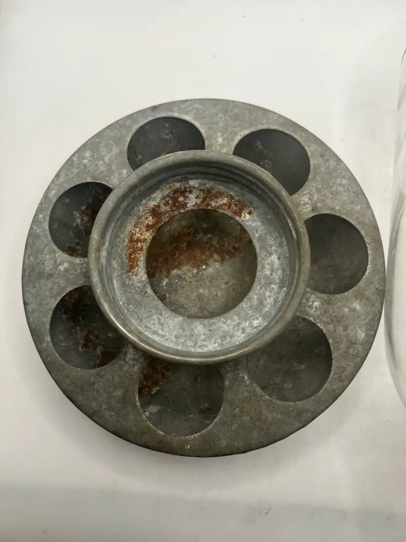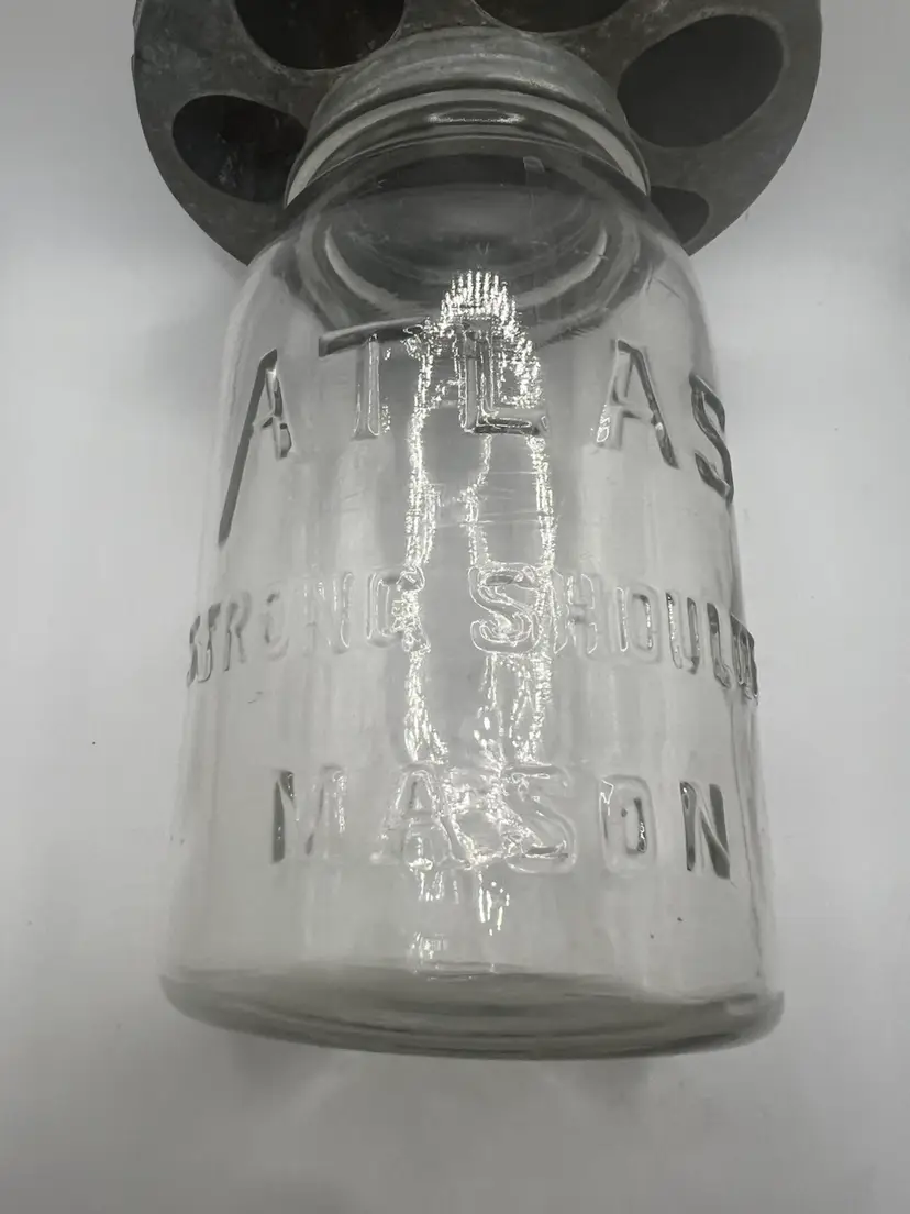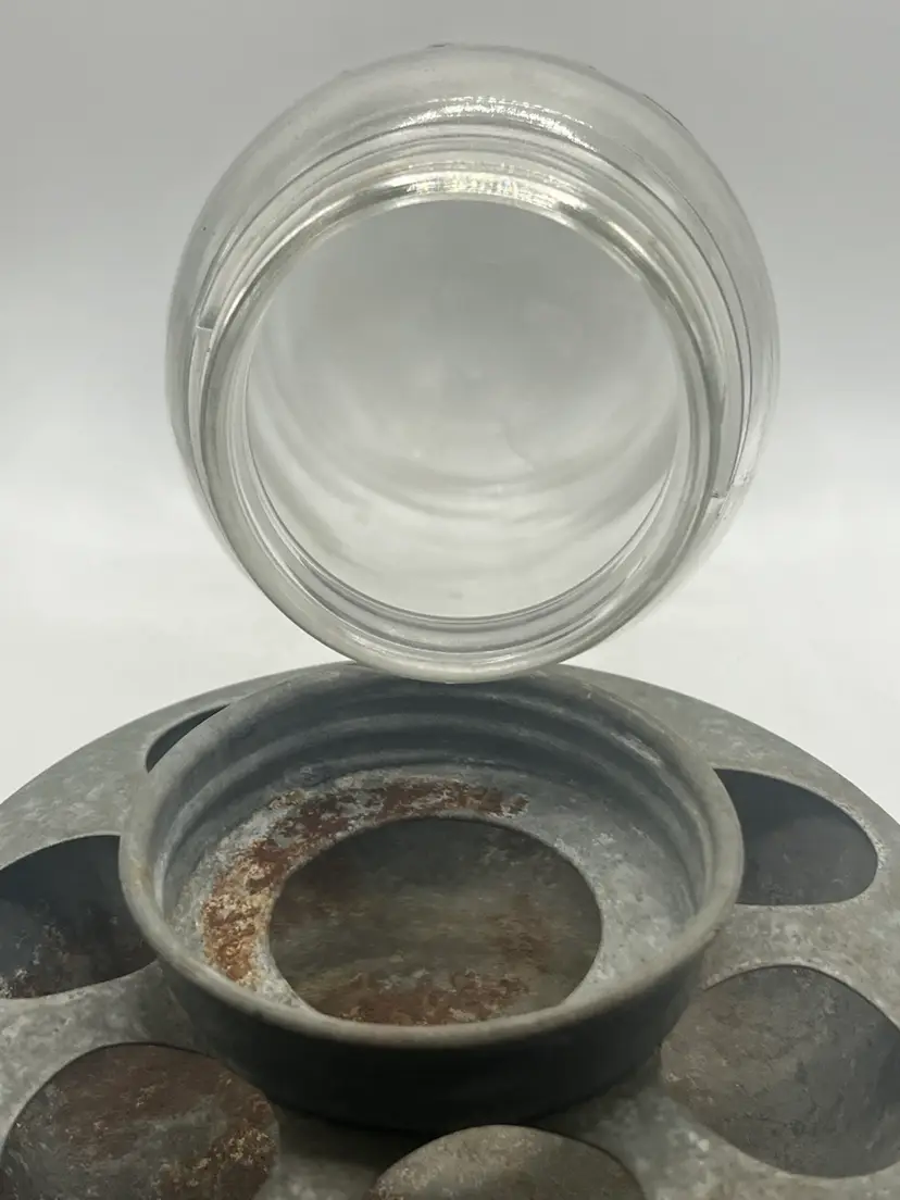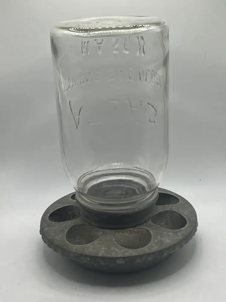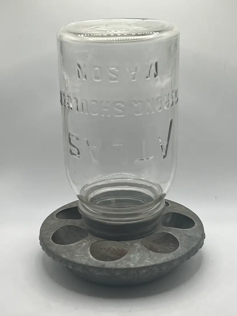 “Atlas Strong Shoulder Mason” jar stands 8.5” tall and screws into a galvanized metal bottom that is 5.5” in diameter with 7 holes. No chips or cracks in jar and the feeder has a slight amount of rust on the inside, but has damage and the crimping is still solid. If you have any questions, pls message me Thank you GIFT WITH PURCHASE!🎁