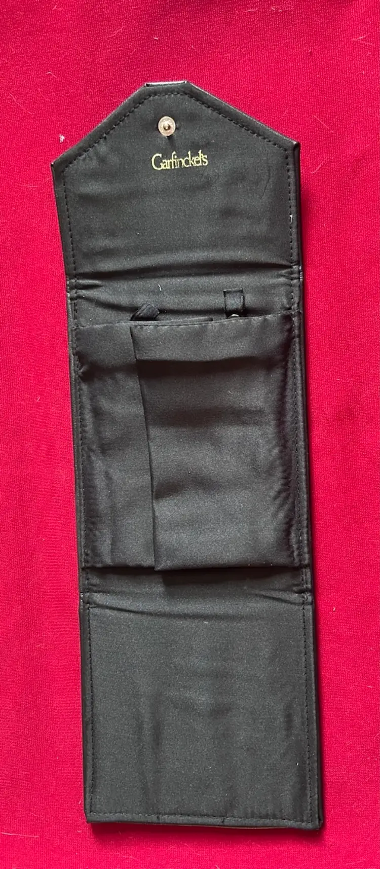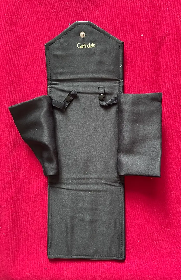 Vtg Garfinckel’s Branded Black Leatherette Trabel Jewelry Necklace Carrying Case. Satin lined. Please see photos and let me know if you have any questions. Offers considered. Thank you for stopping by.