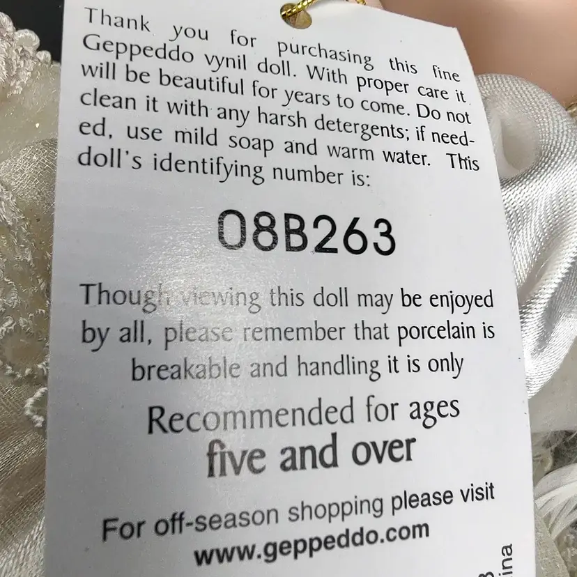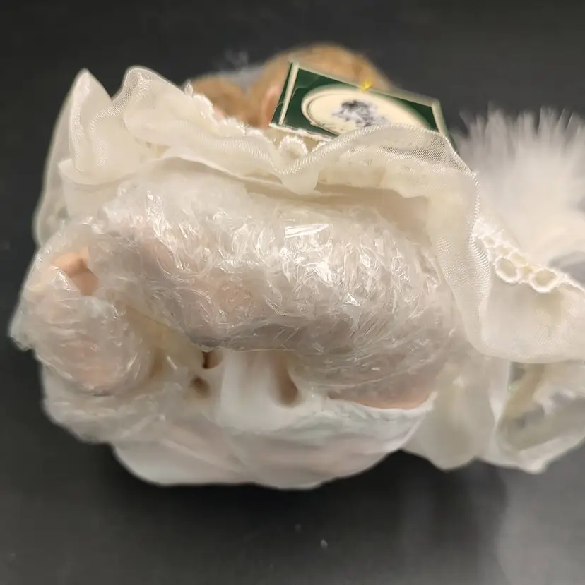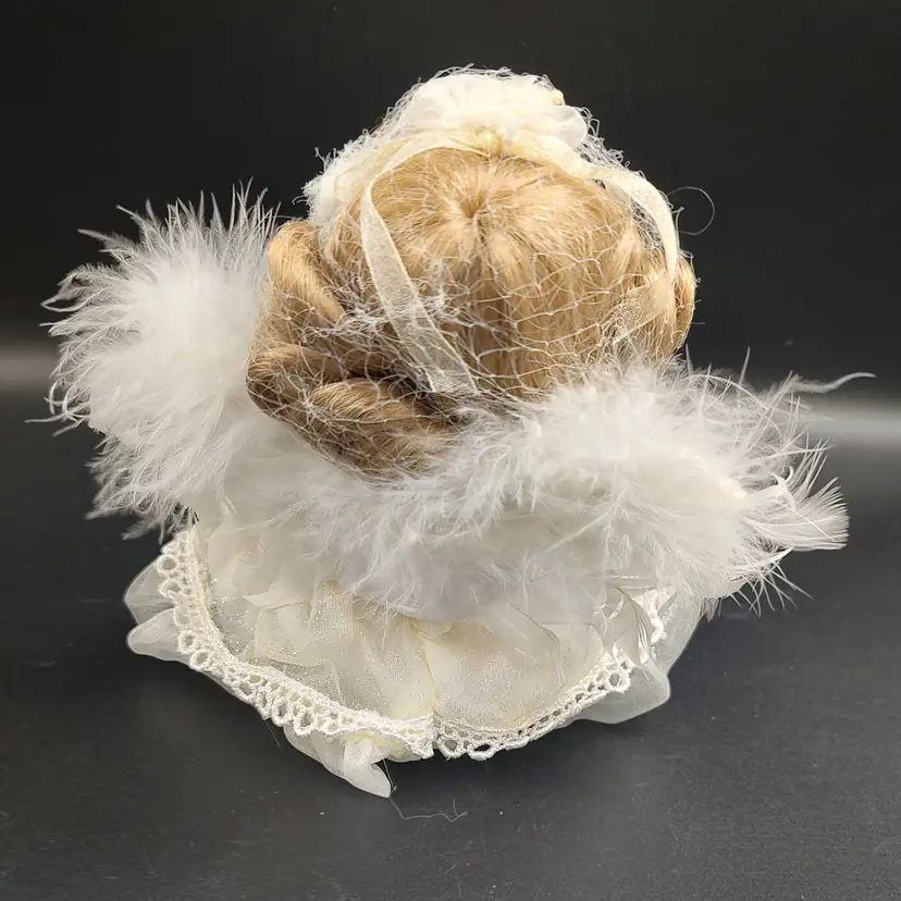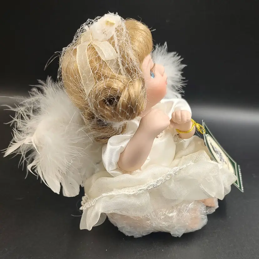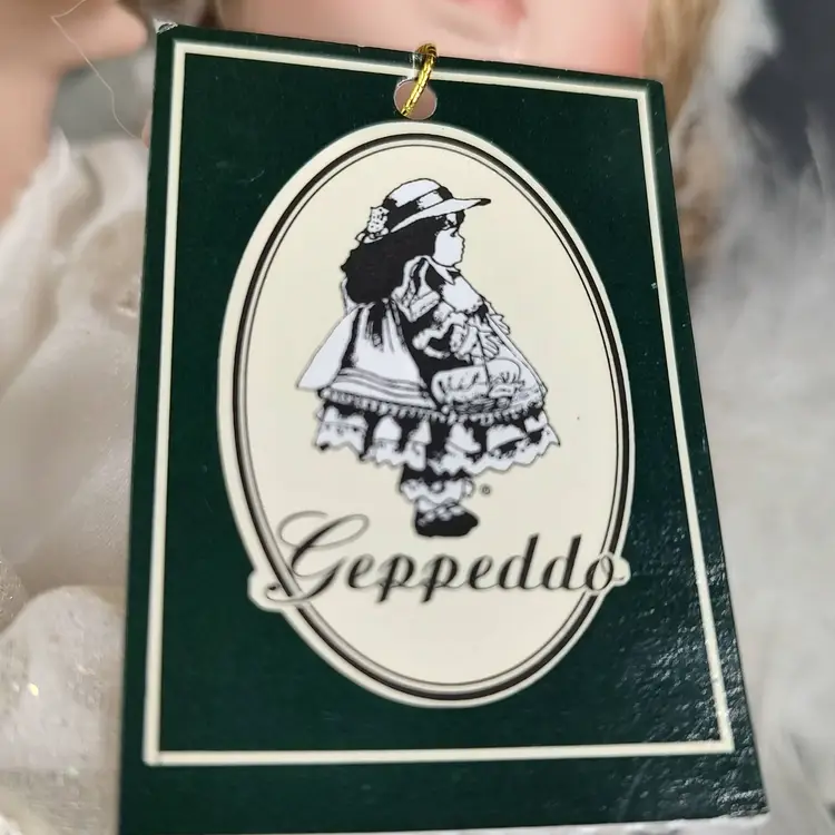 Vintage 1980 Geppedo Angel Porcelain Doll Modern Porcelain Doll Line # 08B263 Blonde Curly Hair Blue Eyes. Comes in the original box with Tag, Dress, bloomers, headband and wings. Height 6" x width 3.5" Made in China