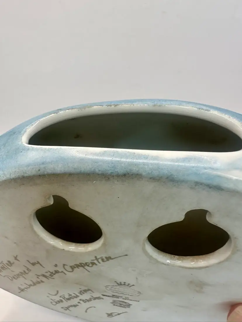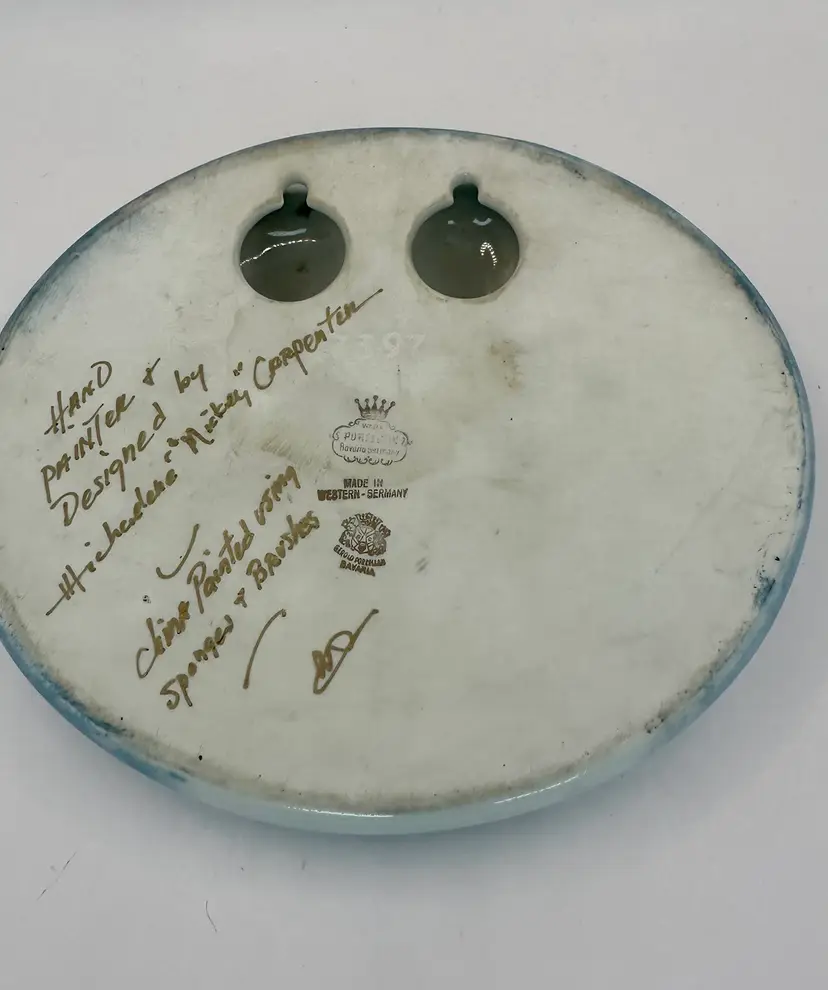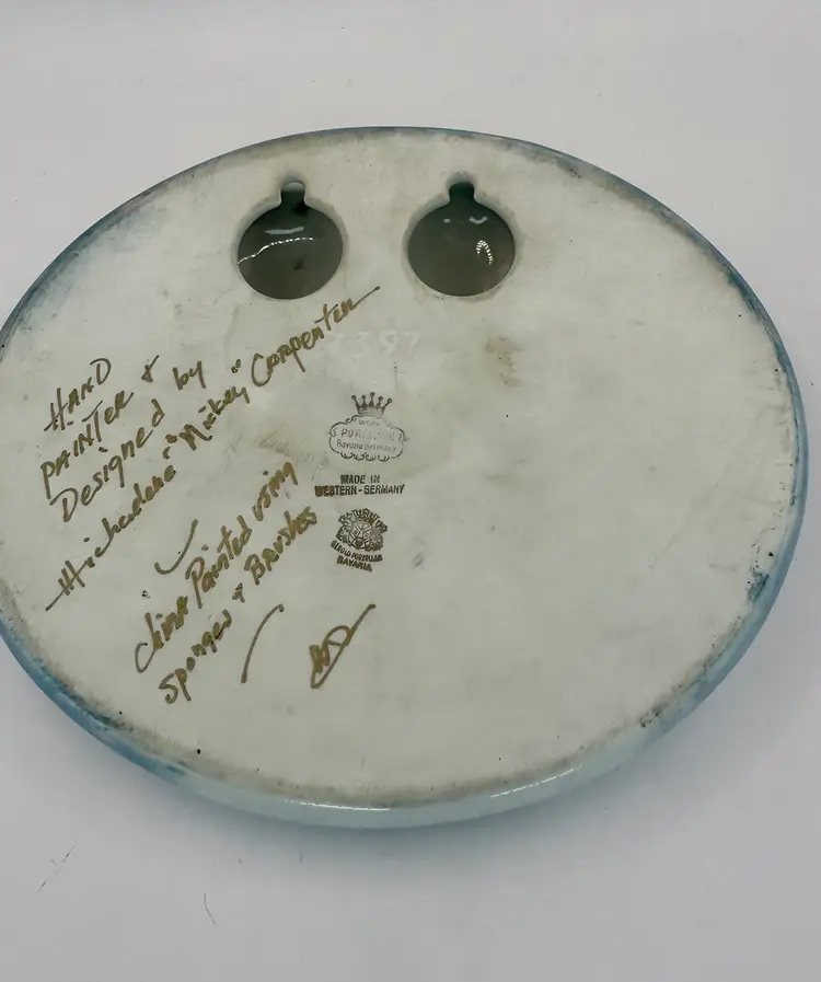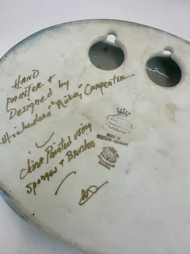 Hand painted “pillow” Wall pocket vase Doves of peace in white on blue background Signed by artist on front and back No chips or cracks Approximately 7 1/2” x 6” Porcelain made in West Germany