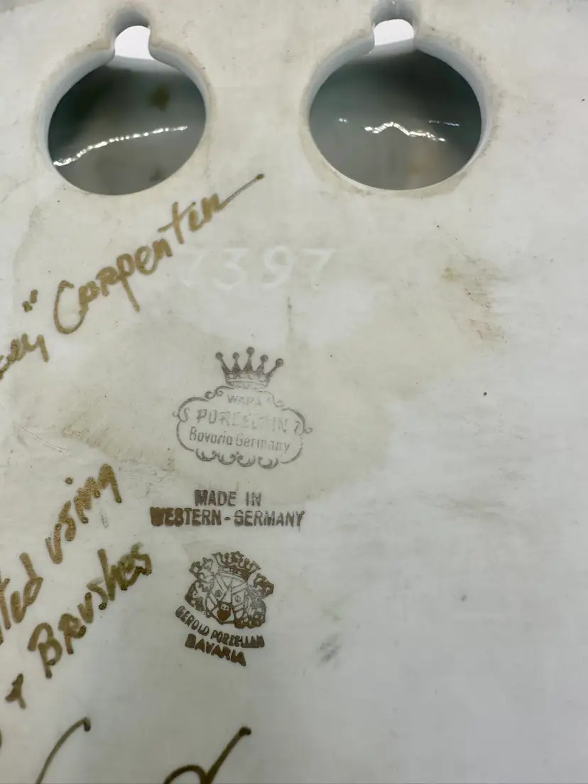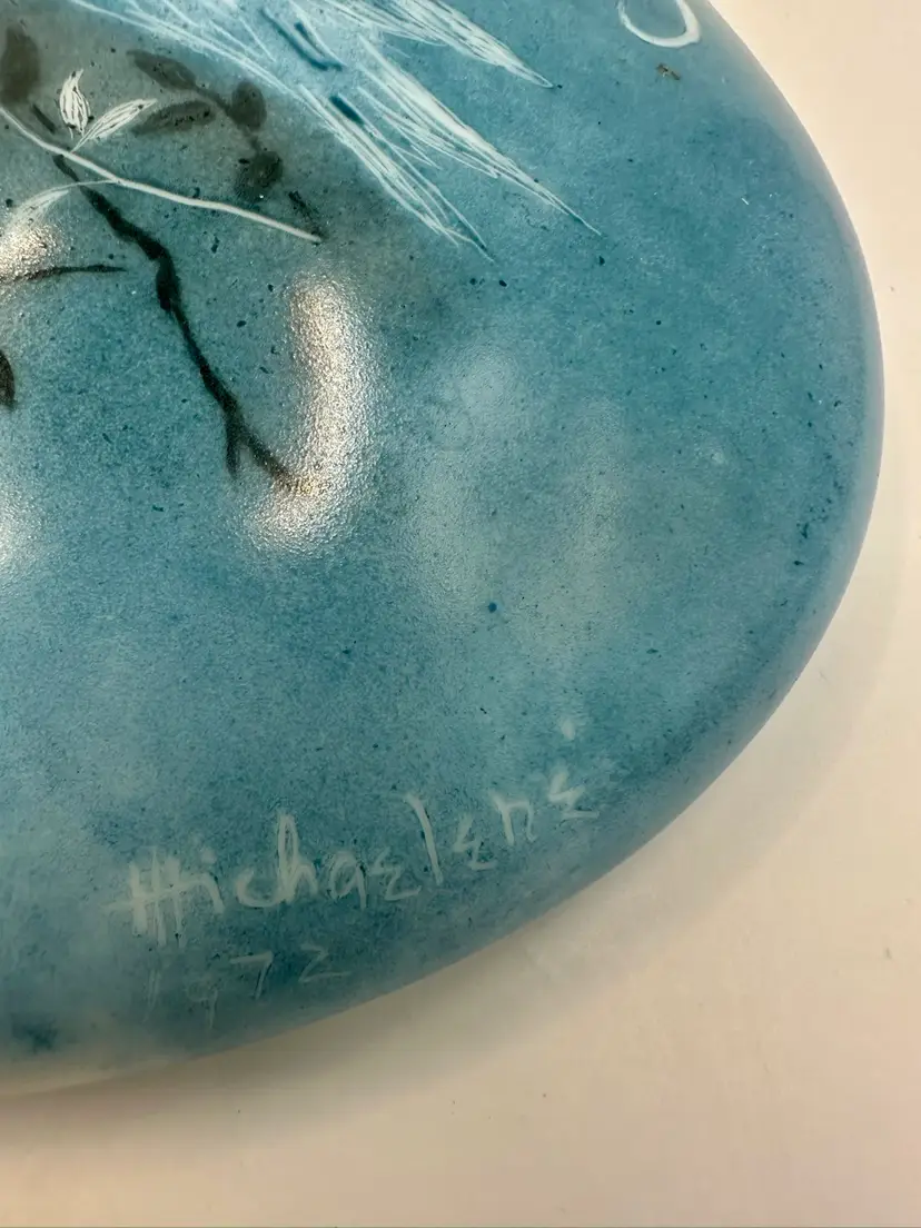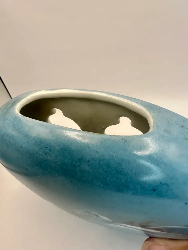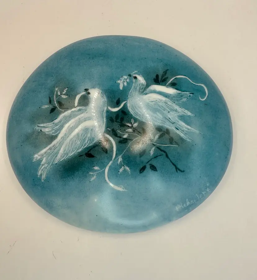 Hand painted “pillow” Wall pocket vase Doves of peace in white on blue background Signed by artist on front and back No chips or cracks Approximately 7 1/2” x 6” Porcelain made in West Germany