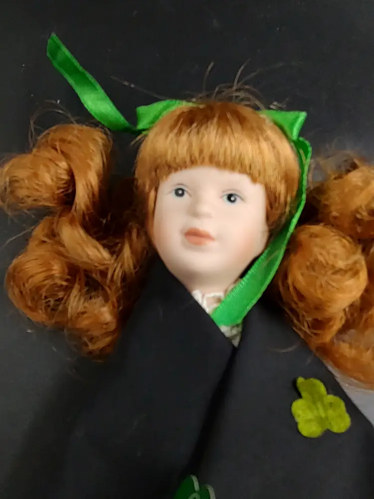 Vintage 1990 Shannon Distributor Gifts From Ireland Porcelain Collectors Doll Traditional Irish Dressed . Comes with original tag, stand, dress, shawl, shirt and Bloomers hand painted Face, hands and feet. curly red hair blue eyes. Height 8" x width 3.5". Made in Ireland