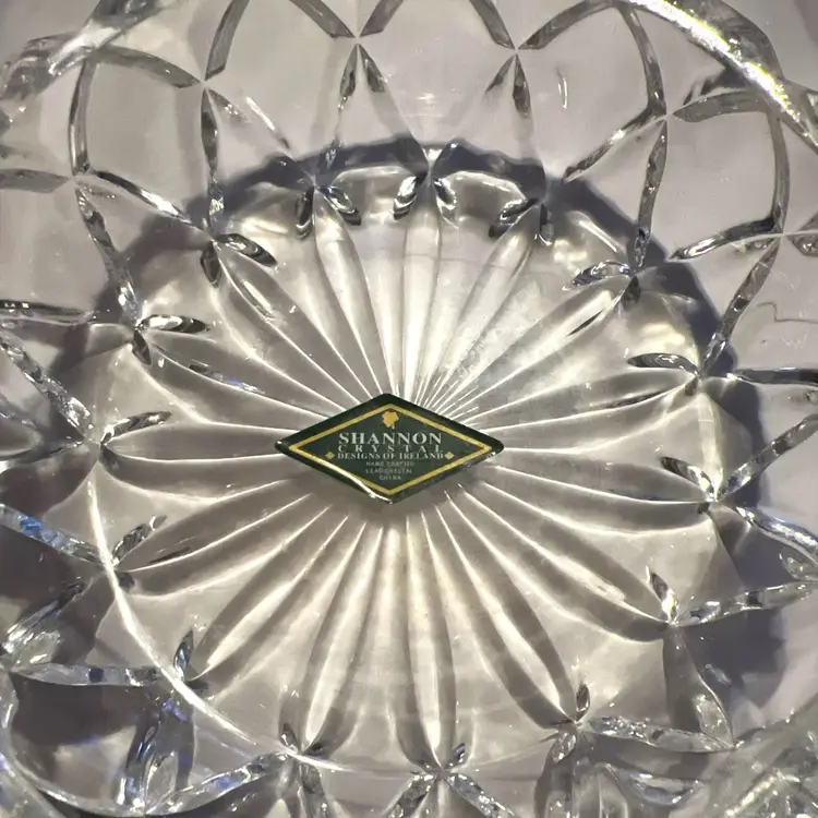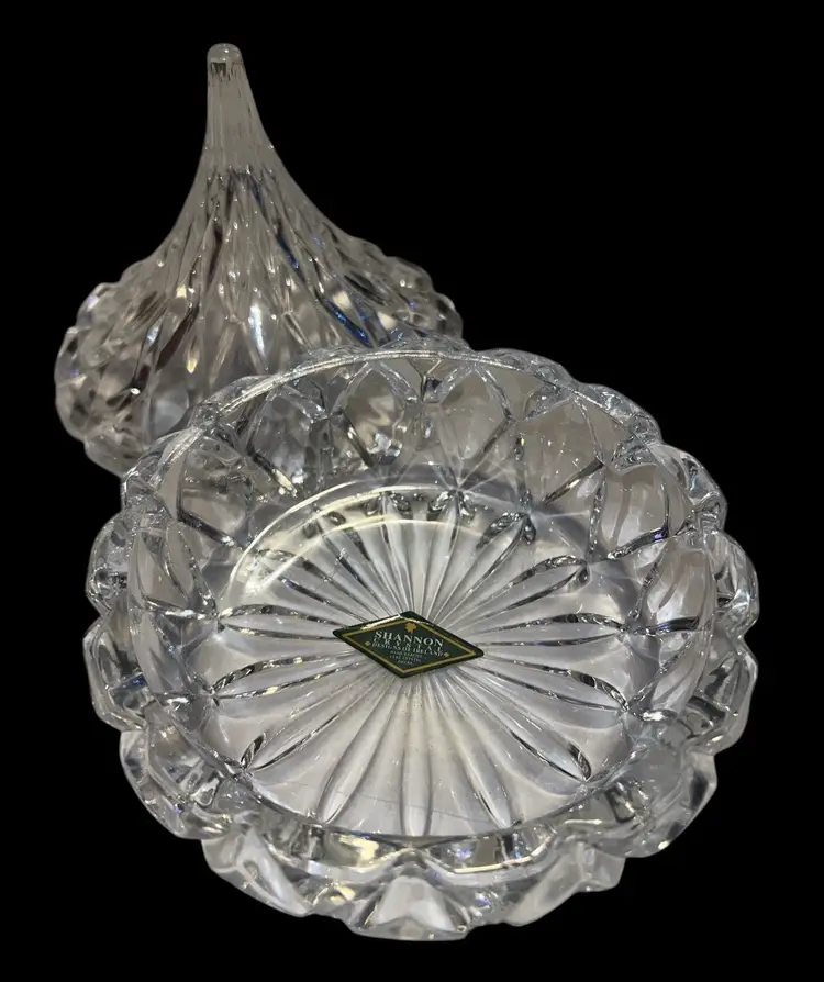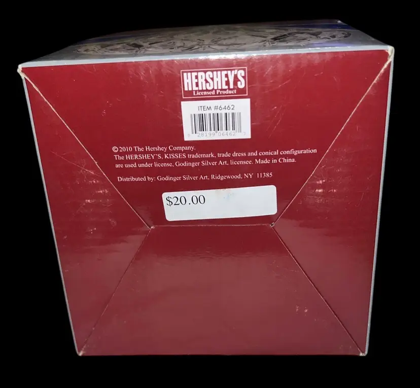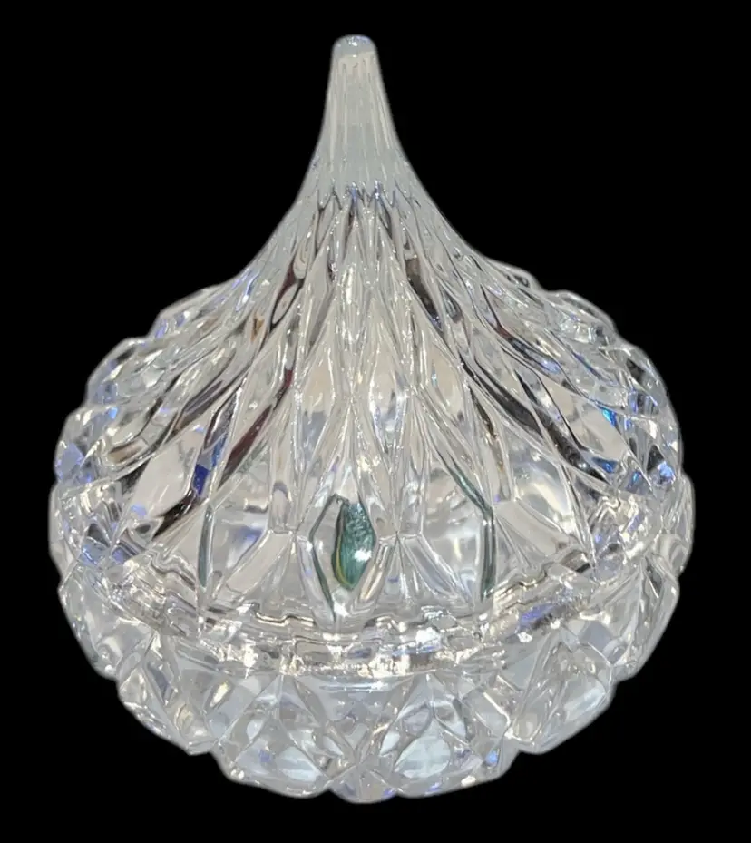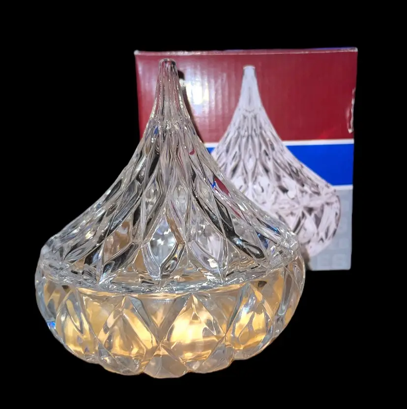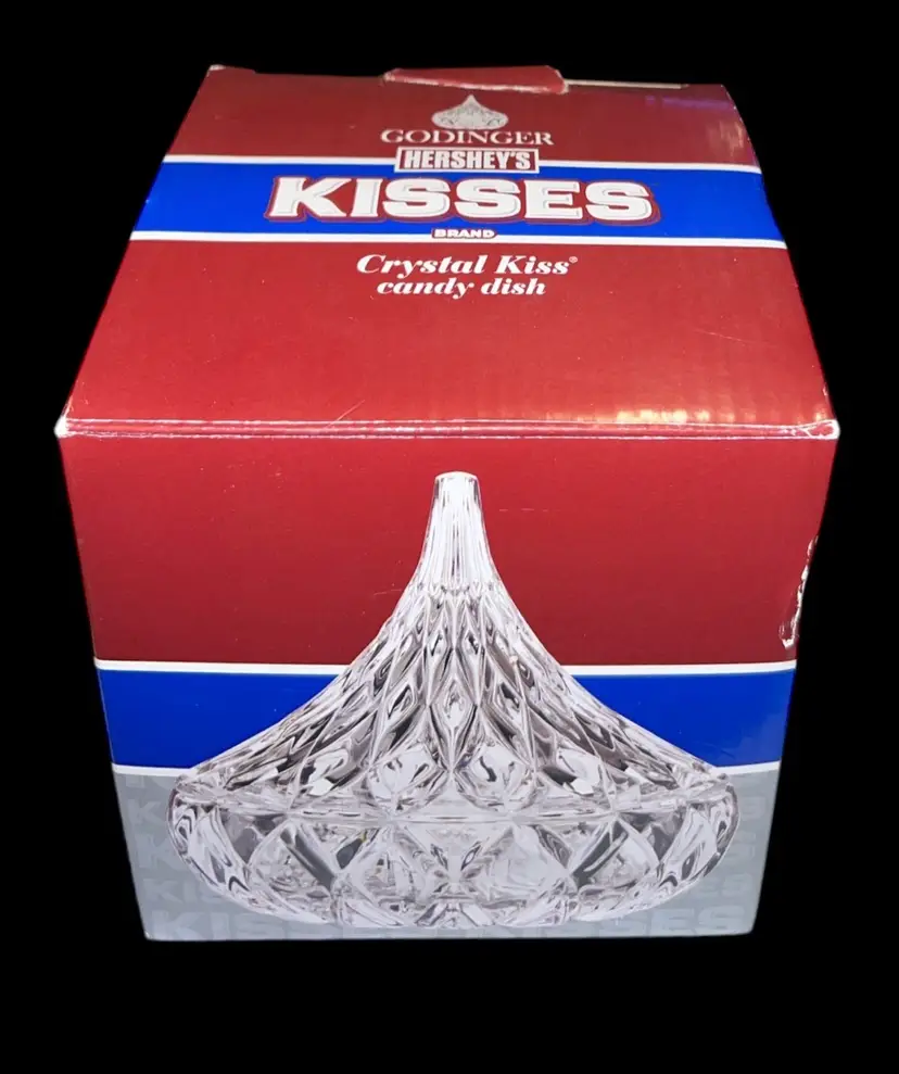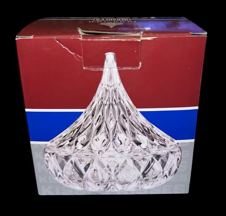 This is a vintage Godinger Crystal Famous Hersheys Kiss crystal candy dish in its original box. The dish features a diamond pattern, clear crystal color, Hershey Kiss shape, and a lid. It is dishwasher safe, weighs 1.52 pounds, and measures 5.00 inches in length, width, and height. The candy dish has a contemporary style and an American theme, making it a decorative piece for serving candy or other treats.