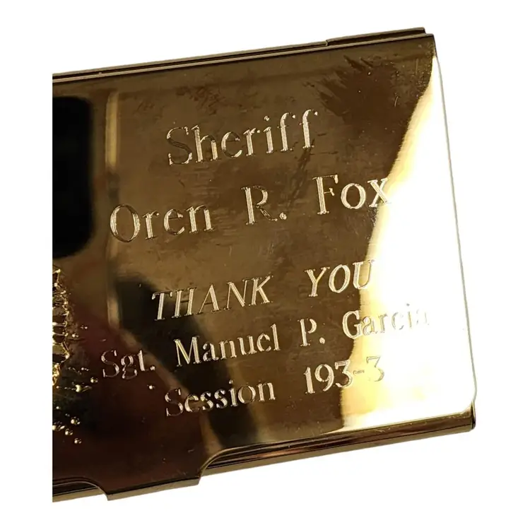 This vintage gold tone business card case is a unique and stylish accessory for any professional. With a design featuring the FBI National Academy Emblem and Sheriff Oren R Fox Imperial County name, this piece is a must-have for those in the law enforcement field. Made in the United States, it is a high-quality item that will impress any colleague or client. Ideal for holding business cards, this case is perfect for those in need of a professional and sophisticated way to present their contact information. The intricate design and sturdy construction make it a great addition to any desk or office space.