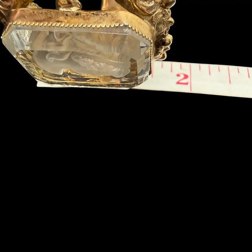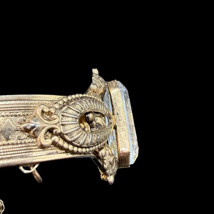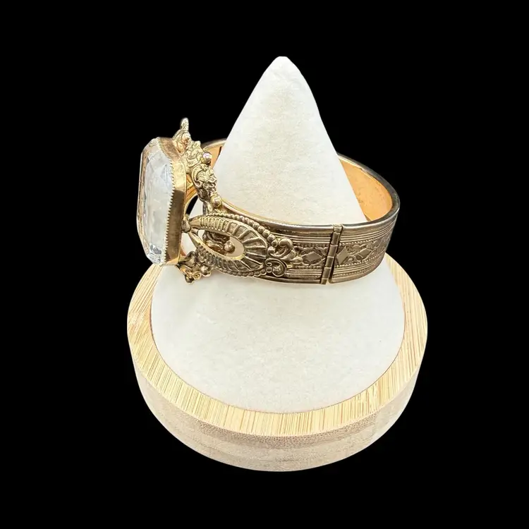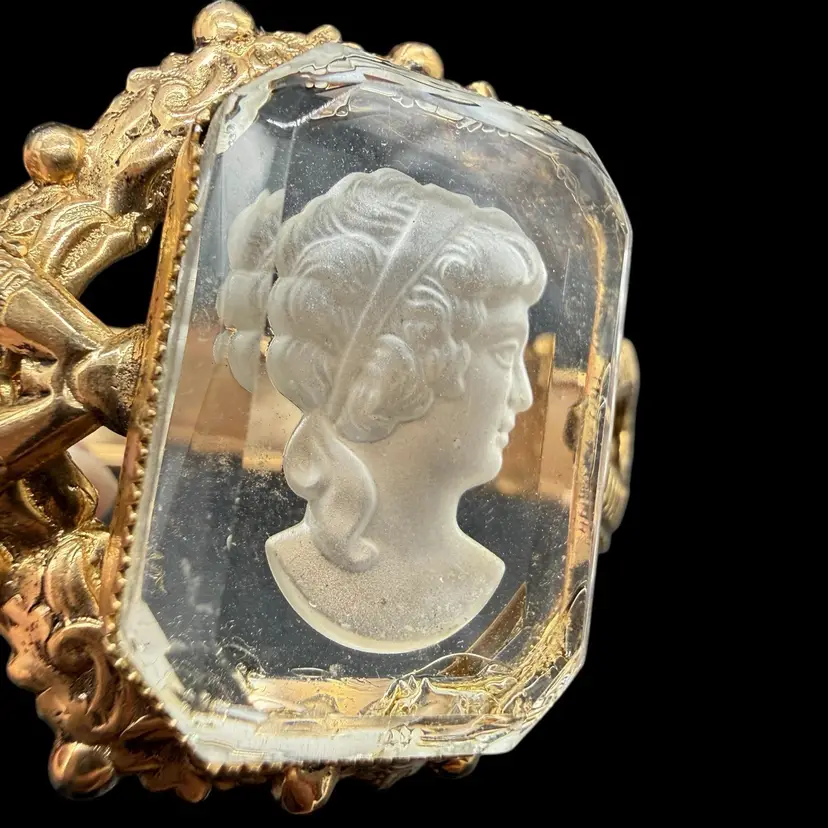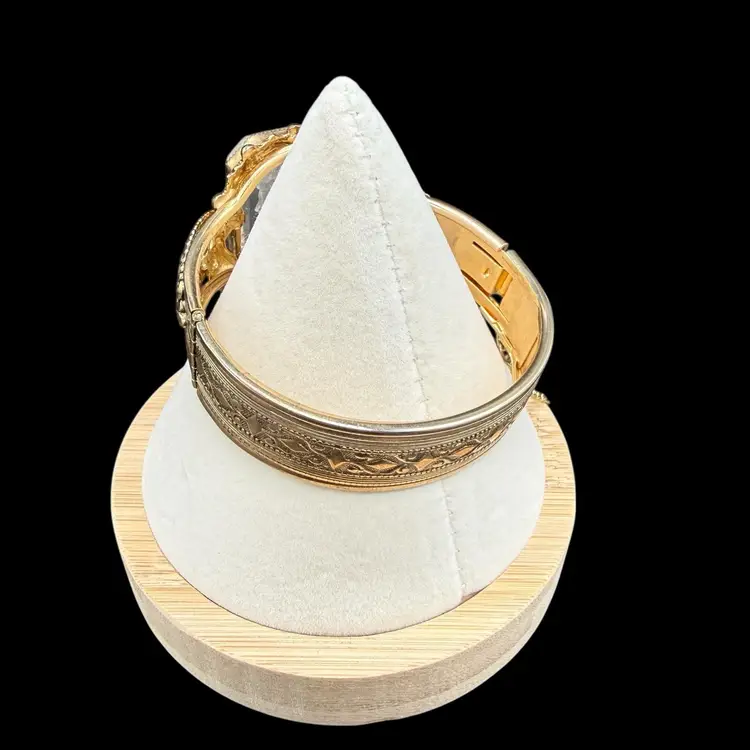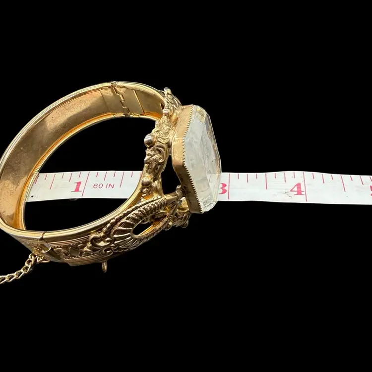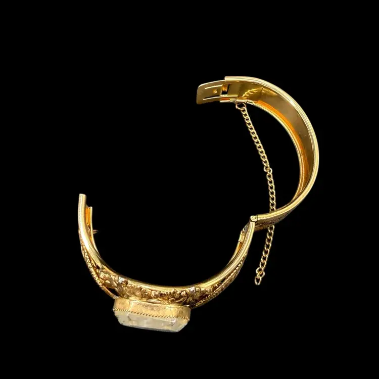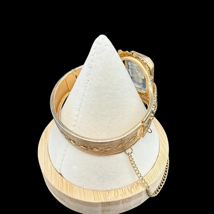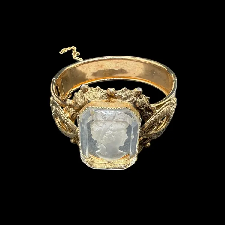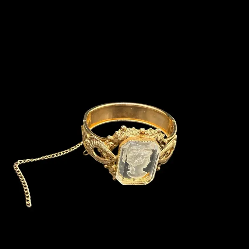 This vintage gold tone filigree bangle bracelet features an ornate design with a clear glass cameo as the main focal point. The push lock closure ensures a secure fit on the wrist, making it a stylish and elegant accessory for women. The Victorian era-inspired piece exudes a timeless glamor and classic beauty, perfect for those who appreciate vintage jewelry with a touch of Victorian revival style. Made with glass and metal materials, this bracelet is a stunning addition to any jewelry collection.