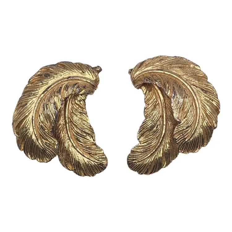 VTG Gold Tone Filigree Leaf Feather Plume Clip On Earrings Estate Costume Jewelr.