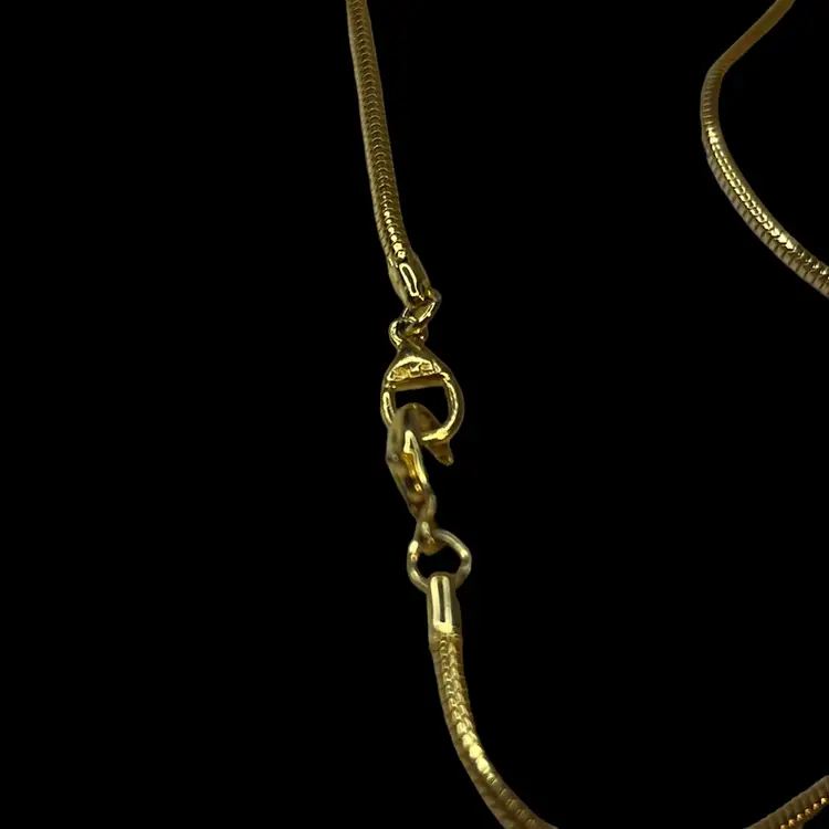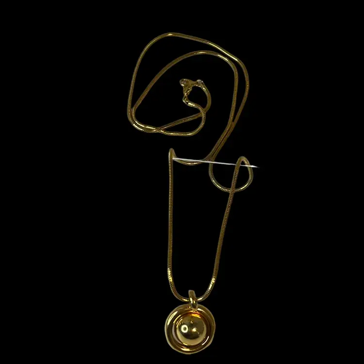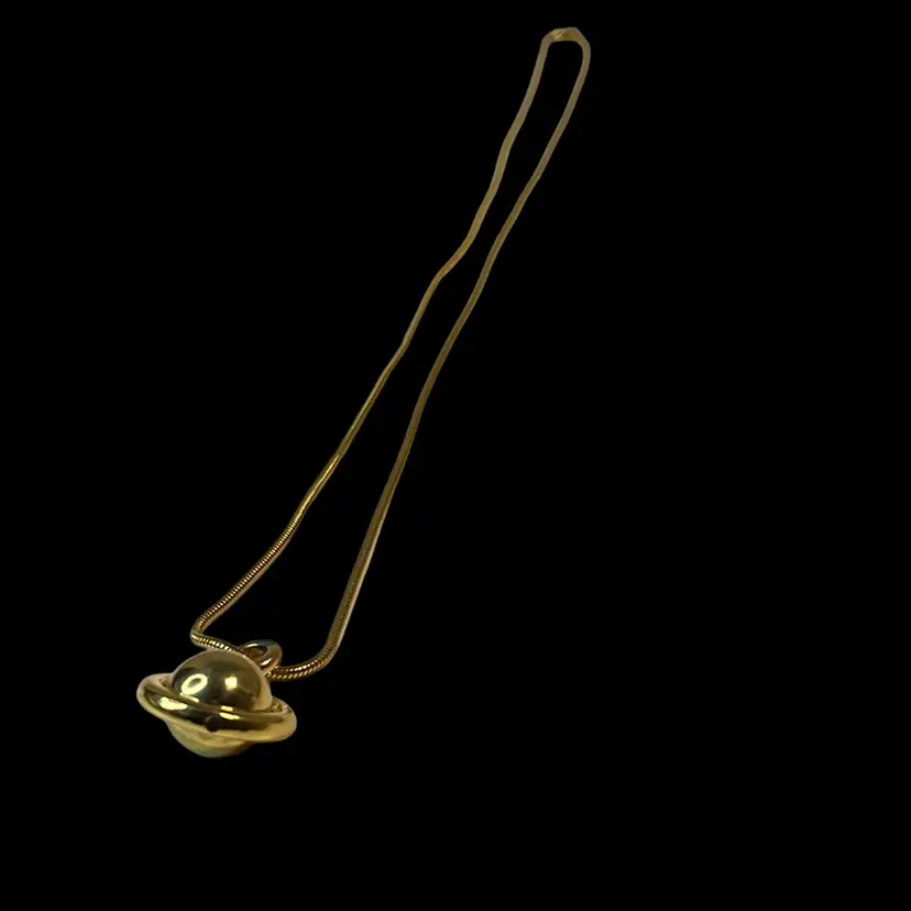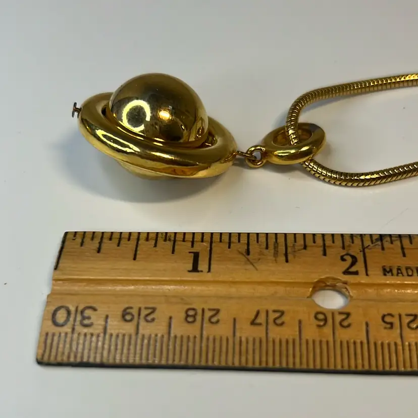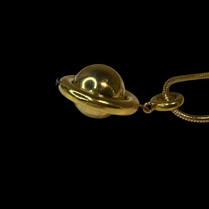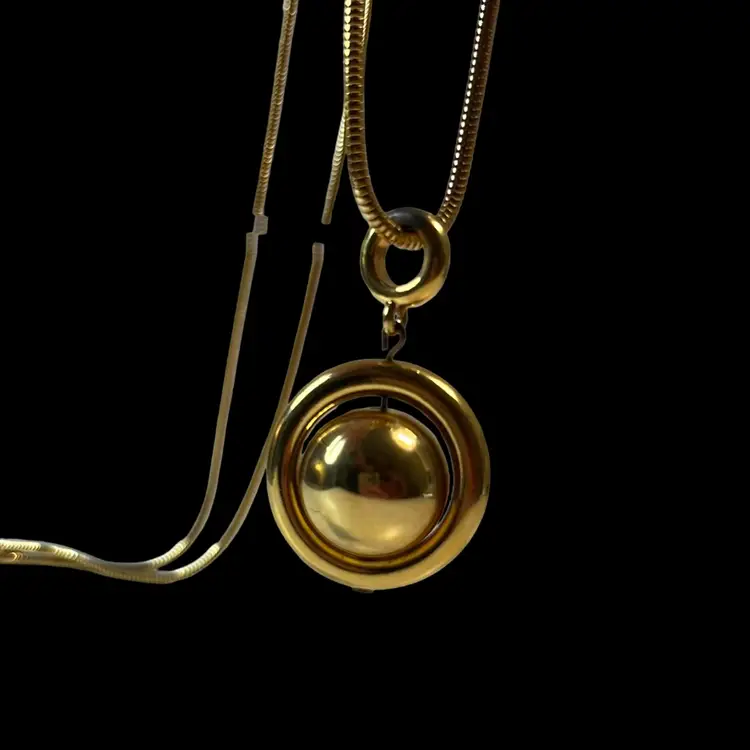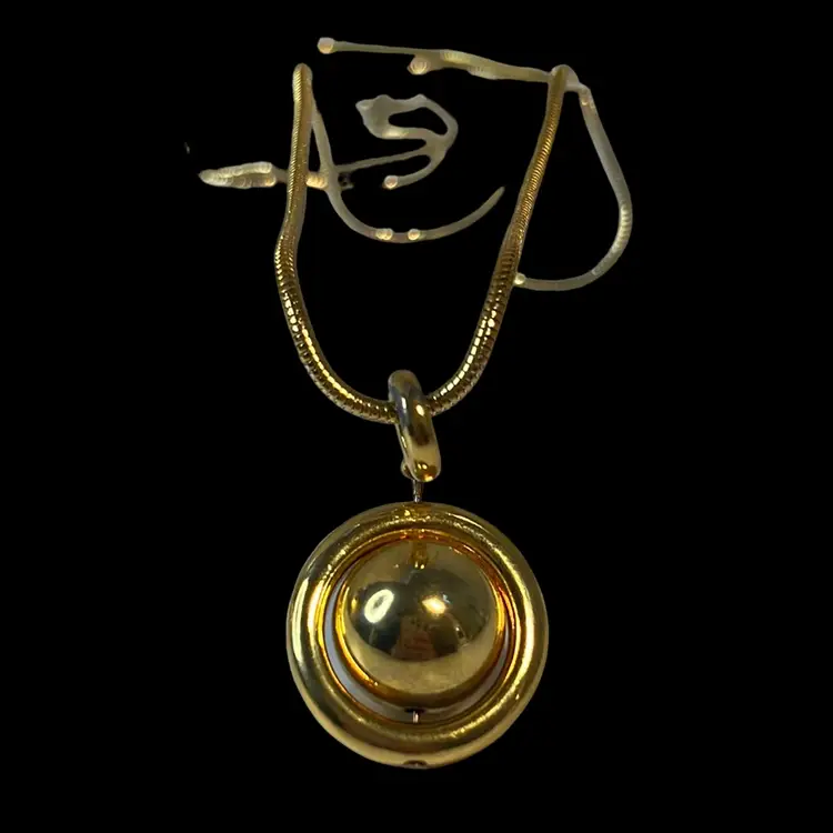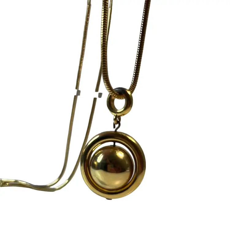 1970s great condition long, gold toned necklace with a great chain. Pendant is a floating, spinning gold ball inside a circle -“Saturn” shape.