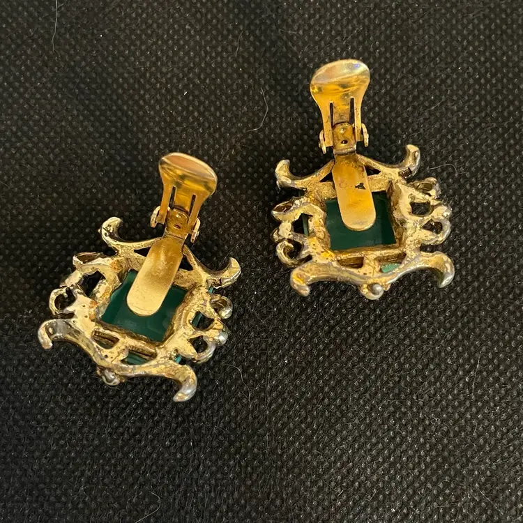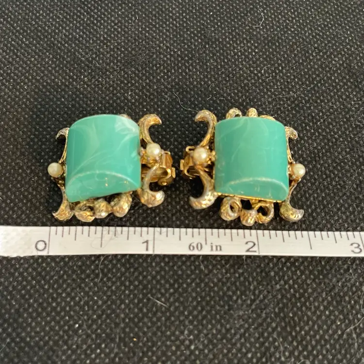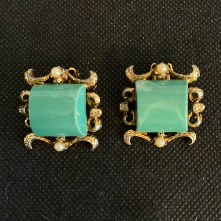 Vtg Green Lucite ClipOn Earrings Barrel Thermoset Dome Gold Oriental Pearl Givre.