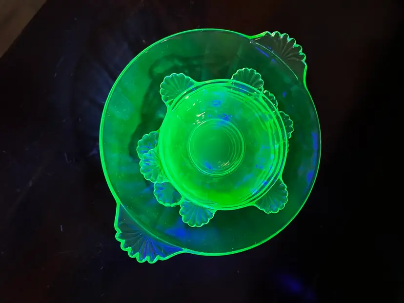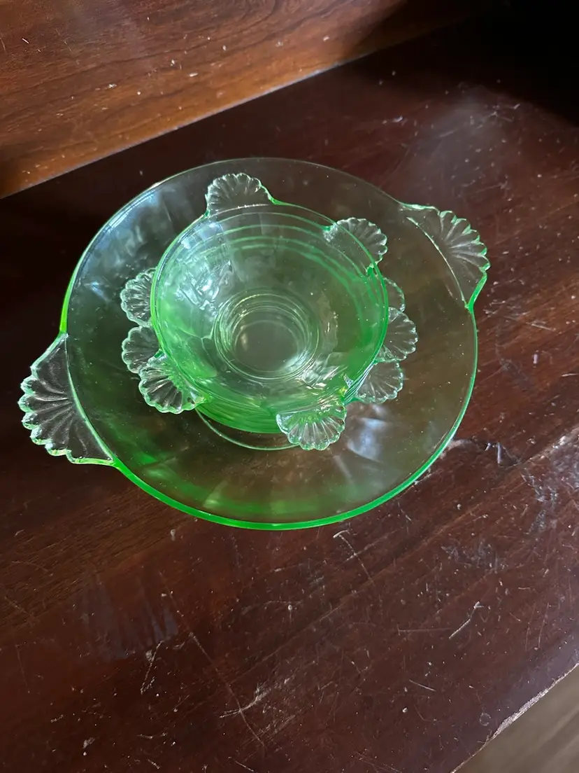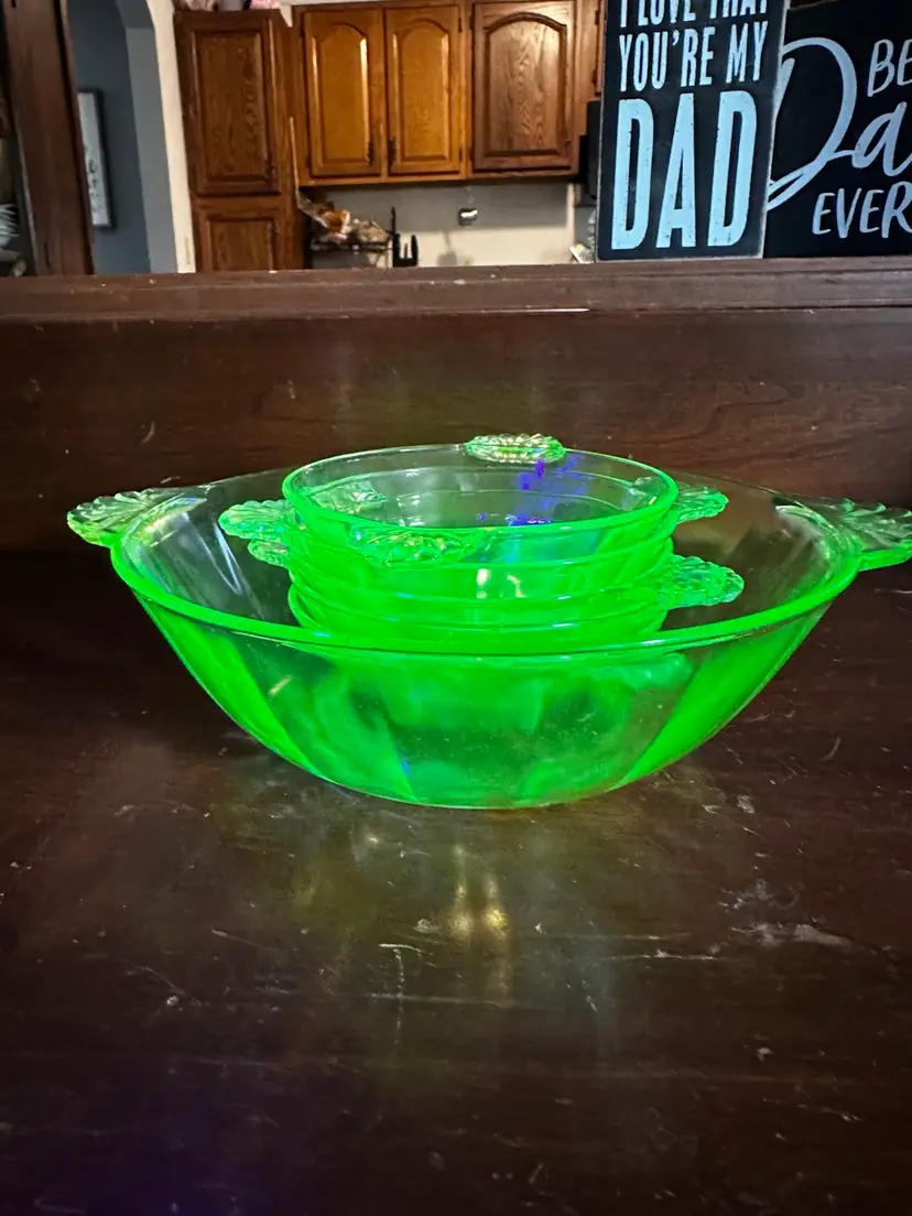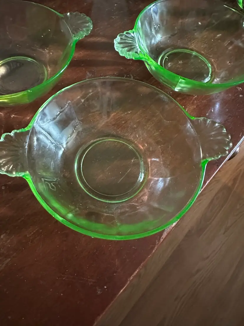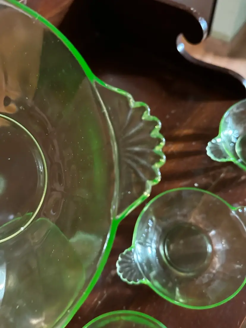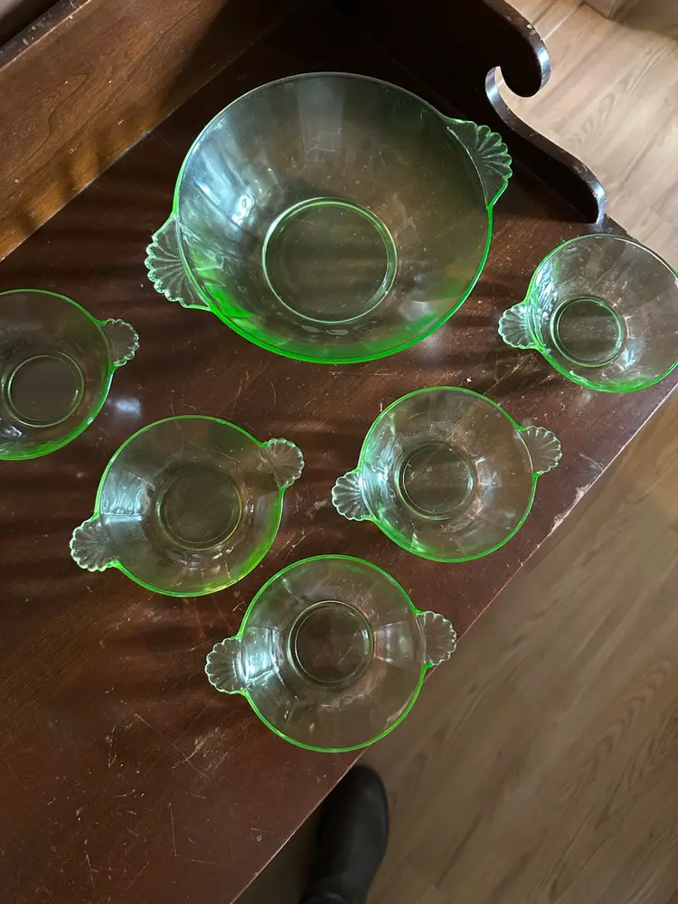UP FOR CONSIDERATION IS A VINTAGE 6 PIECE VASELINE OPTIC PANEL GLASS SERVING SET.IT COMES WITH ONE LARGE BOWL 8" DIAMETER AND 5 SMALL BOWLS 4 3/8" IN DIAMETER. THE SET IS IN NICE CONDITION FREE OF DAMAGE.