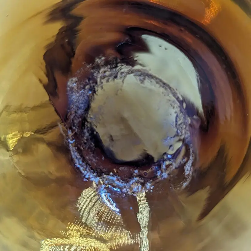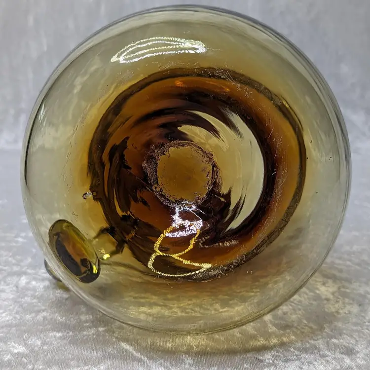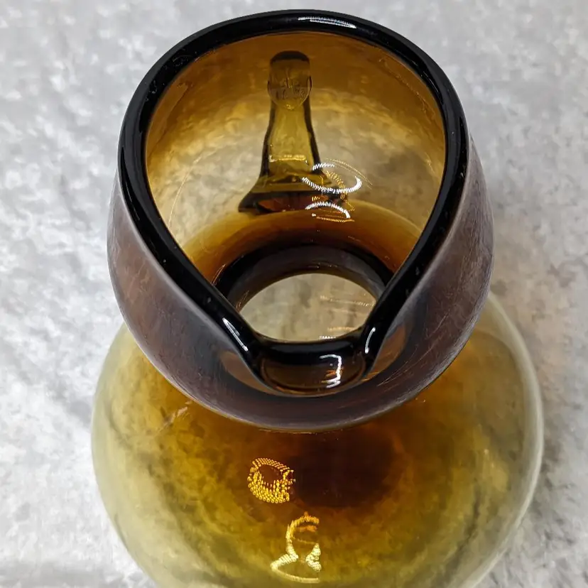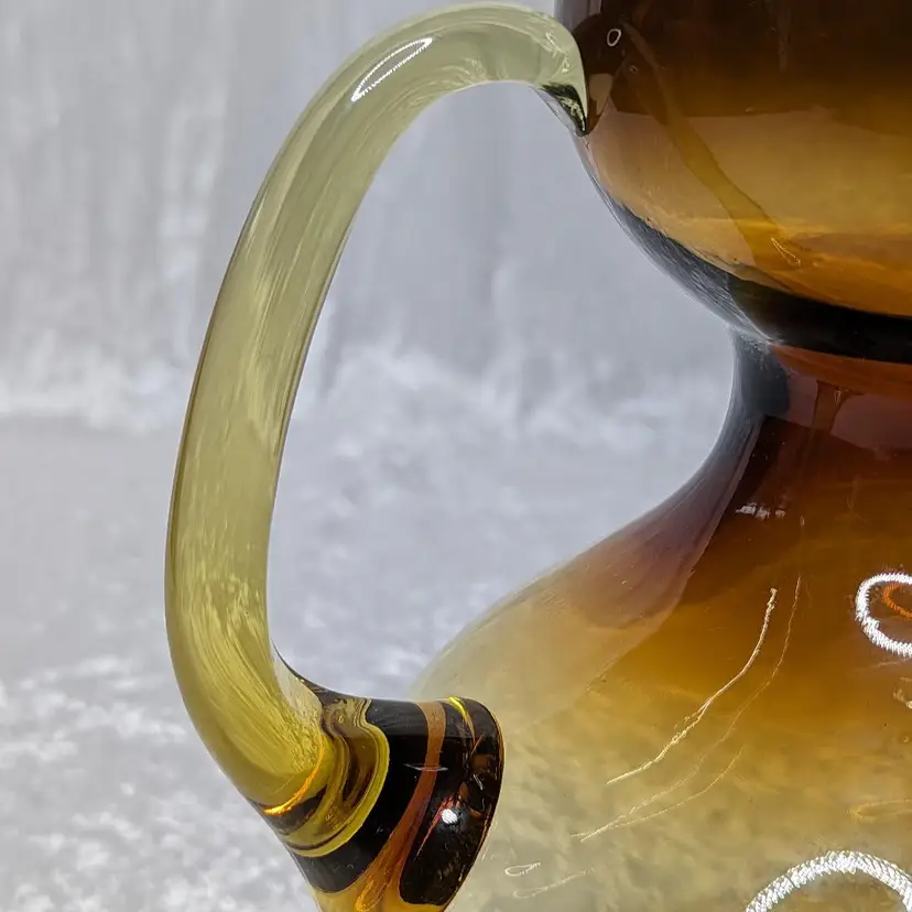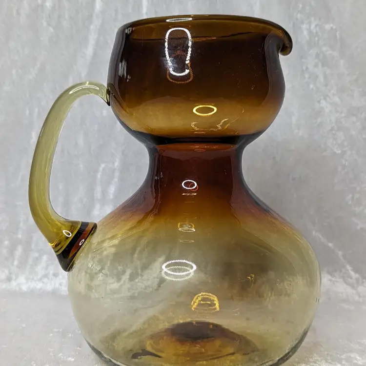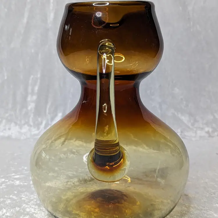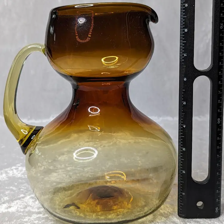 Vtg Greenwich Flint Glass Pitcher Tom Connally Design Hand blown Double Bubble Burnt Honey amber 9 1/2" tall #1171. Made between 1969 - 1972 It is about 81/2in wide hard to measure . Very heavy Very good condition No chips there is wear on the bottom of the pitcher. There is a centering mark at the bottom of the applied handle. This is a beauty!! Please check the photos for details . Comes from a smoke free home.