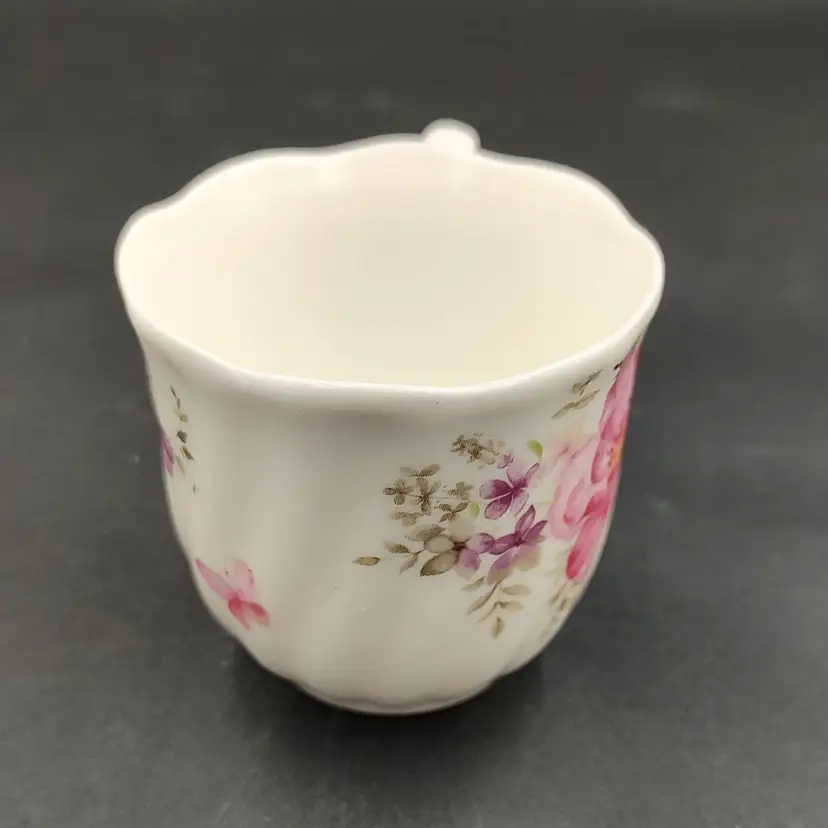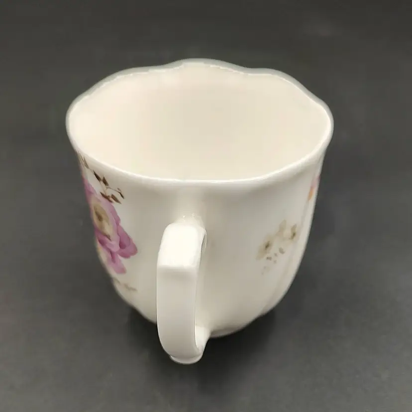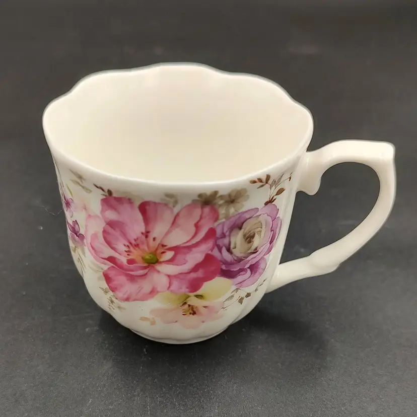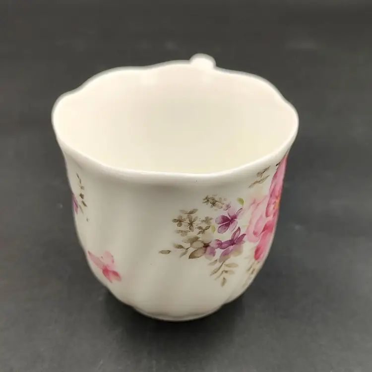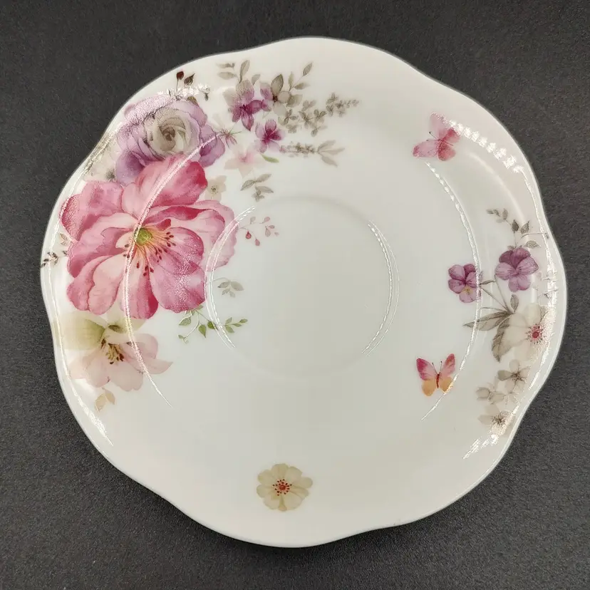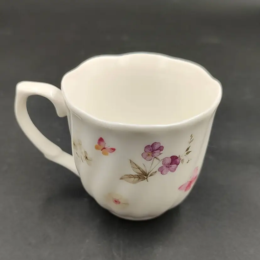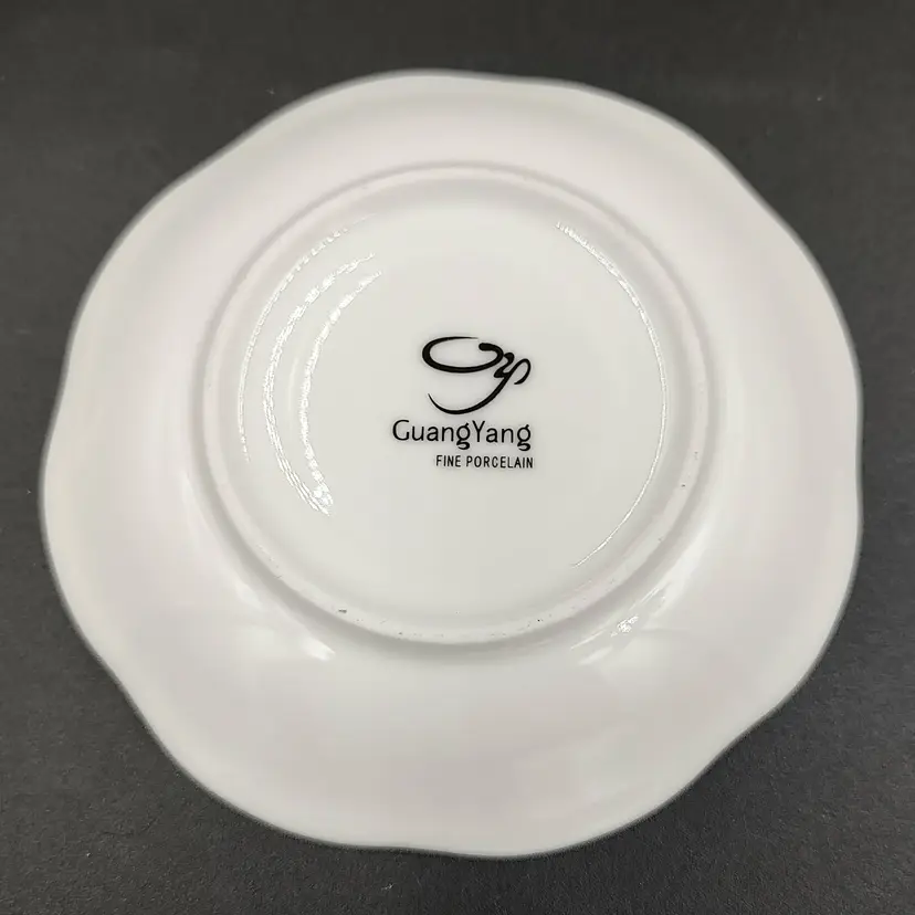 Vintage 1976 Guang Yang Fine Porcelain Demitasse Teacup and Saucer Set With Butterfly And Flower Motif. Teacup height 2" x diameter 2.5" holds 3oz. Saucer diameter 4.5". Made in China