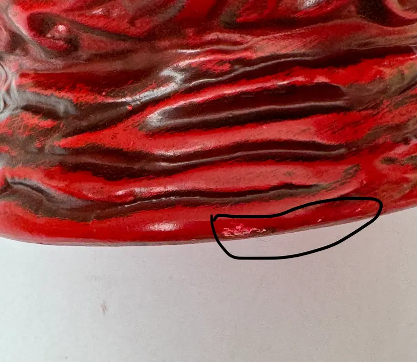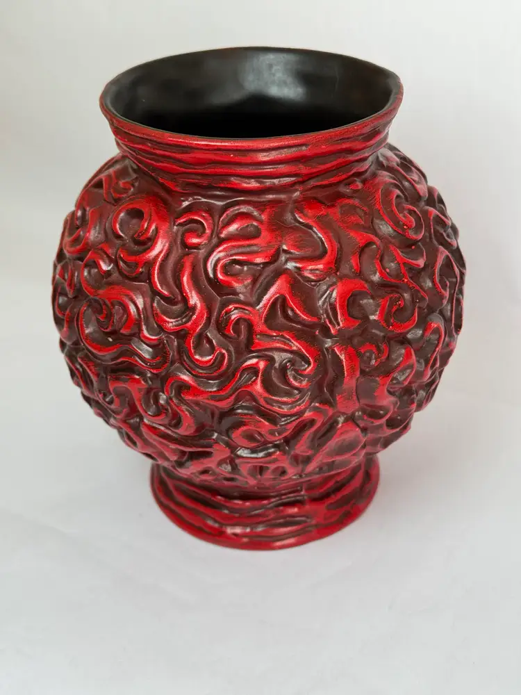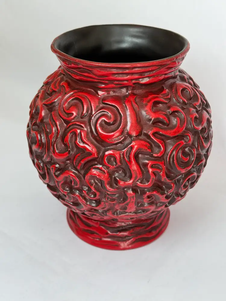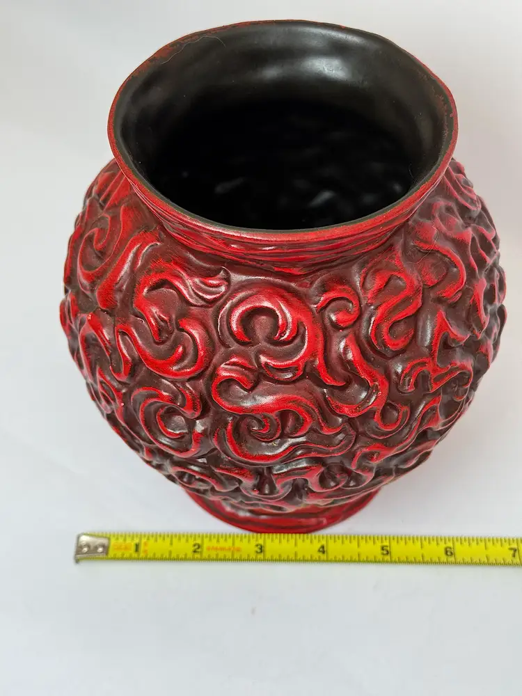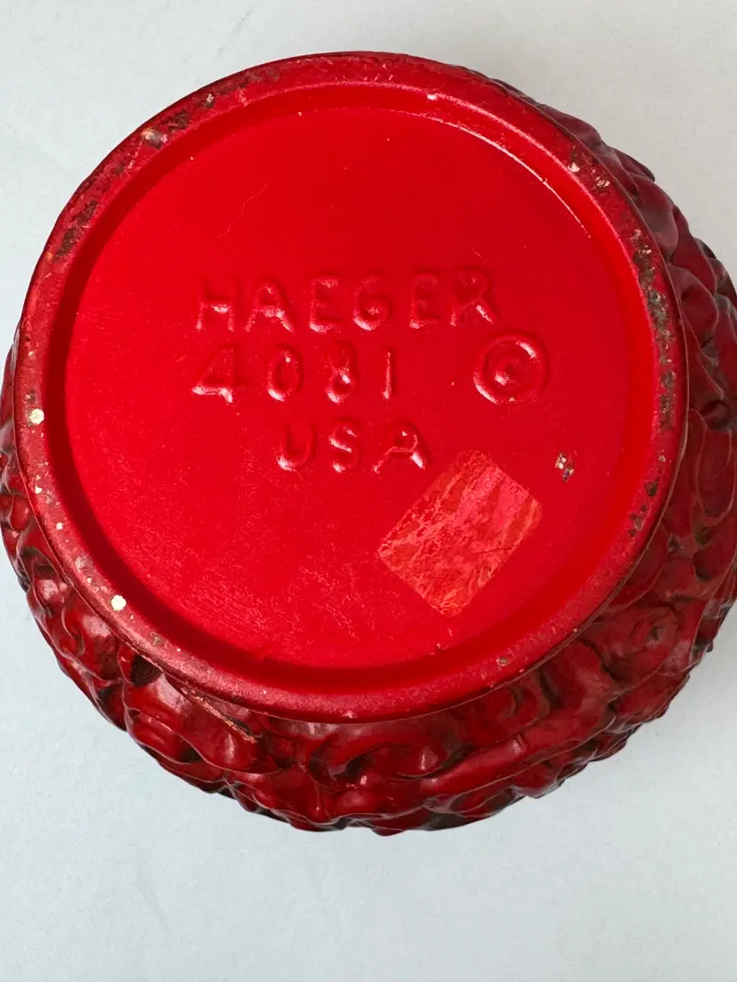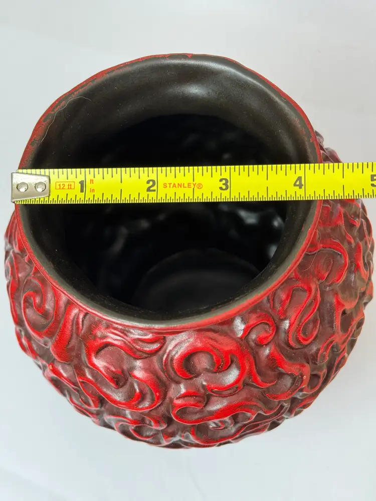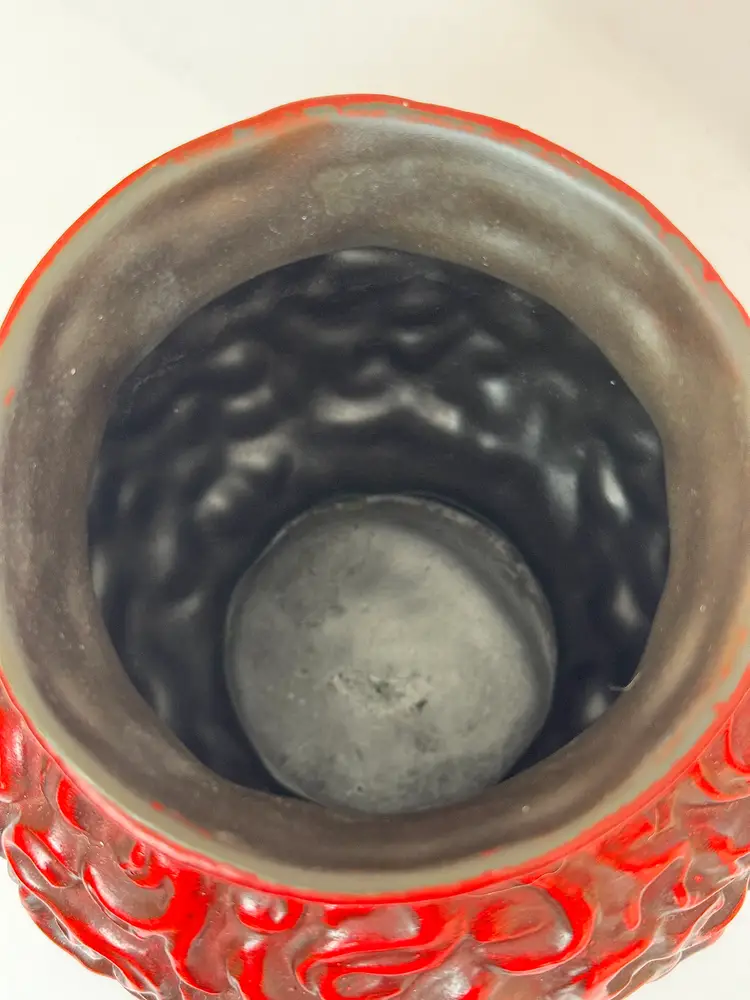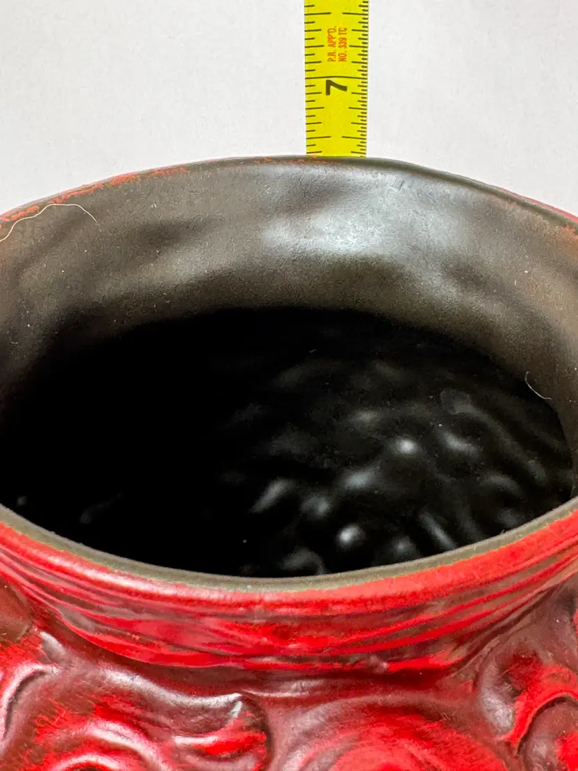 This is a Haeger Brutalist vase from the Country Spanish line. The ceramic is heavily textured in red and black. There is a small wear spot on the bottom edge and a sticker mark on the bottom. No other visible damage.