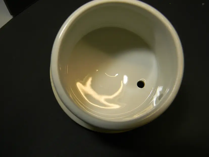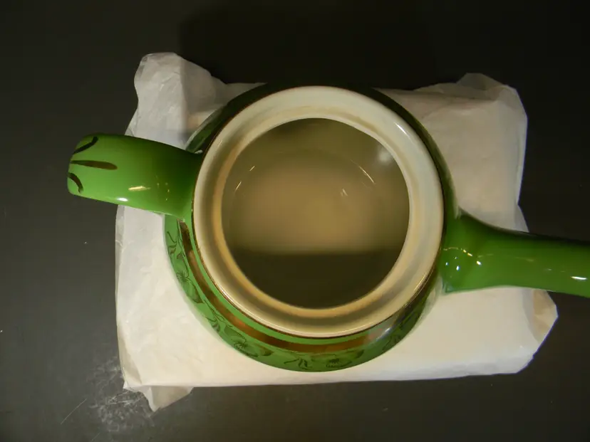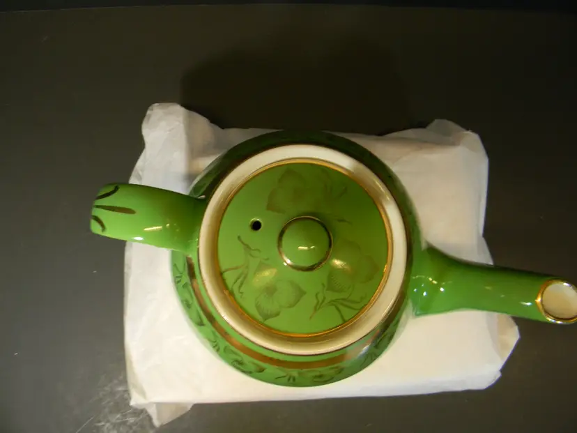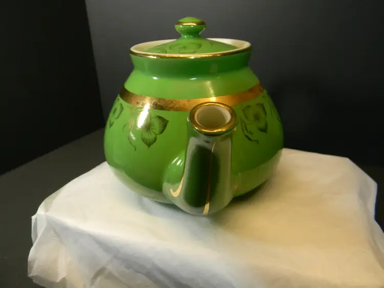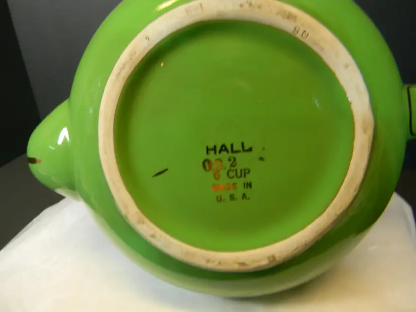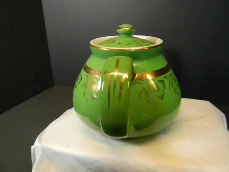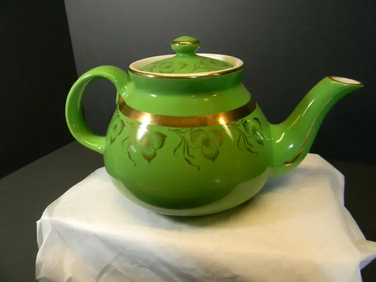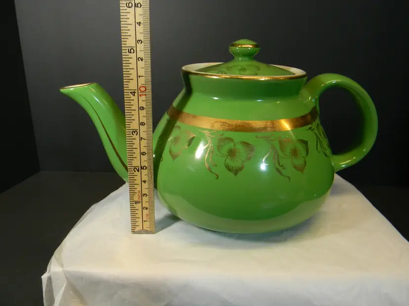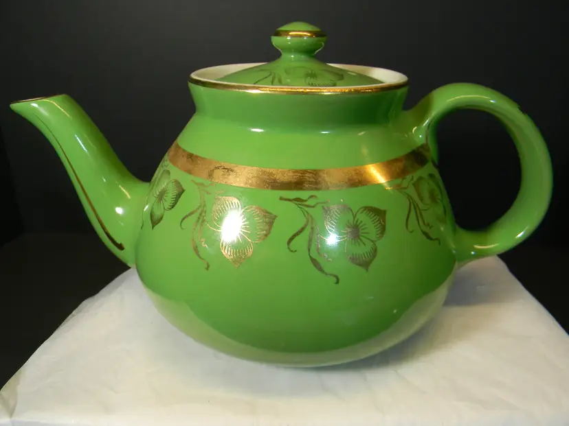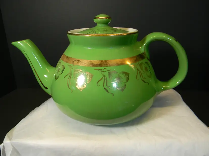 Vtg. Hall China teapot 6 cups Often gone by "Globe" shape and "Gold Decorated Line" First teapots by The Hall China Company began producing 1919 Used Condition No chips or cracks Please look at all photos before purchasing measurements are in the photos