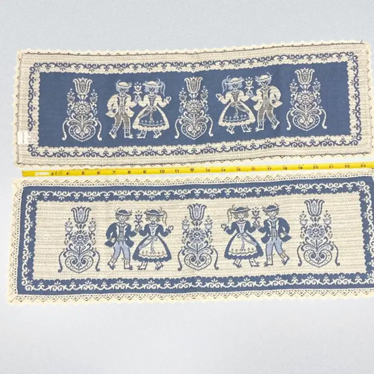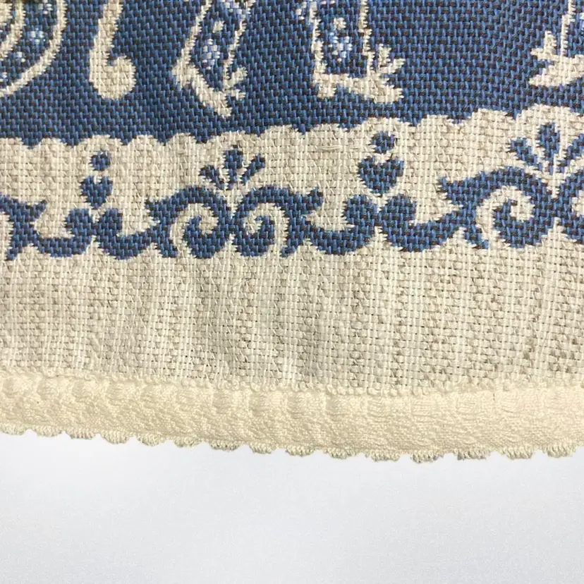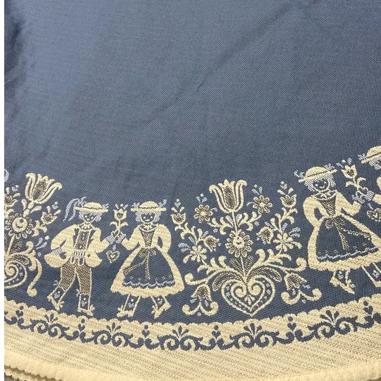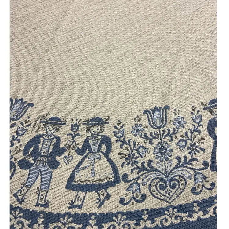 This tablecloth and two small runners are absolutely beautiful. It has blues, beige, and brown colors. Woven of Cotten and linen, it is very well made and heavy. The tablecloth is approx 78” round. The two runners are approx 24”x 8”. All are reversible and machine washable. No stains or tears. Like new.