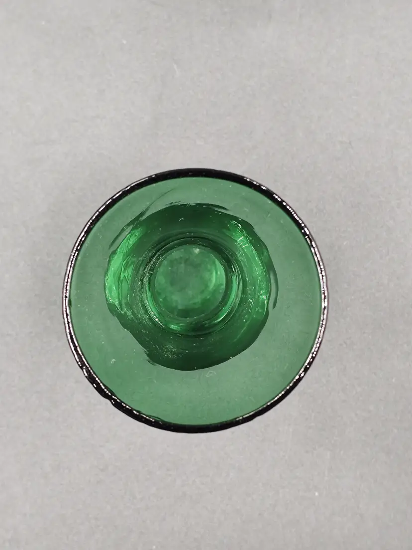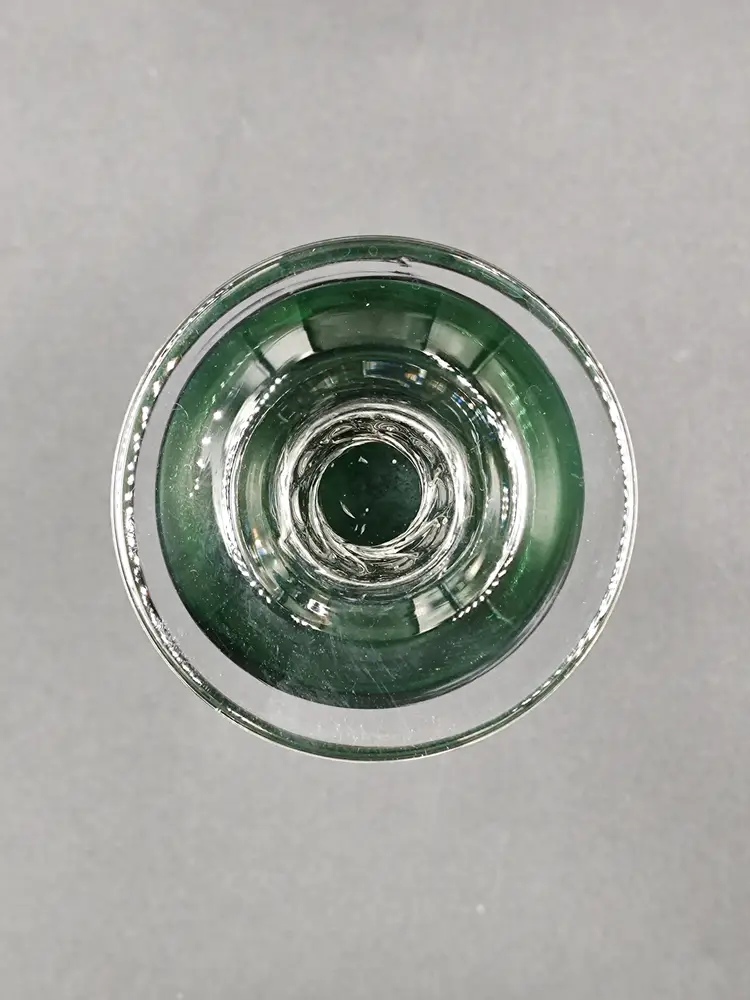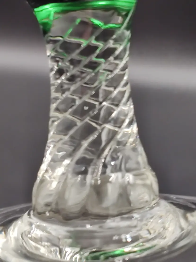 Vintage 1960's Hand Blown Green Art Glass Bud Vase With Clear Glass Swirl Stem. Height 8" x rim 2" x base 2.5".