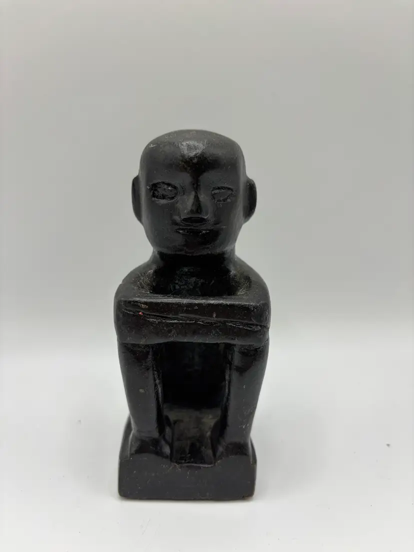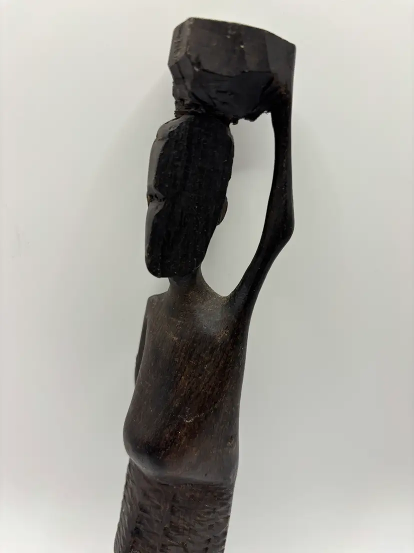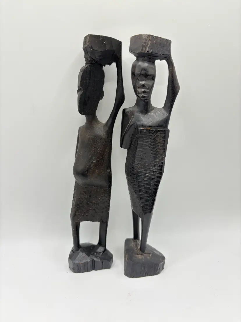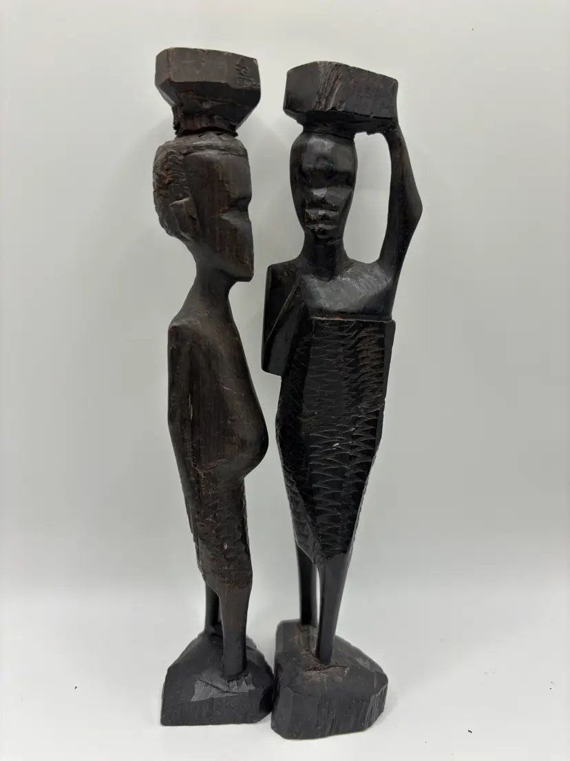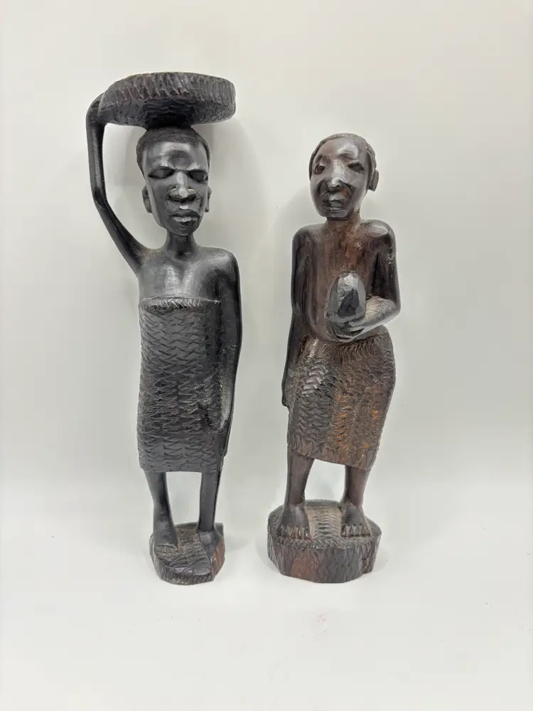 4 handcarved african figurines in ebony wood. One male has only 1/2 of his head even though it does not look broken so I am not sure if it is intentional (see photos). 2 Males & 2 females. Also included is a Bulul hand carved wood figurine which I believe is from the Phillipines.