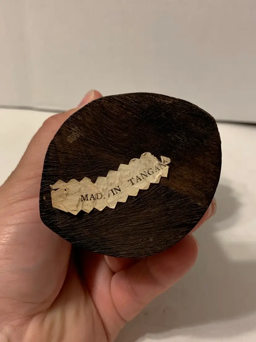 Great piece. 8.5” tall. There are a few minor splits in the wood. No major cracks. Original sticker remnant on base.