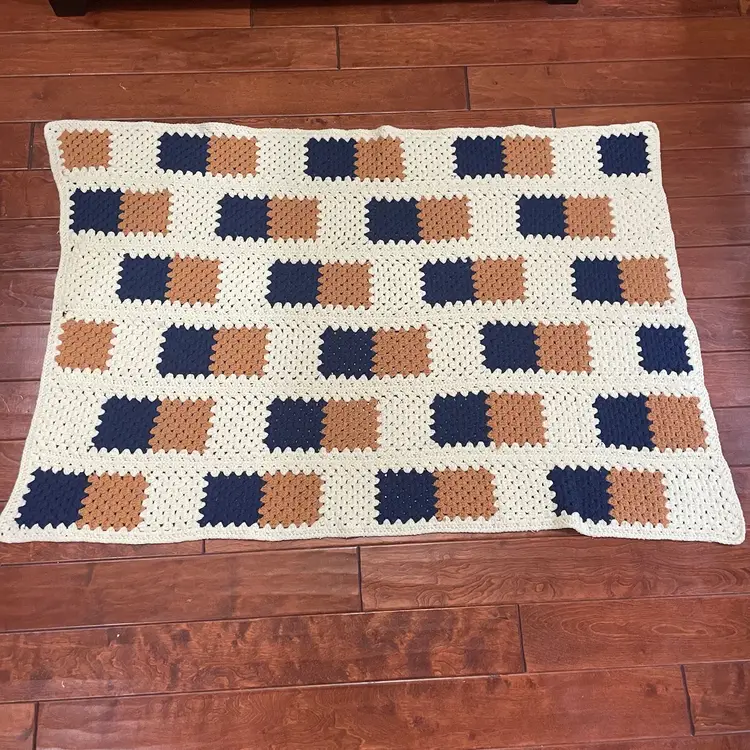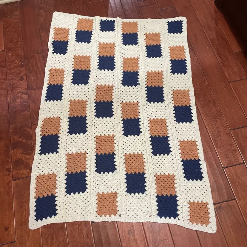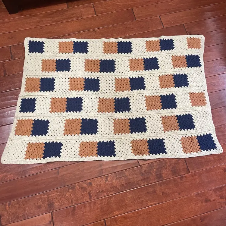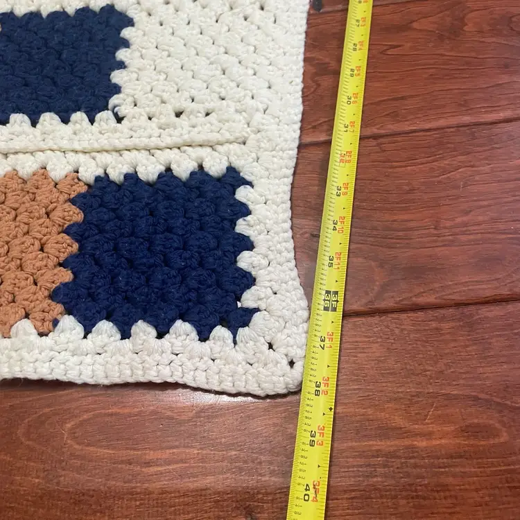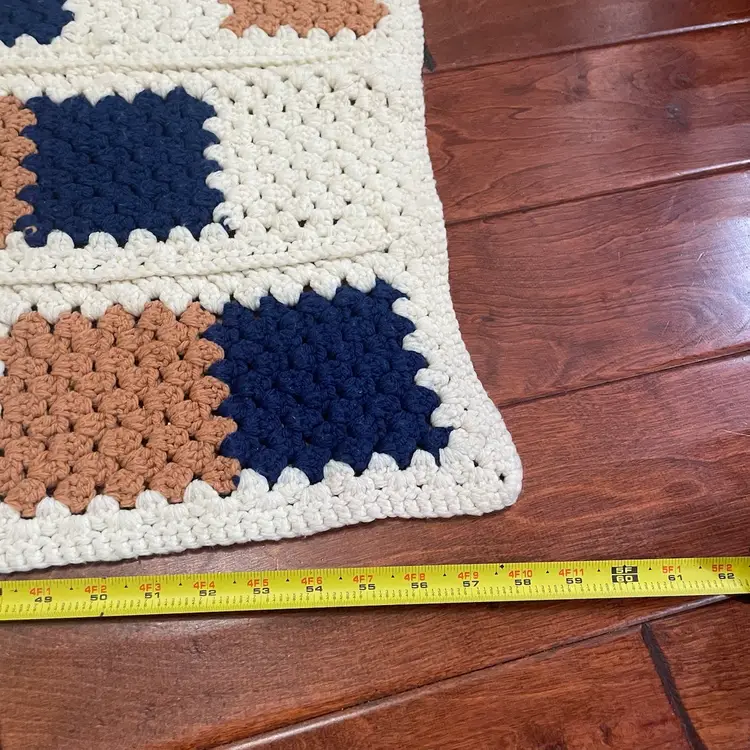 This vintage hand crochet reversible Afghan blanket features a geometric pattern in a multicolor design, measuring 58” in length and 38” in width. Handmade with a retro style, this large rectangular sofa throw is perfect for various rooms such as the bedroom, study, basement, or den. The novelty-themed Afghan adds a unique touch to any space with its non-standard size and eye-catching colors, making it a cozy and decorative addition to any home.