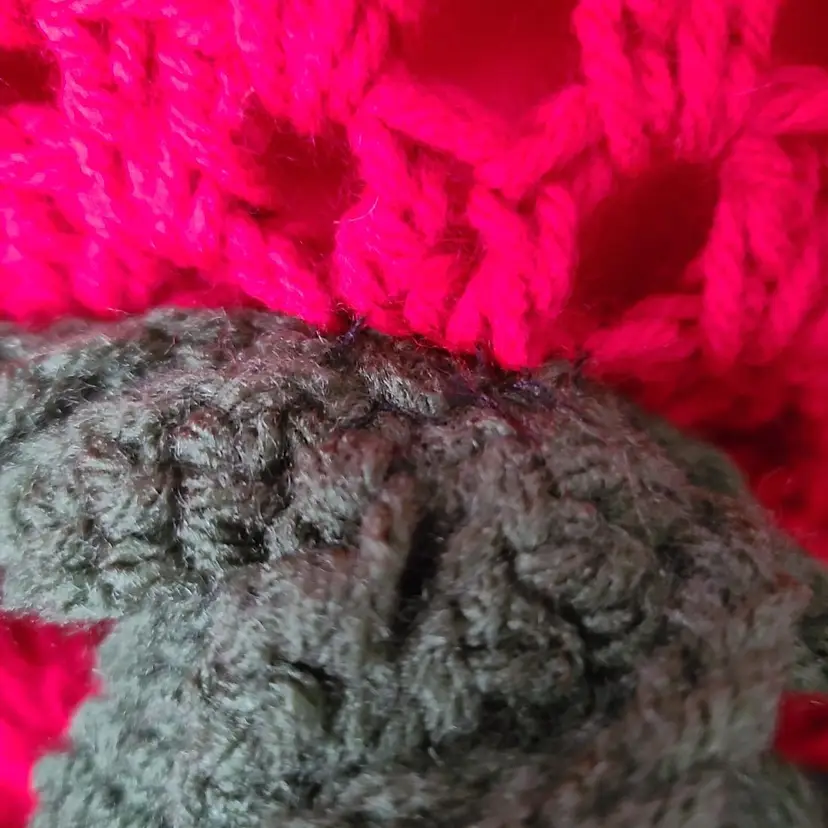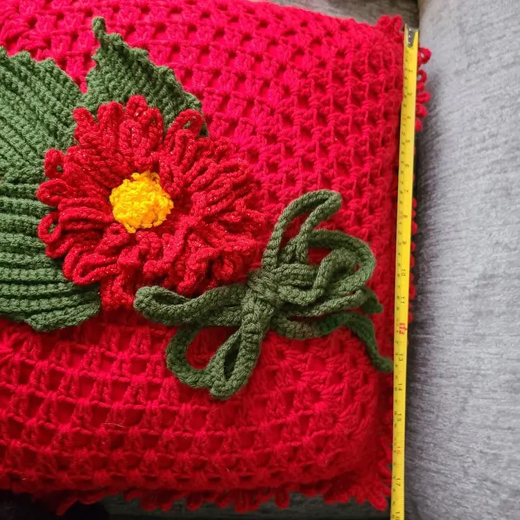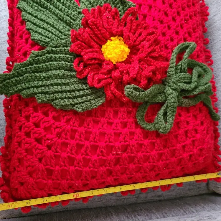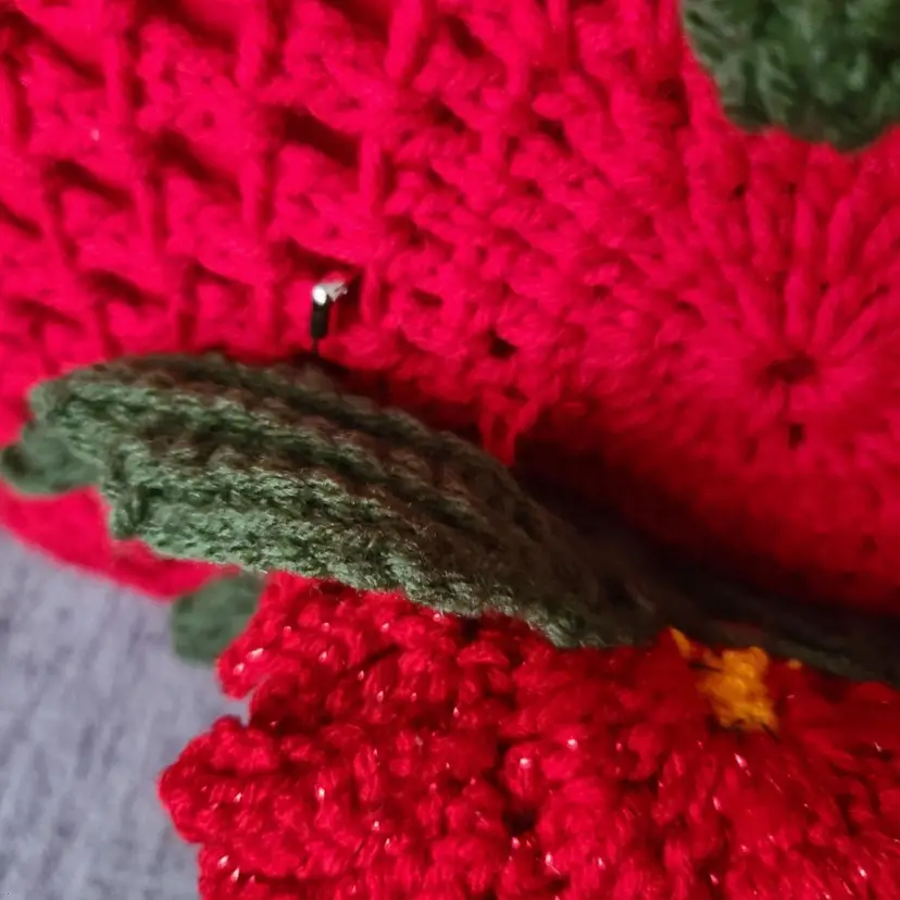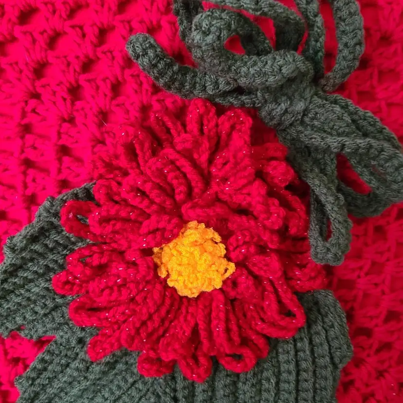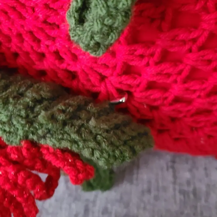 Beautiful hand crocheted Red & Green with Flower and leaves. Flower is fastened with safety pin - Green Leaf is attached shown in photos