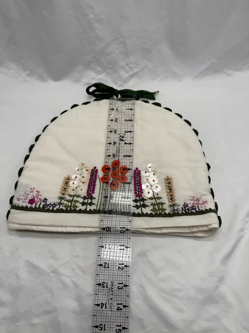 Vintage hand made, hand embroidered tea cozy. This cozy has beautiful flowers and mother of pearl buttons as accents. It is in excellent condition. Shows no signs of wear, no stains, no discoloration. See pictures for measurements.