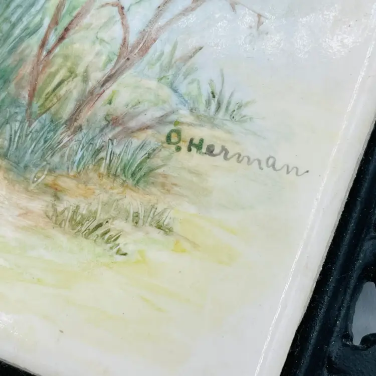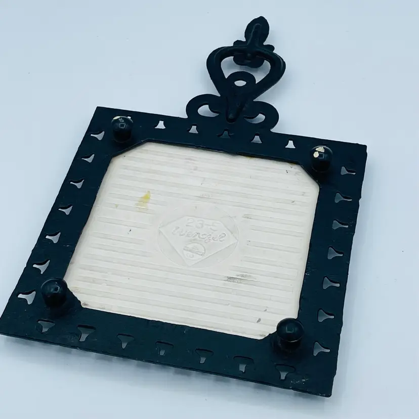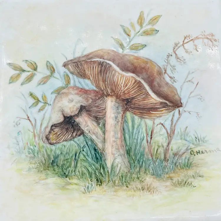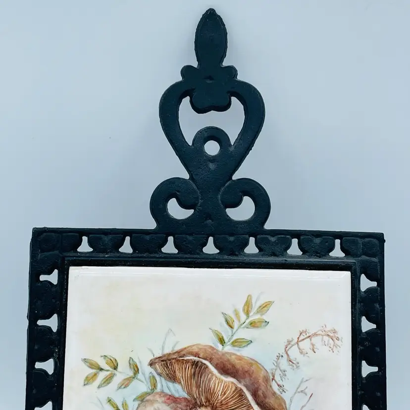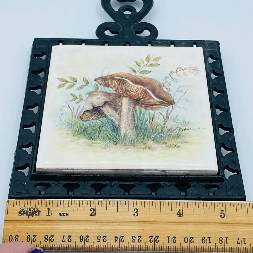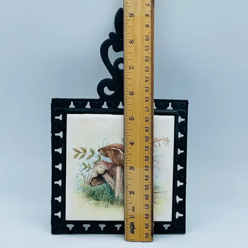 Nicely painted mushroom in grassy field on porcelain tile- framed into a trivet. Functional use or hang as wall decor. Artist was grandmother of our twins childhood friend: D. Herman