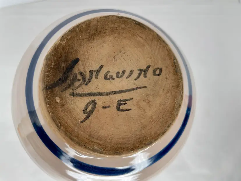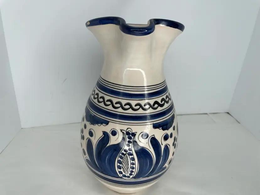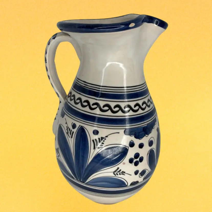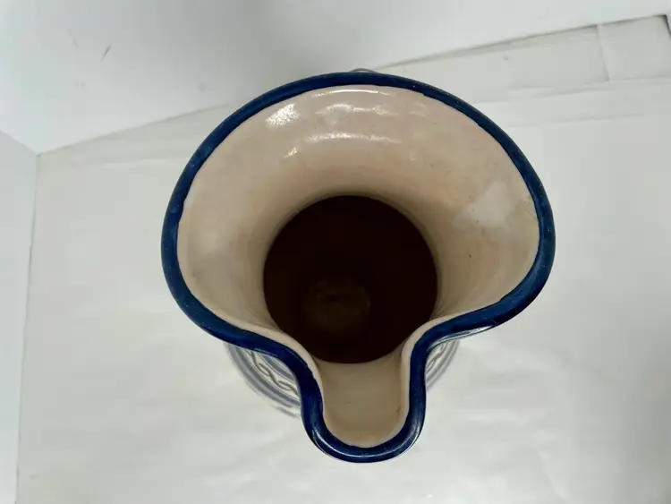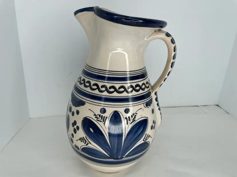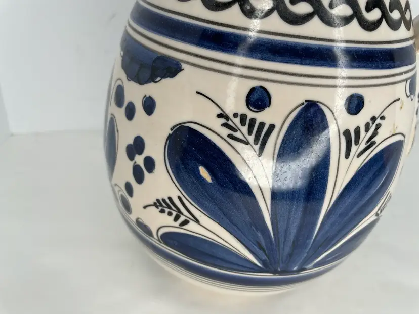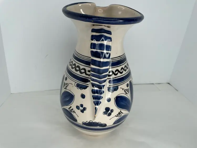This is a vintage hand-painted pottery pitcher made by Pablo Sanguino in Toledo, Spain. The pitcher has an all-over blue and white pattern with flower themes and is made of clay and ceramic materials. It has a glossy finish and is 10 inches tall with a base width of 2.75 inches. The pitcher is an original and has a backstamp painted on it. It is a folk art style piece with art pottery production techniques and is a handmade item. The pitcher should be hand washed only.