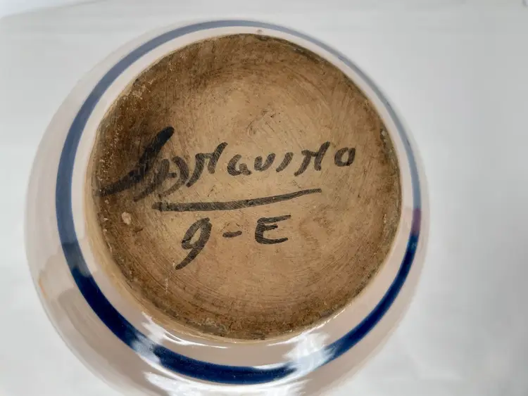 Wear/missing glaze on rim. Small chip on base of handle. Production flaw on one of blue petals is glazed over clear. Discoloration. Please review pictures closely, and msg me with any questions. Check out my other listings for more unique vintage items. Thanks for looking!