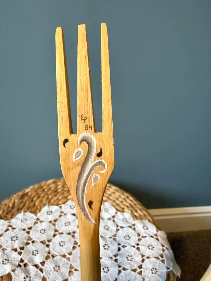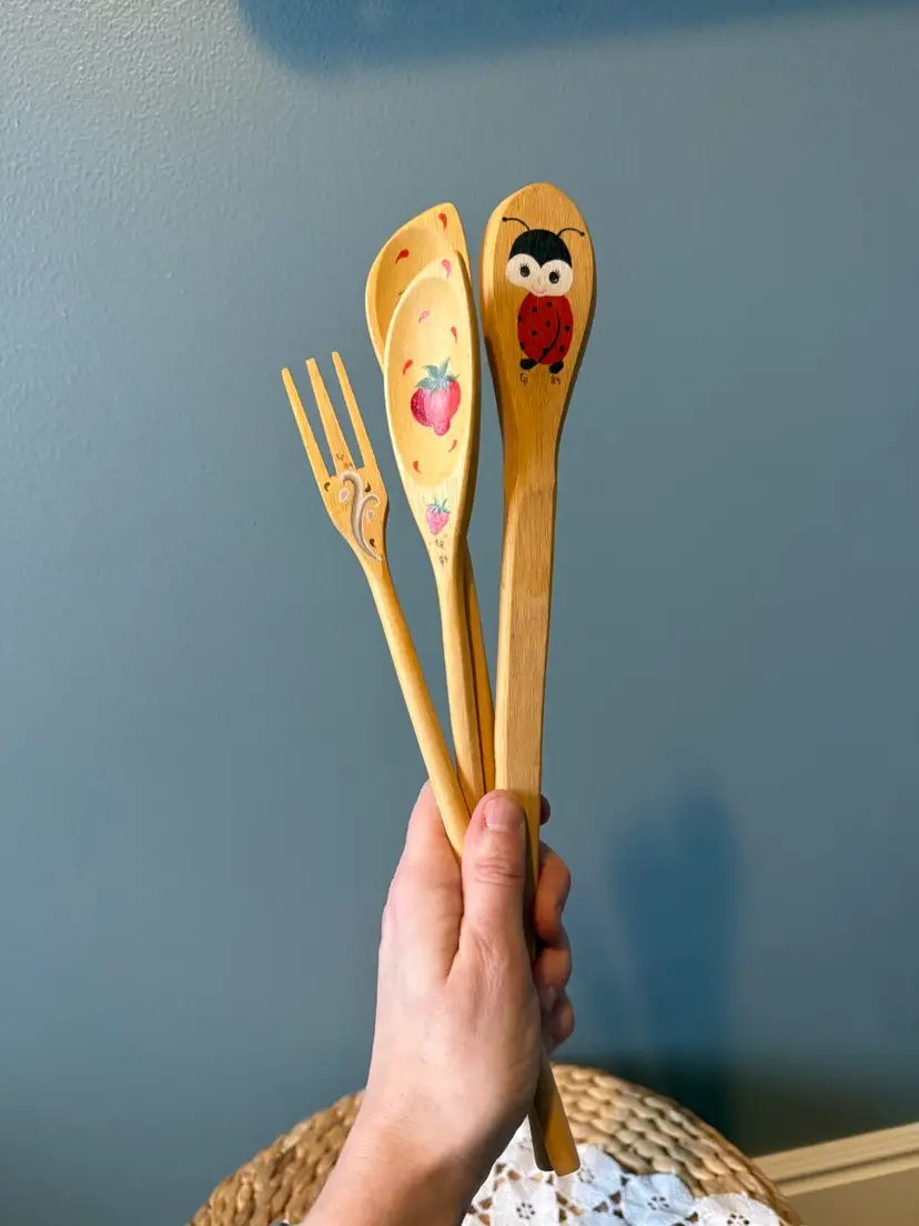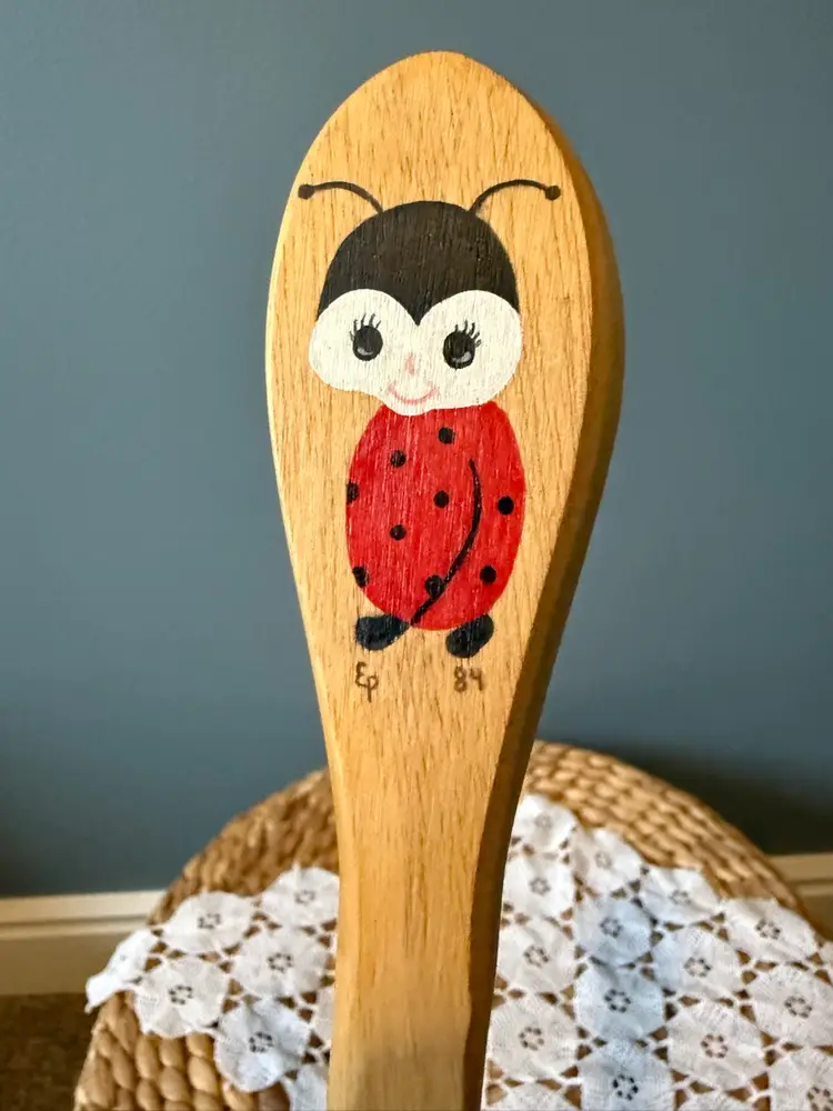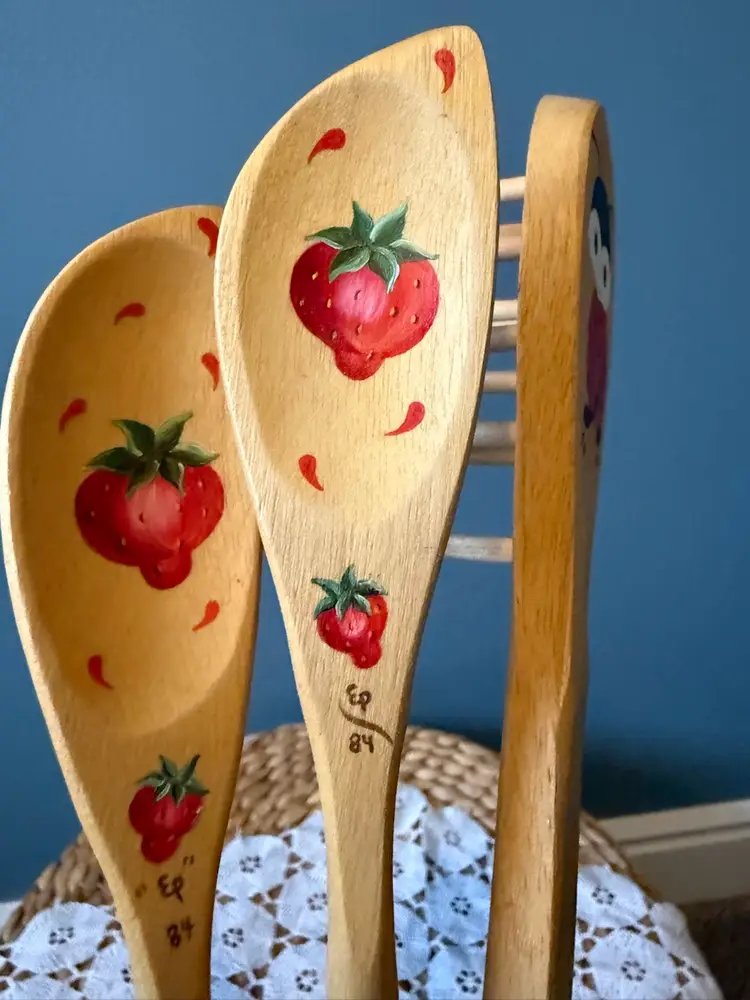 Charming vintage hand-painted wooden spoon set featuring whimsical ladybug and strawberry designs. This set includes 4 coordinating wooden utensils, each individually painted and signed “EP ’84,” making them a sweet example of 1980s folk art craftsmanship.
