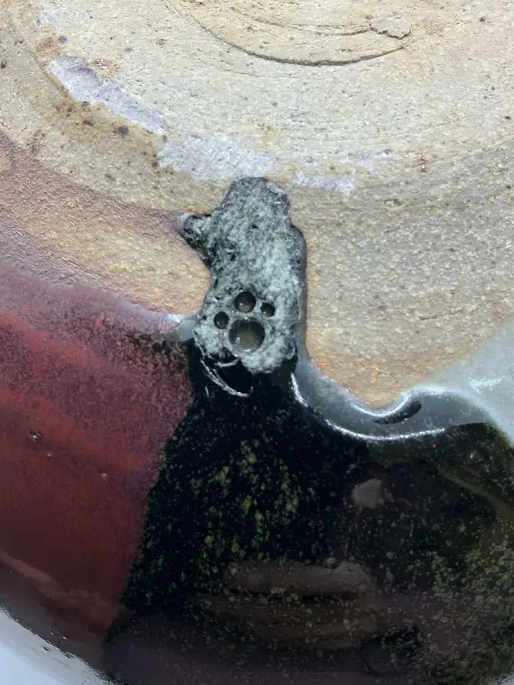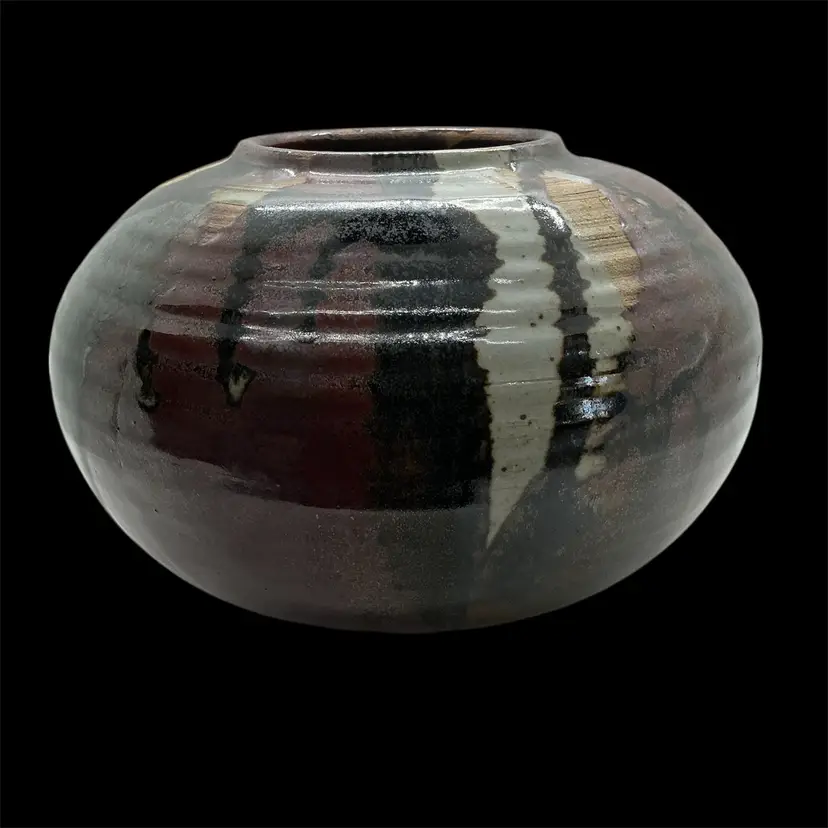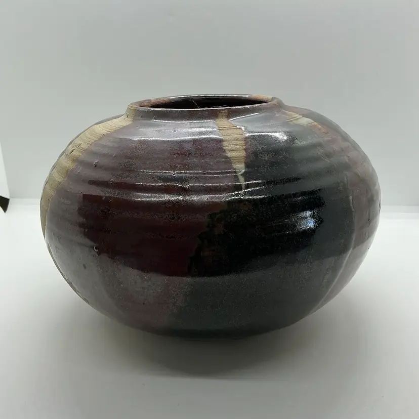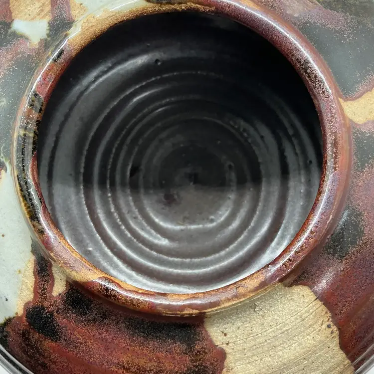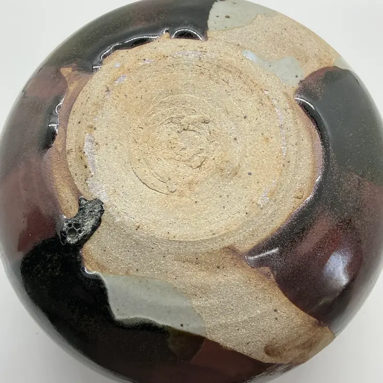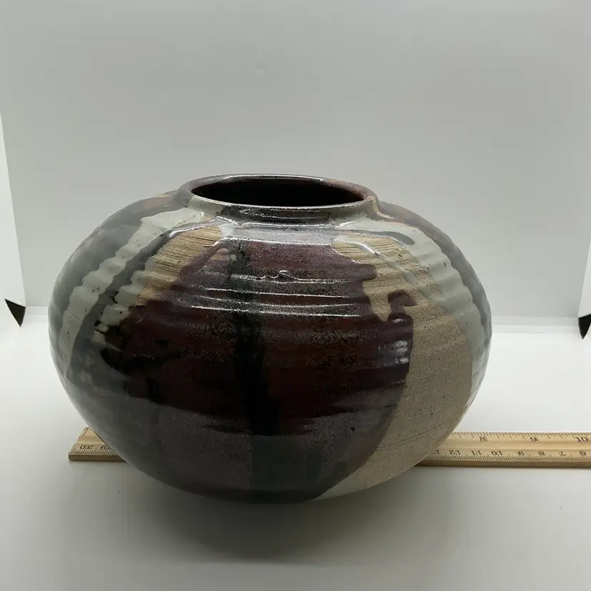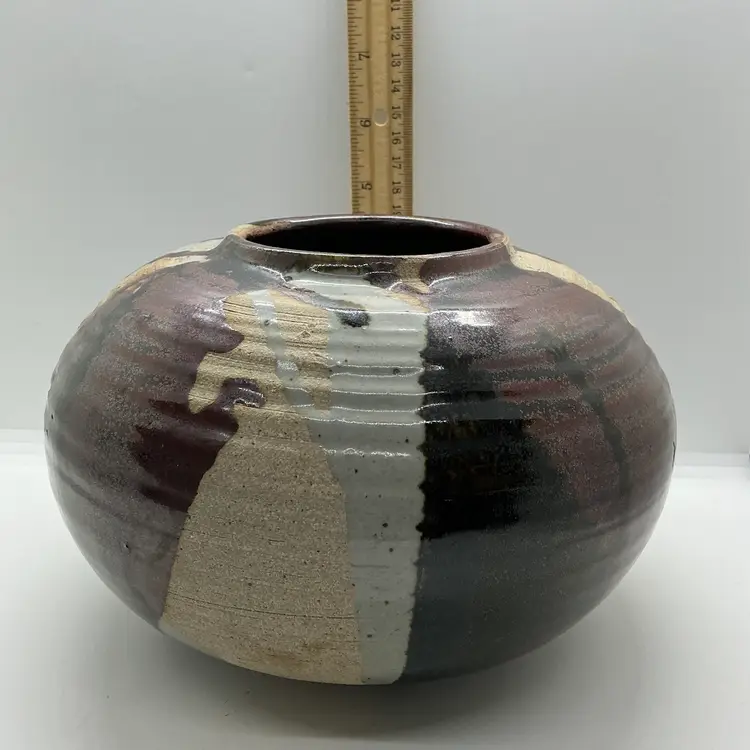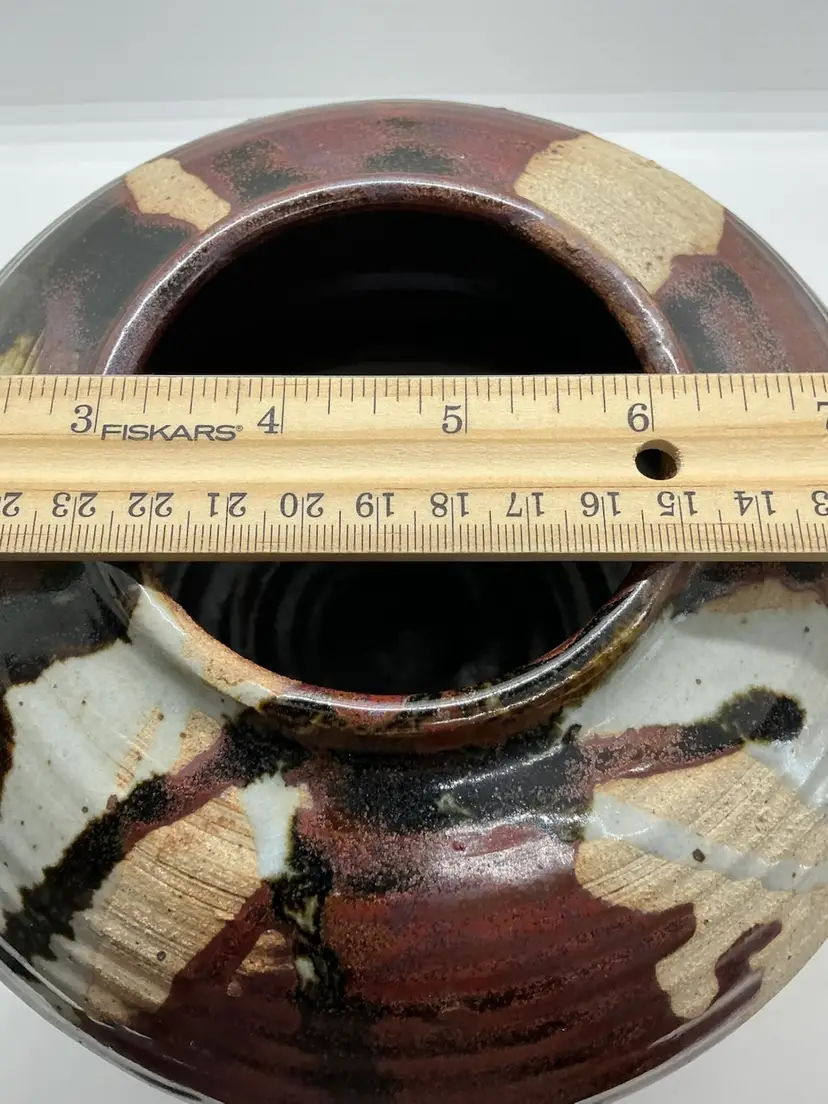 Handmade Studio Pottery Vase With Unique Paw Print Signature Earth Tone Glaze Art Piece. Beautiful one-of-a-kind hand-thrown studio pottery vase featuring rich, earthy glaze tones and an organic, sculptural form. This piece showcases a striking blend of deep brown, black, and natural clay with flowing glaze patterns, giving it a rustic yet modern feel. A distinctive paw print mark is incorporated into the glaze. Perfect as a decorative accent, centerpiece, or for collectors of handmade ceramics. Handmade / studio pottery, Multi-tone glaze: brown, black, cream, and natural clay, Rounded low-profile form, Very good vintage condition. No cracks or chips. Minor surface variations and imperfections consistent with handmade pottery. Heavy, over 3 pounds.