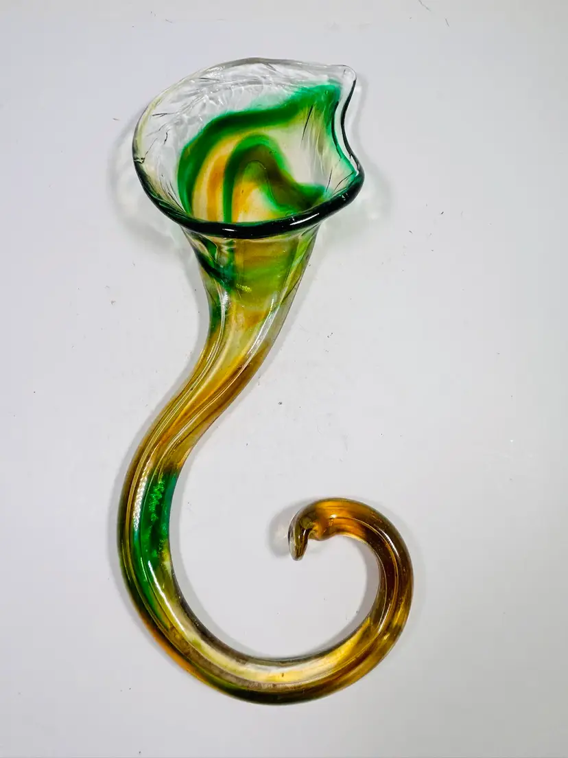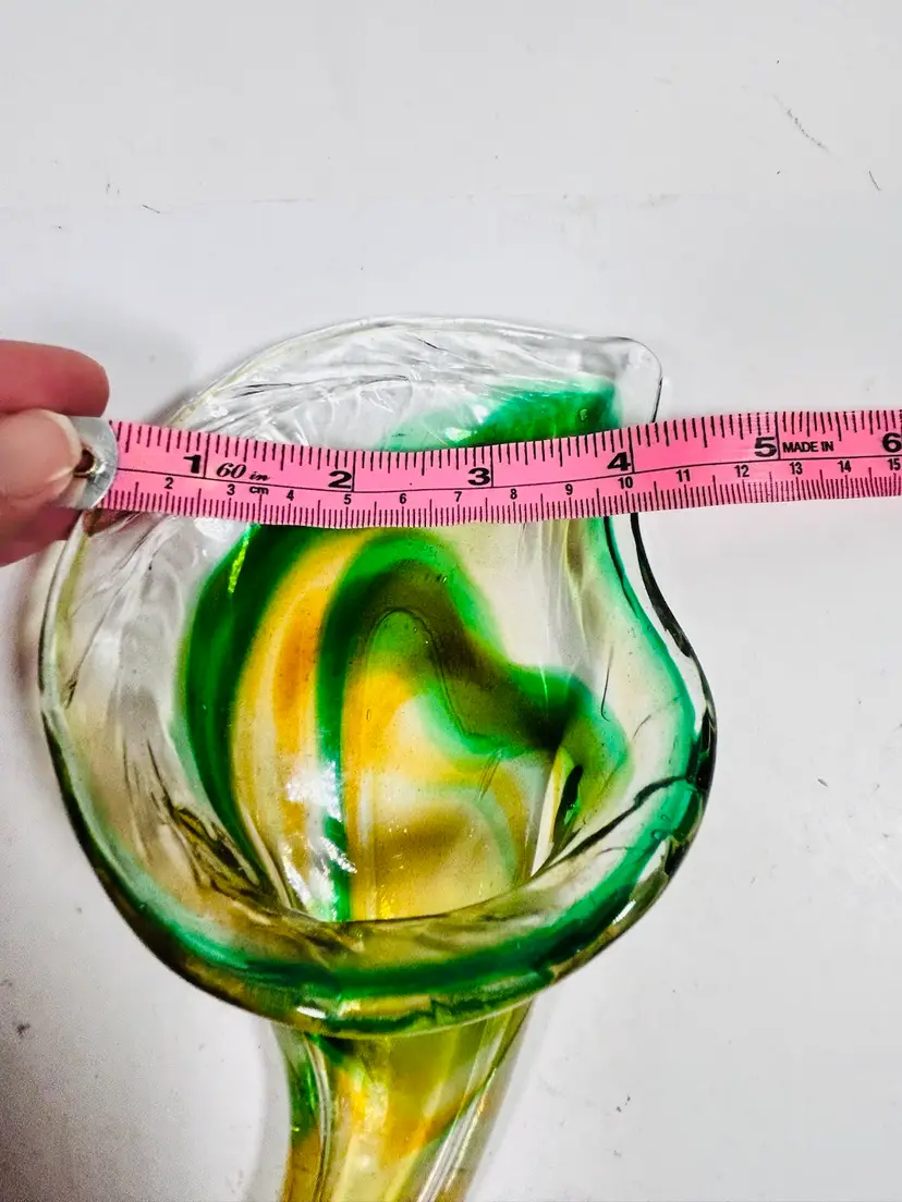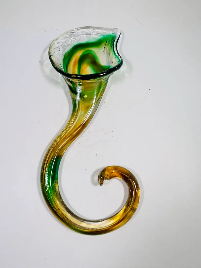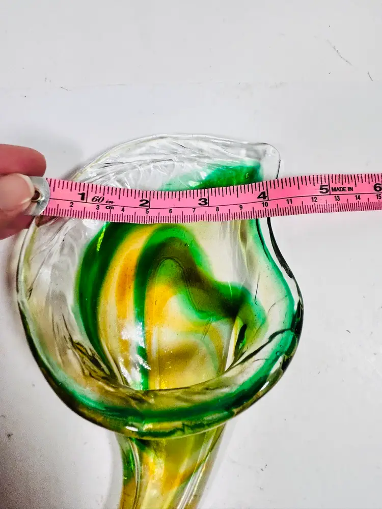 This vintage sculpture is a stunning piece of art glass that will add a touch of elegance to any room. The handblown glass vase features a beautiful green and yellow lily swirl pattern that is both unique and eye-catching. Measuring 8 inches in height, this vase is perfect for displaying flowers or standing alone as a decorative piece. The art glass production style and hand blown glass technique make this sculpture a one-of-a-kind addition to any collection. No damage noted. Measurements are shown in the pictures