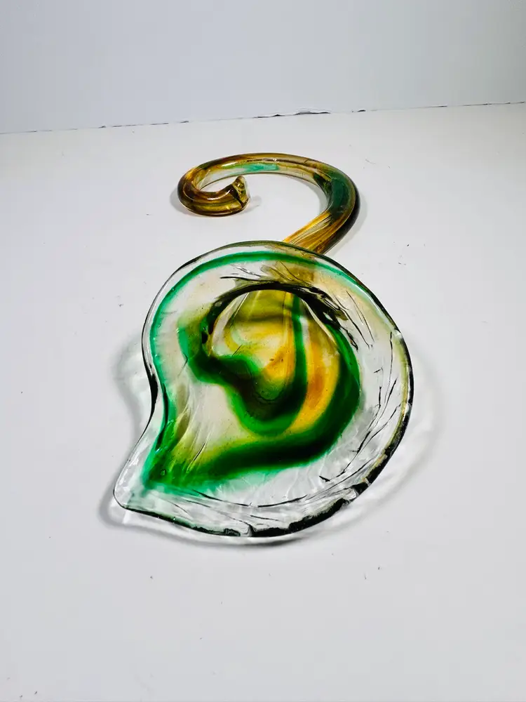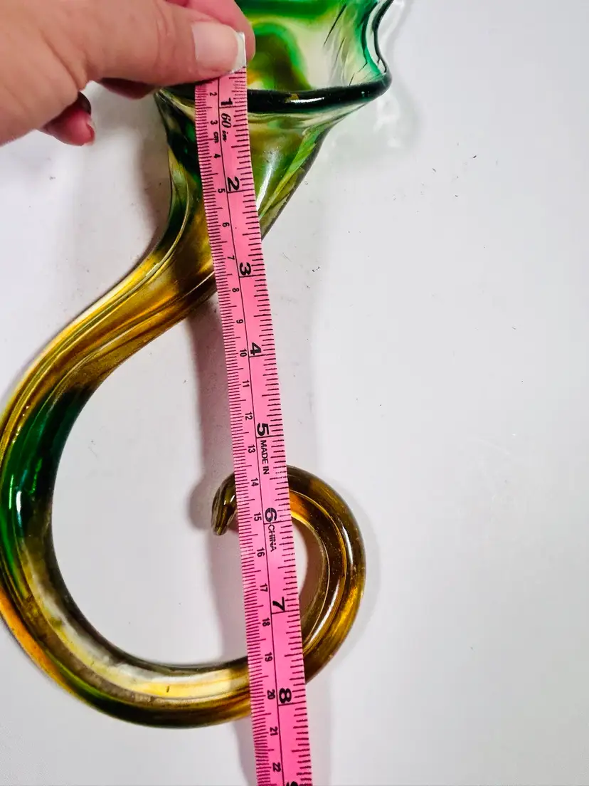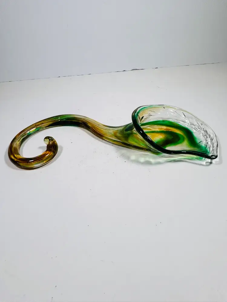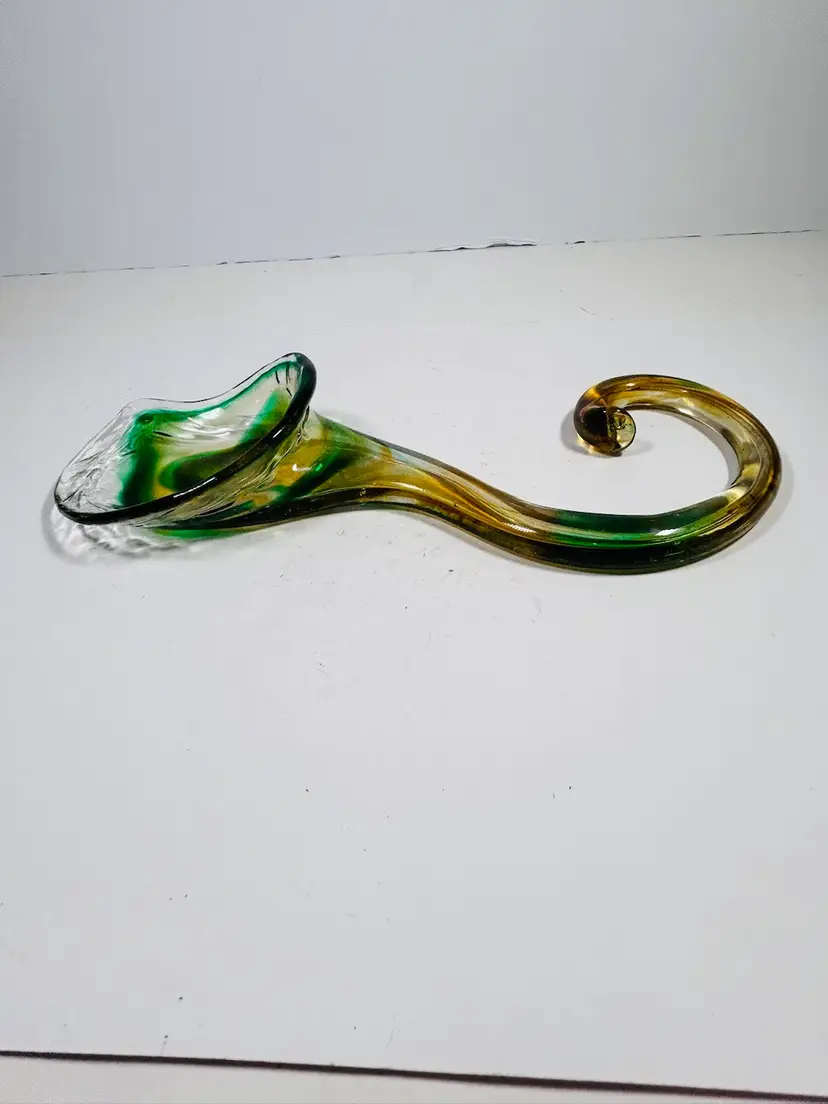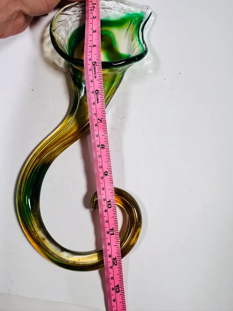 This vintage sculpture is a stunning piece of art glass that will add a touch of elegance to any room. The handblown glass vase features a beautiful green and yellow lily swirl pattern that is both unique and eye-catching. Measuring 8 inches in height, this vase is perfect for displaying flowers or standing alone as a decorative piece. The art glass production style and hand blown glass technique make this sculpture a one-of-a-kind addition to any collection. No damage noted. Measurements are shown in the pictures