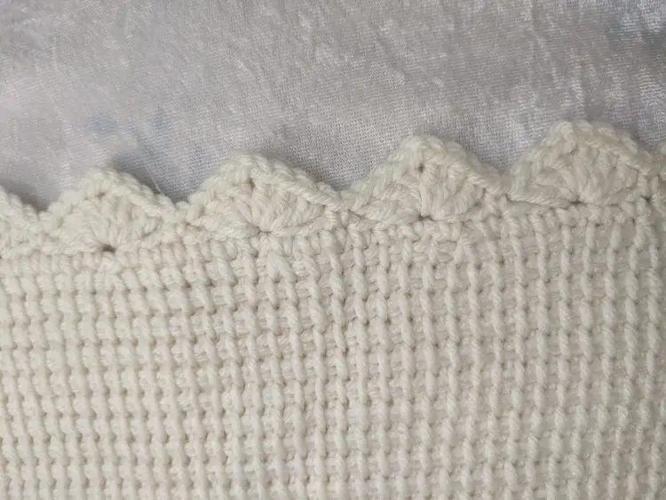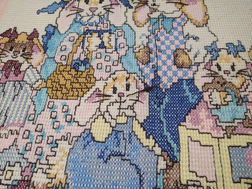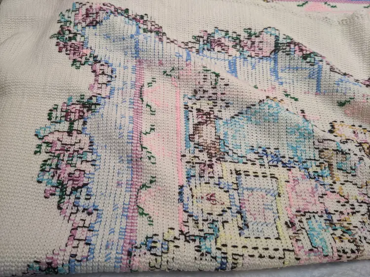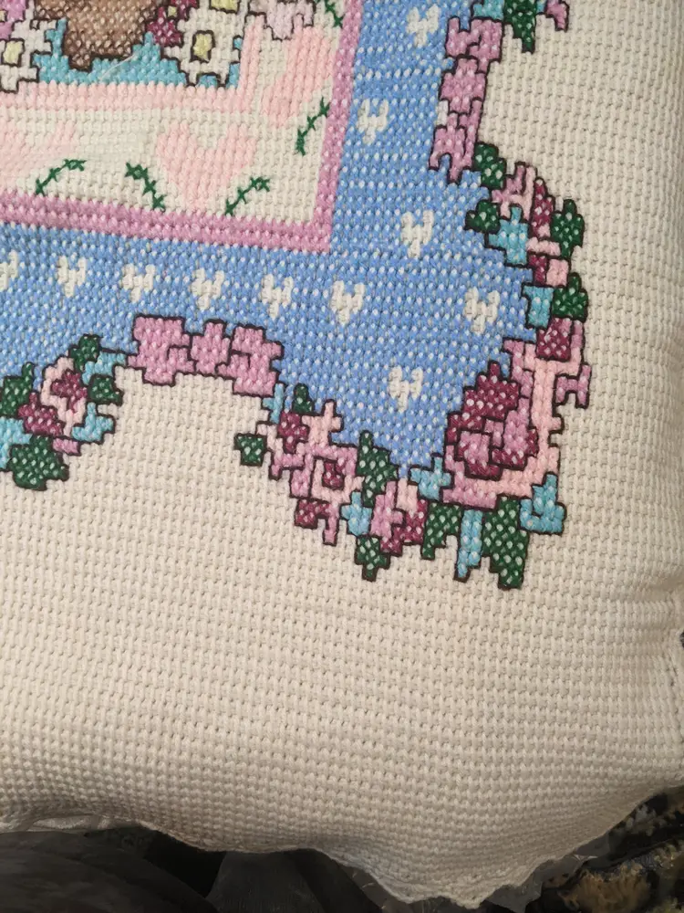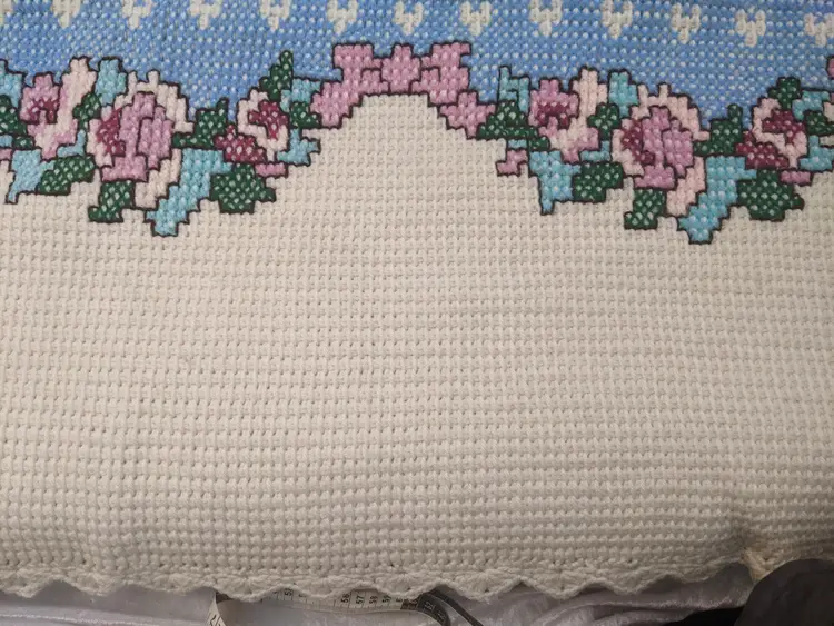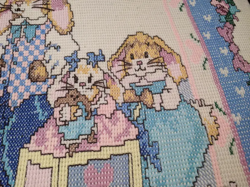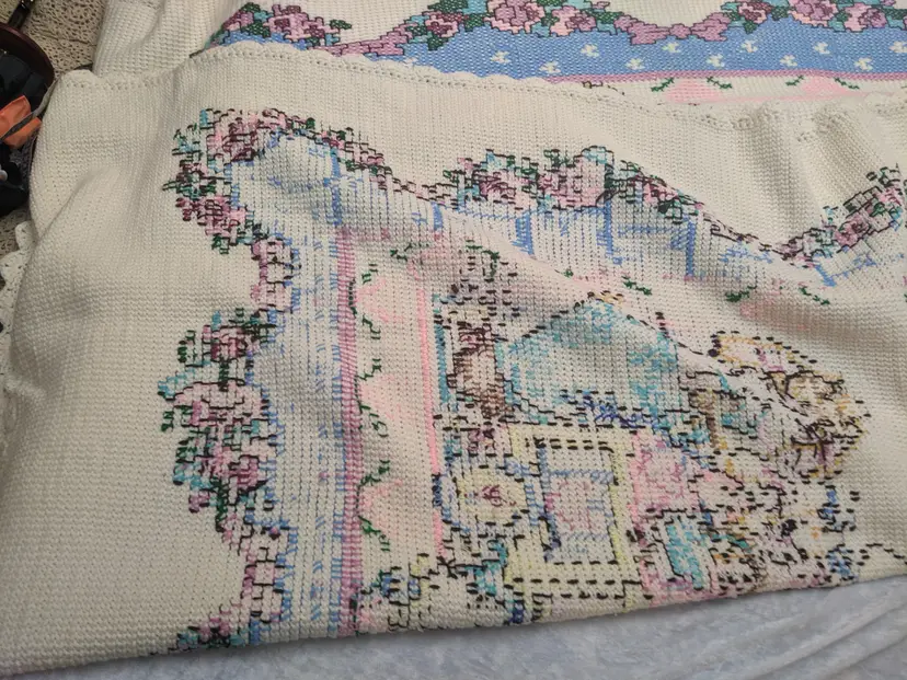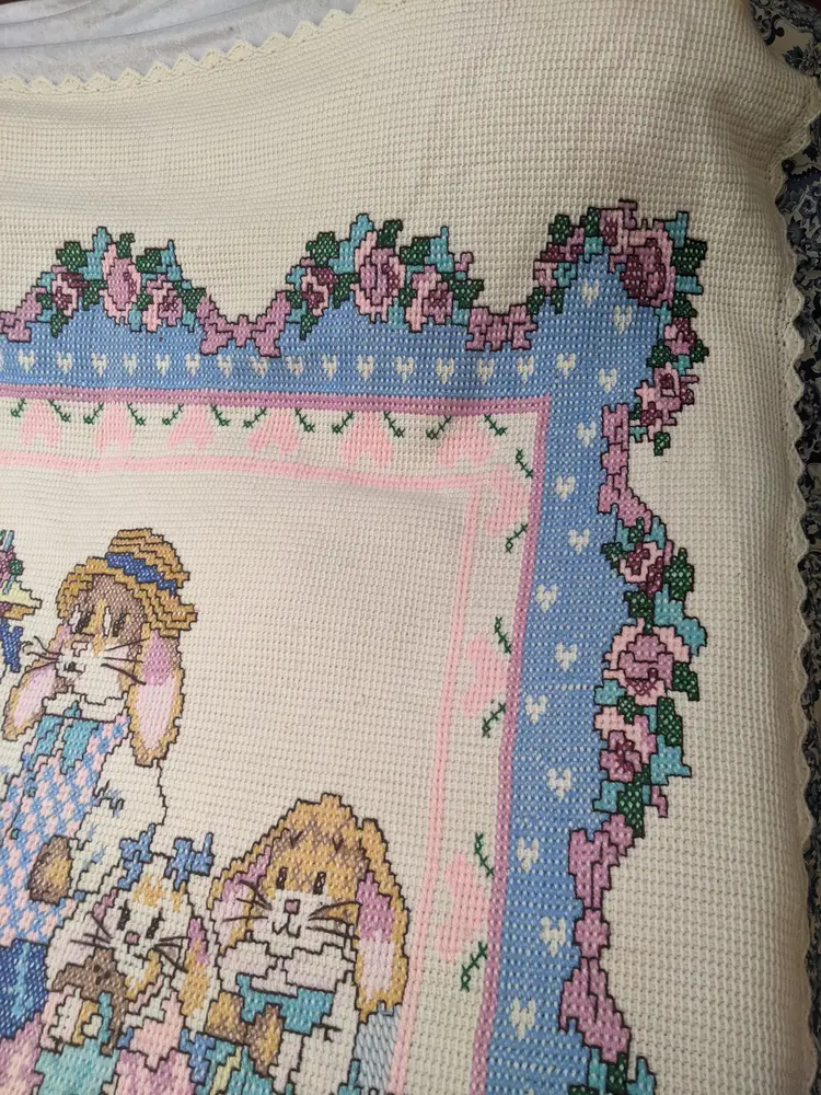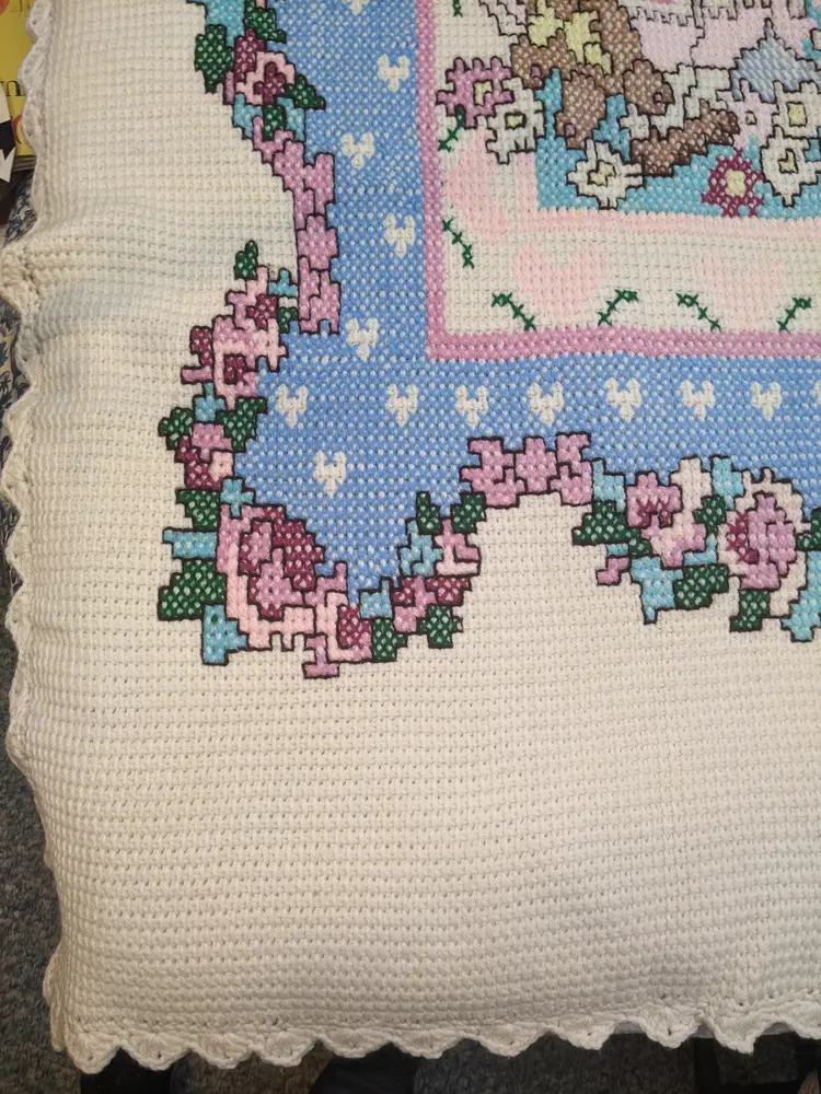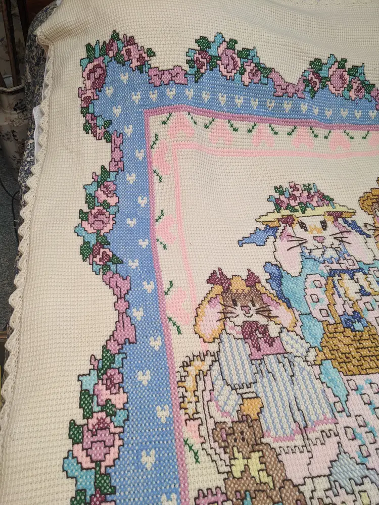 VTG Handmade Heavy 65x80 Bunny Rabbit Family Knit Crochet Blanket Throw Floral Edge Scalloped edging. So cute with the bunny family looks like it was embroider very well done. . Perfect for a child's room decor very thick and warm. Shown on a QUEEN SIZE BED. Very thick and heavy. Great condition Clean with no damage. no weird smells. Please check the photos for details. Comes from a smoke free home. We do have pets. It is kept away from them