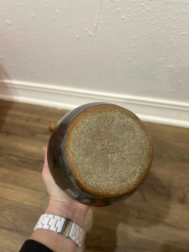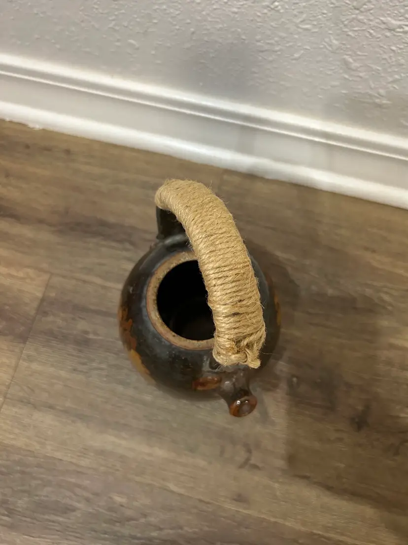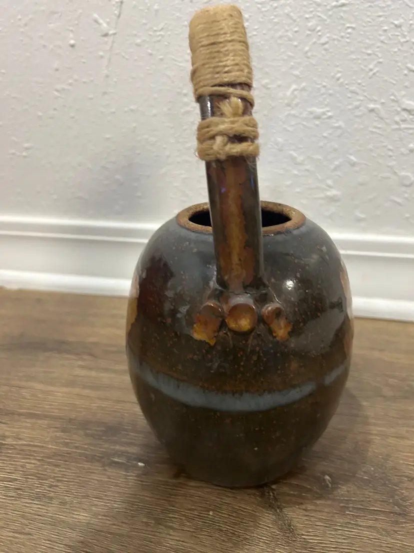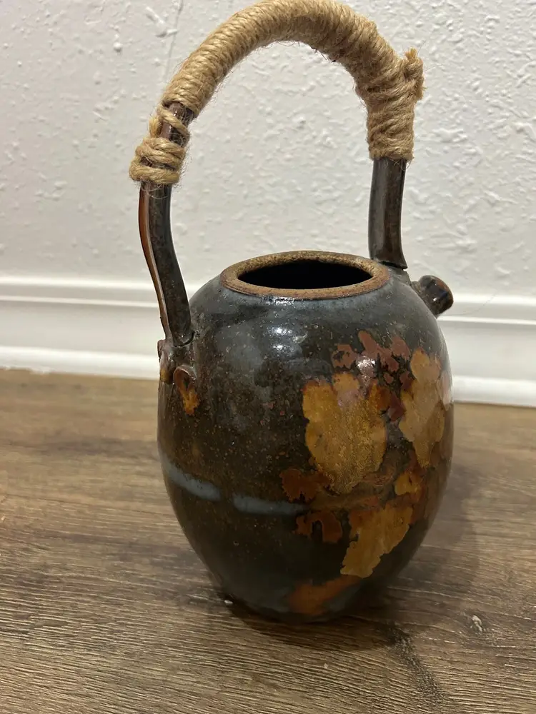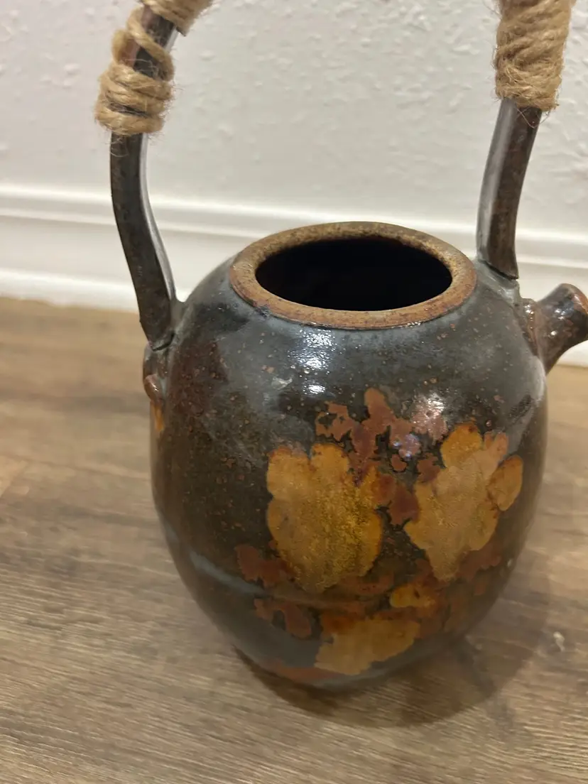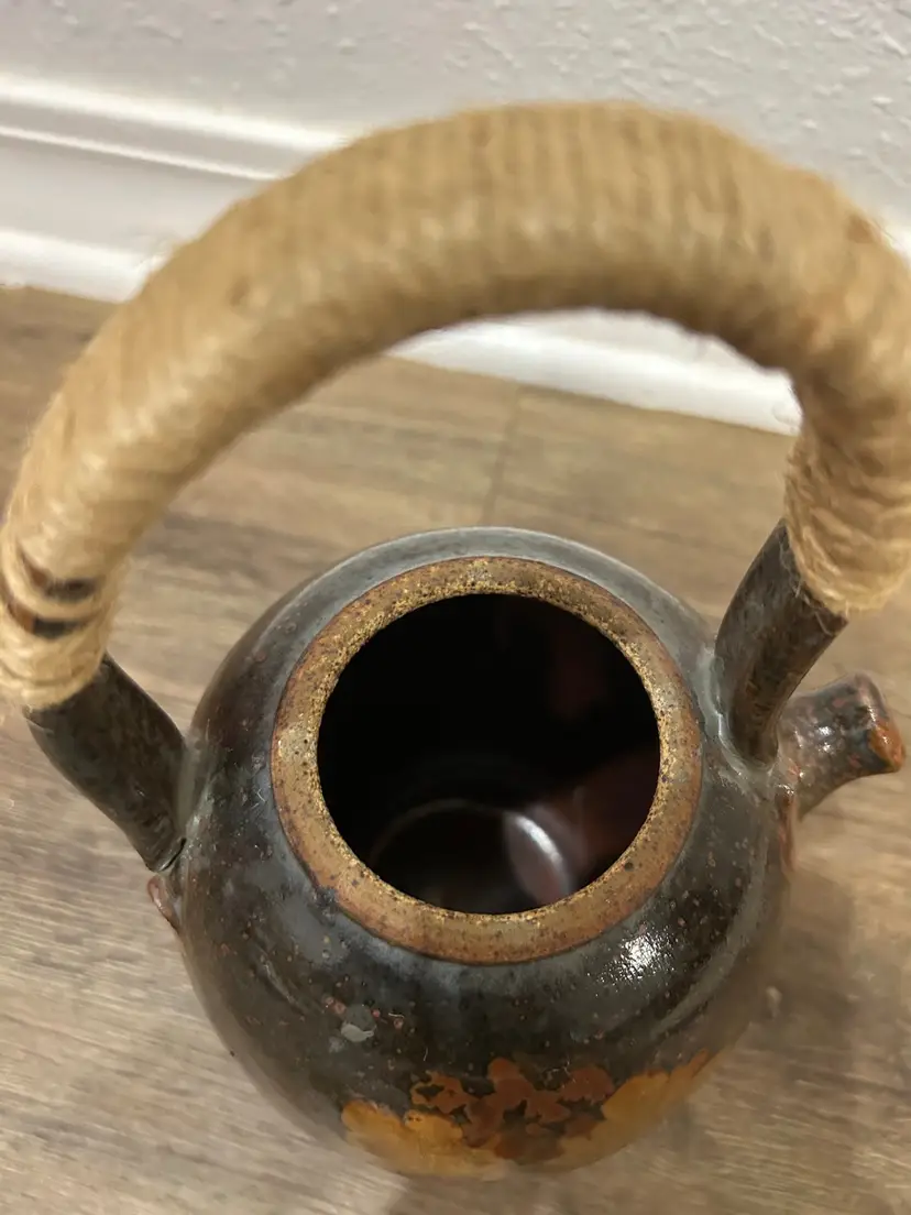 Vtg Handmade Signed Pottery Teapot With Cane twineWrapped Handle