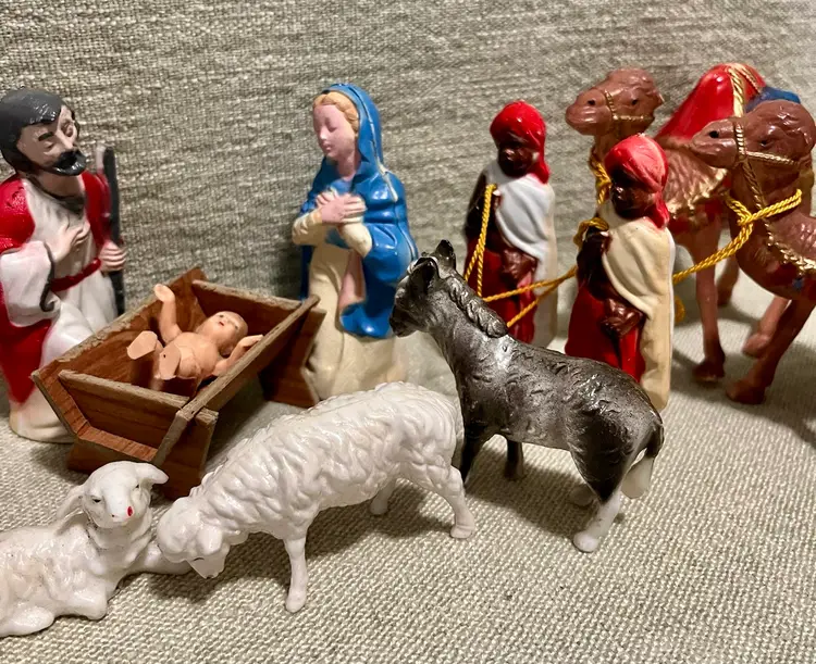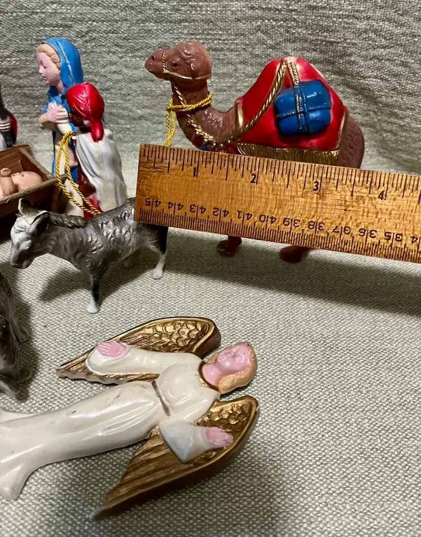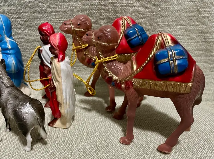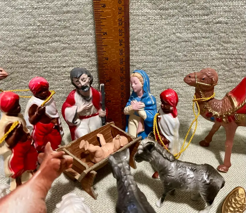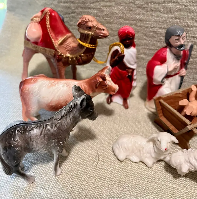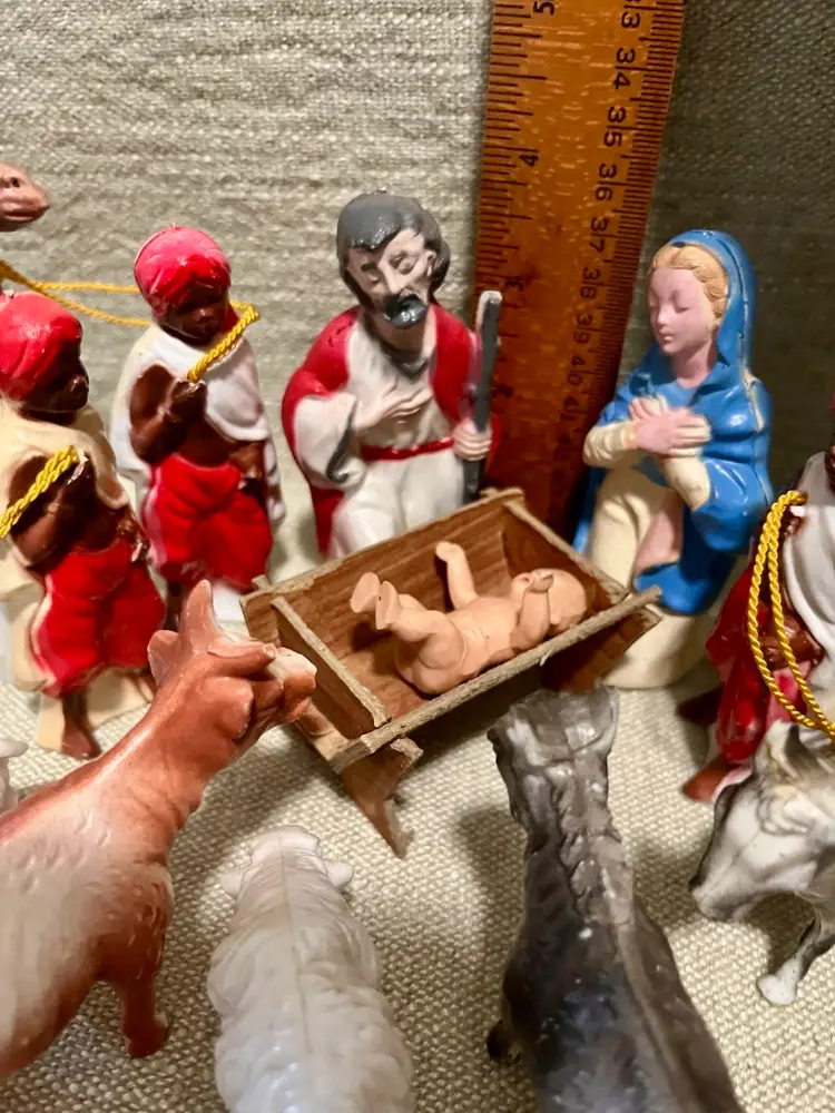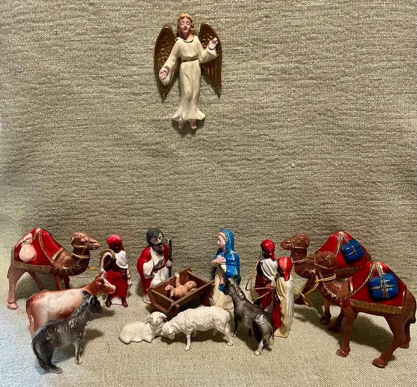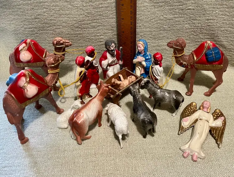 This vintage hard plastic Nativity set features a soft-plastic or rubber Jesus (not certain this was original to this set as it is a different material), Mary, Joseph, the Magi, camels, angel, sheep, and donkeys and a cardboard manger. The set includes 16 pieces as I count them - but buyer needs to be in agreement to purchase - , each approximately 4" in height and 3.5" in width, with a multicolor design all together weighing under 11 ounces. Made mostly of plastic, this medium-sized Nativity scene is a festive addition to Christmas decor, perfect for celebrating the birth of Jesus Christ and the Epiphany. Ideal for a family with children or anyone wanting a vintage set that isn’t ceramic or porcelain or wood or metal.