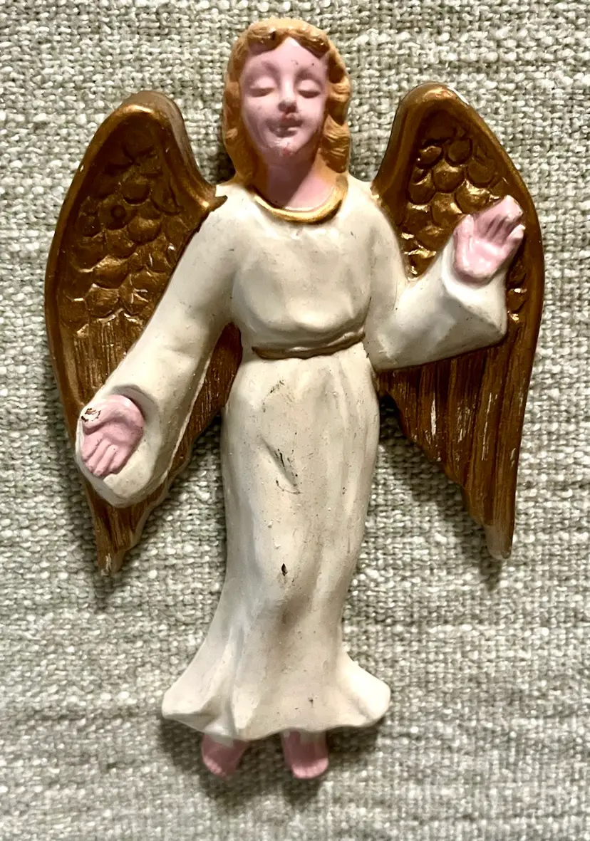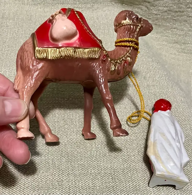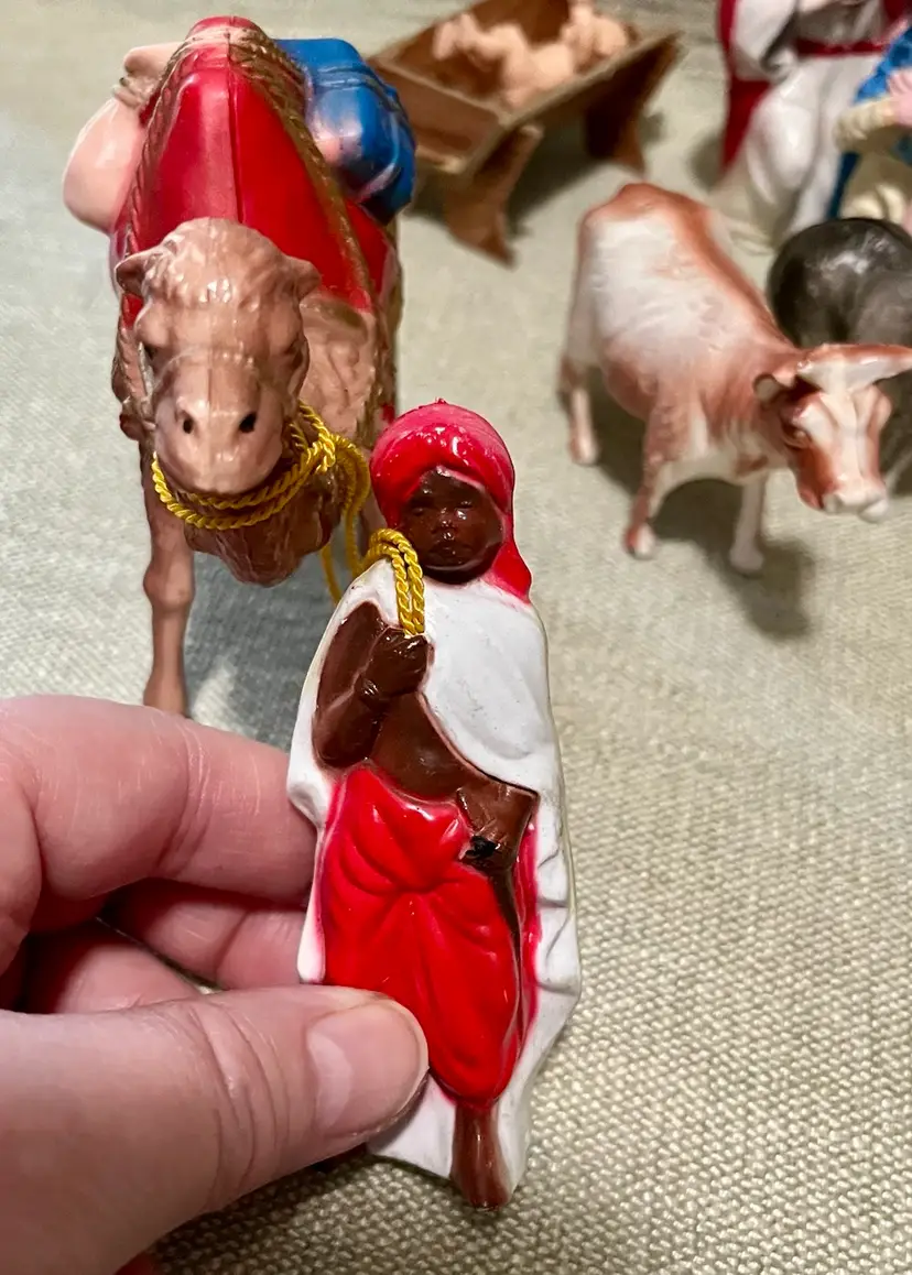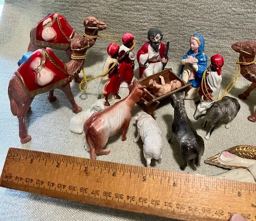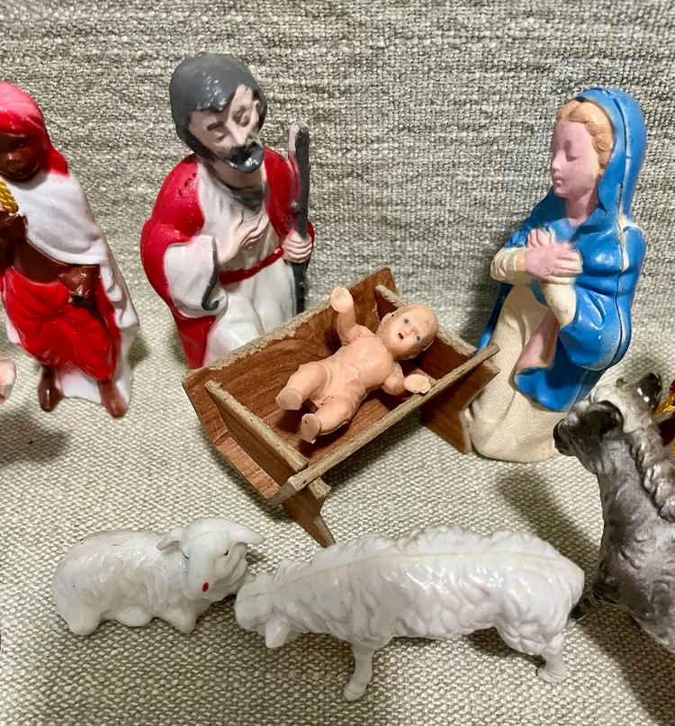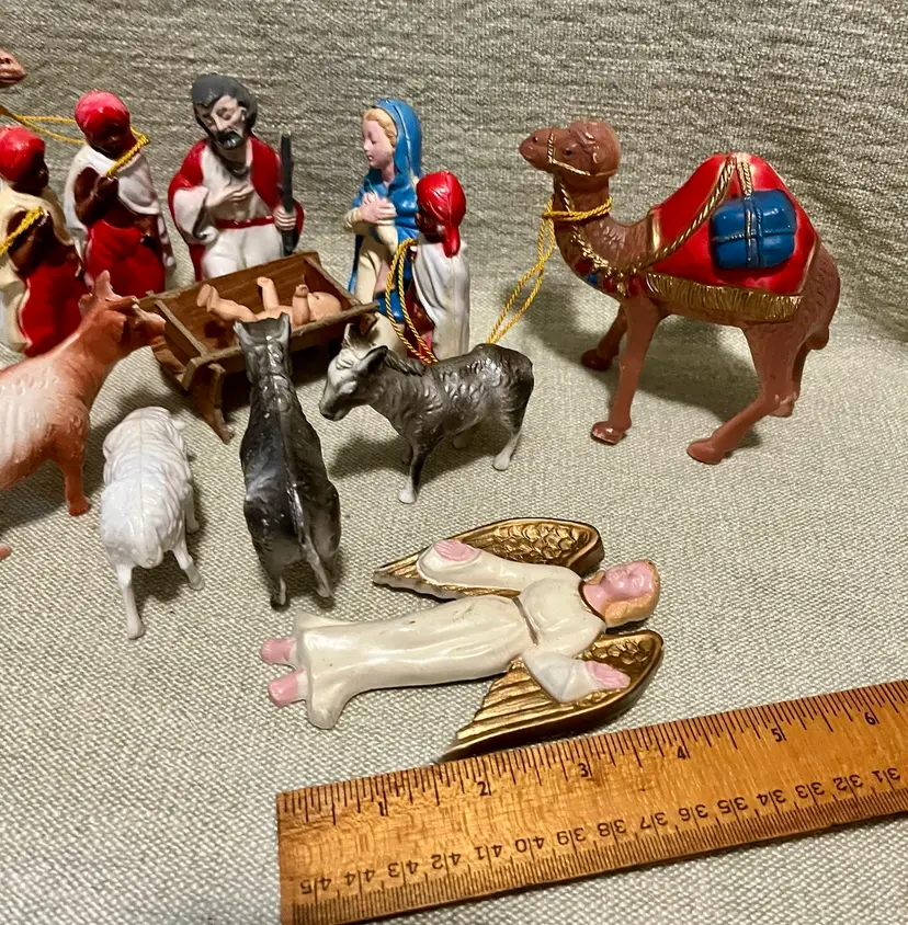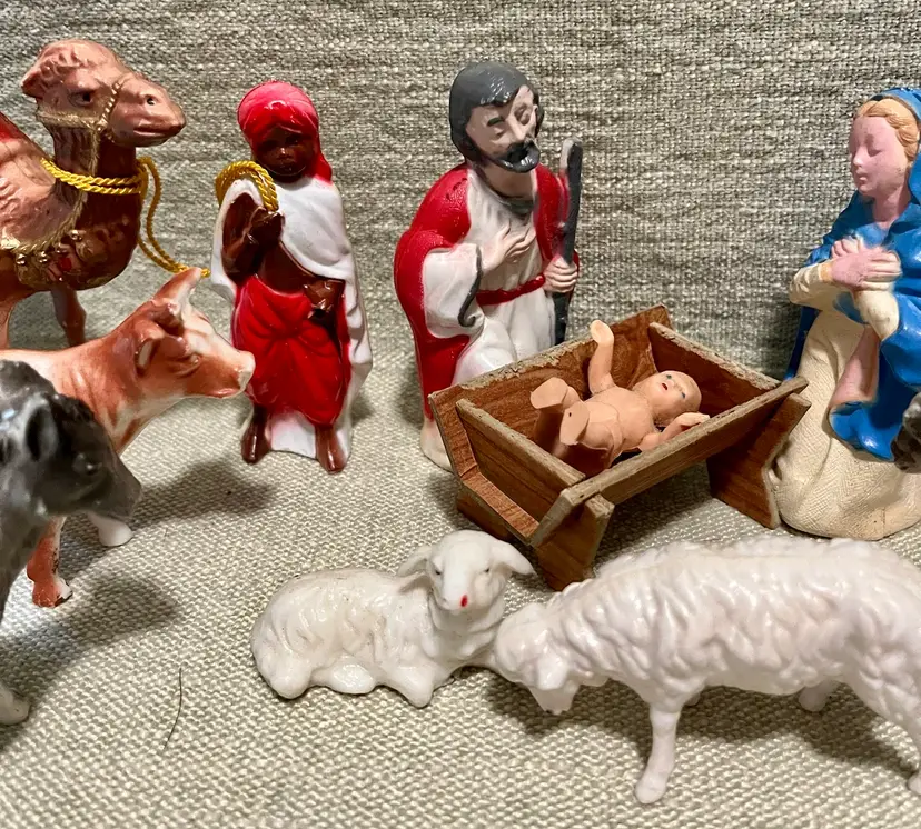This vintage hard plastic Nativity set features a soft-plastic or rubber Jesus (not certain this was original to this set as it is a different material), Mary, Joseph, the Magi, camels, angel, sheep, and donkeys and a cardboard manger. The set includes 16 pieces as I count them - but buyer needs to be in agreement to purchase - , each approximately 4" in height and 3.5" in width, with a multicolor design all together weighing under 11 ounces. Made mostly of plastic, this medium-sized Nativity scene is a festive addition to Christmas decor, perfect for celebrating the birth of Jesus Christ and the Epiphany. Ideal for a family with children or anyone wanting a vintage set that isn’t ceramic or porcelain or wood or metal.