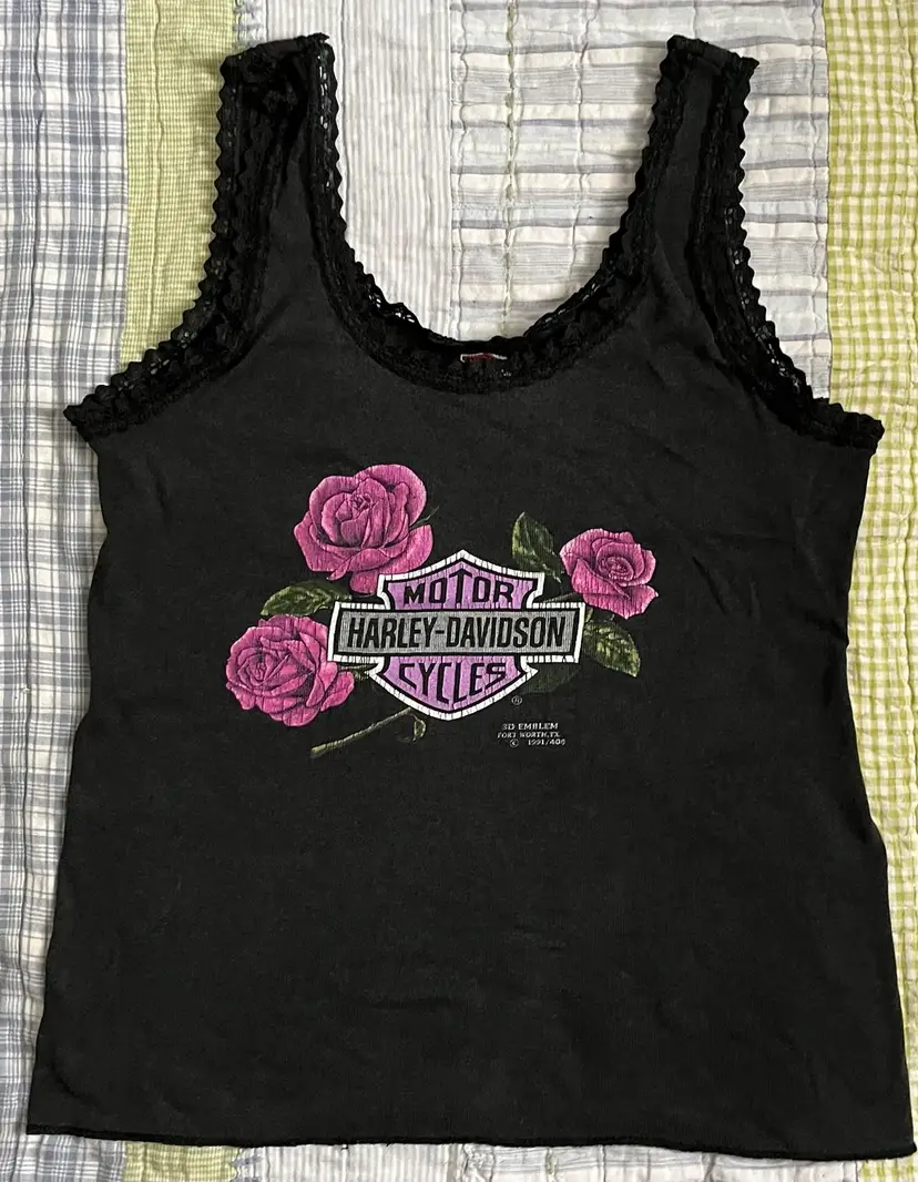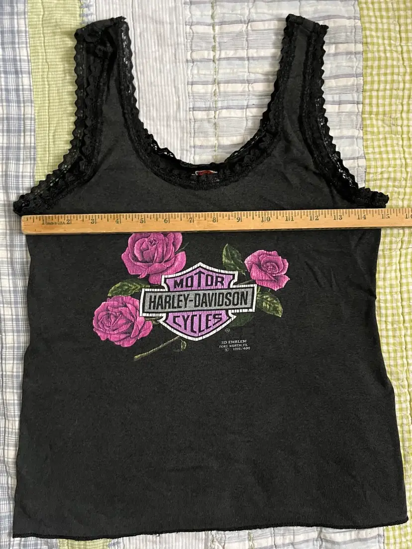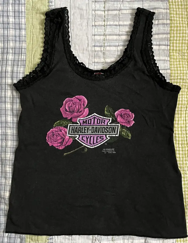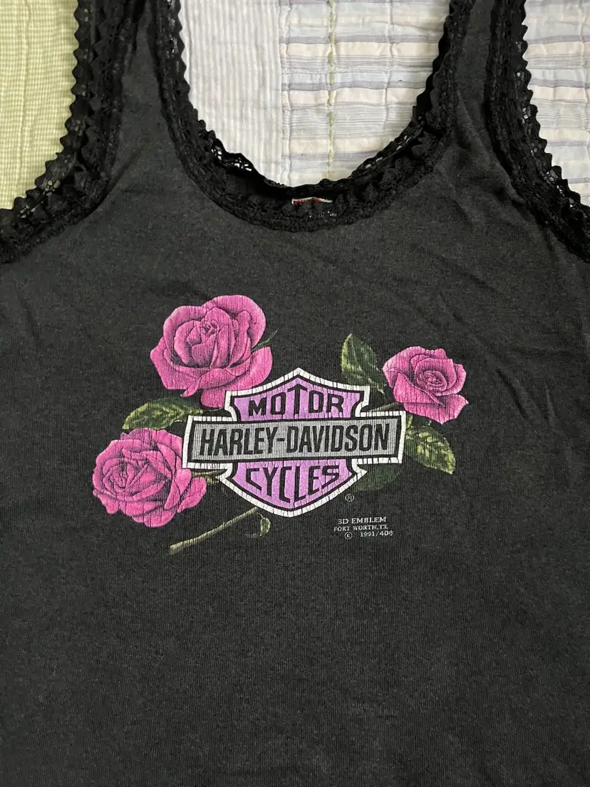 This vintage Harley Davidson 3D Emblem Tank Top is a women's piece with a scoop neckline and pullover closure. Made from a blend of polyester and cotton in a classic black color, the top features a vintage-crackling graphic of roses and the iconic Harley-Davidson emblem, with strap lace trim, for a biker chic look. Perfect for casual occasions in any warm weather season, this lightweight and packable tank is easy to care for and machine washable. Made in the USA in the 90s, this top authentically worn into perfection, is ready for its next owner.