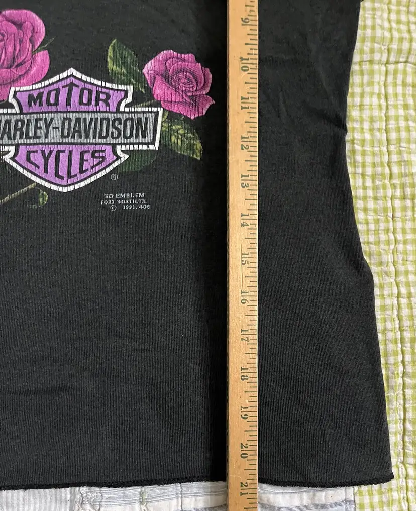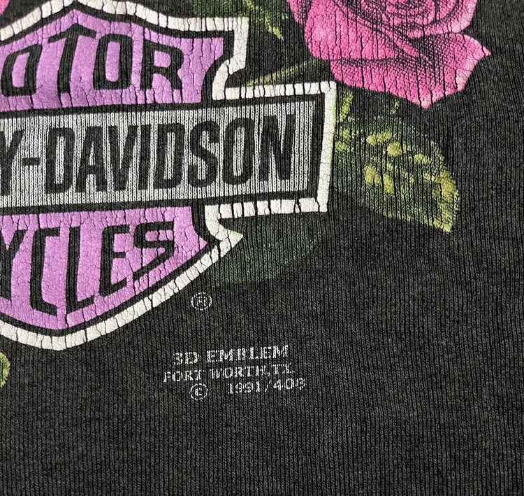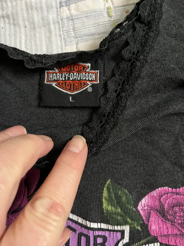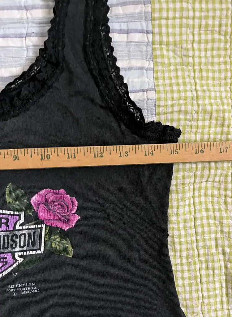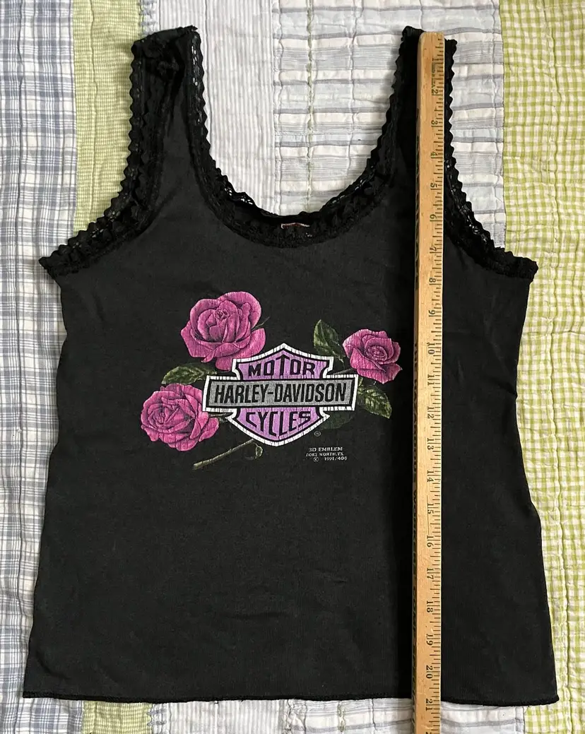This vintage Harley Davidson 3D Emblem Tank Top is a women's piece with a scoop neckline and pullover closure. Made from a blend of polyester and cotton in a classic black color, the top features a vintage-crackling graphic of roses and the iconic Harley-Davidson emblem, with strap lace trim, for a biker chic look. Perfect for casual occasions in any warm weather season, this lightweight and packable tank is easy to care for and machine washable. Made in the USA in the 90s, this top authentically worn into perfection, is ready for its next owner.