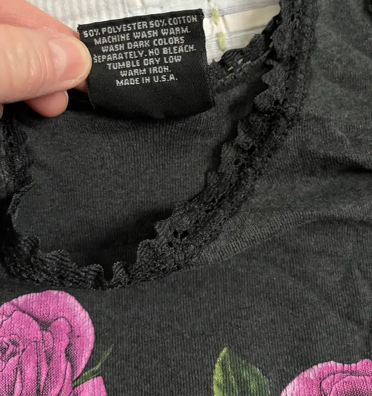 Please look at all the photos prior to deciding to make a purchase. This is a gently used / pre-owned item. And, VINTAGE (20 years +) is seldom perfect. This does have some sun fading and the graphic is crackling. It is awaiting its next owner’s care for machine washing. Buyer is strongly encouraged to review the photos and decide for themselves its condition as my interpretation may not align with yours. Prior to a purchase, questions not answered in photos, details, description are welcome.