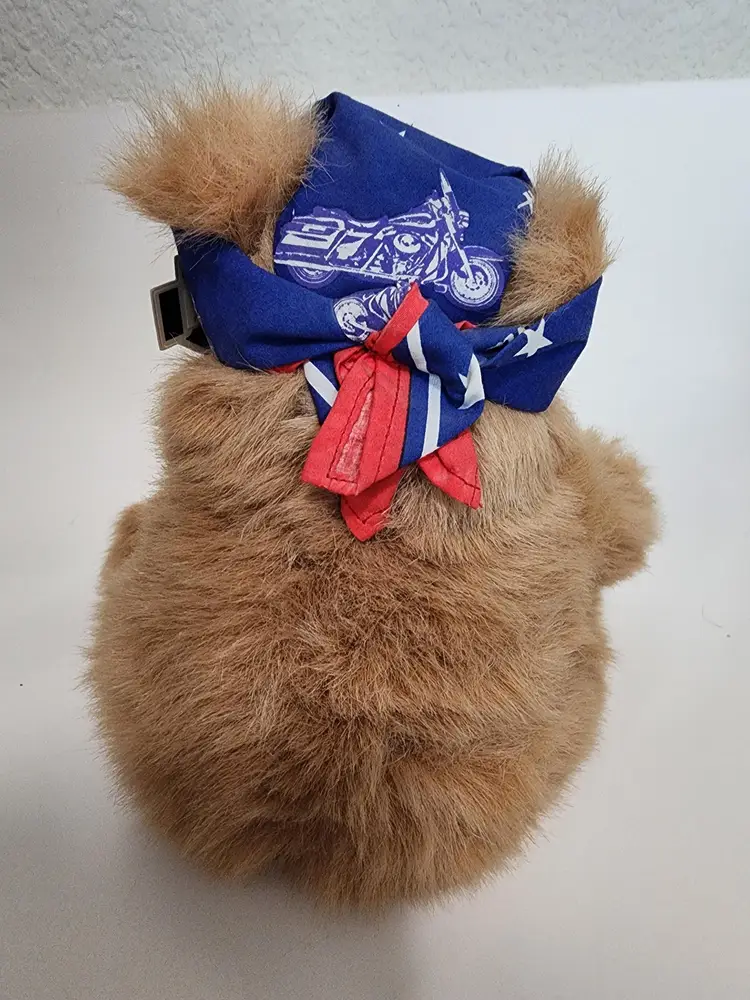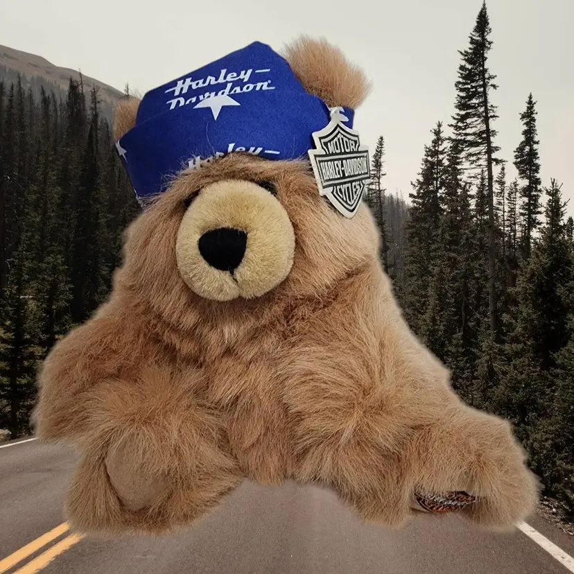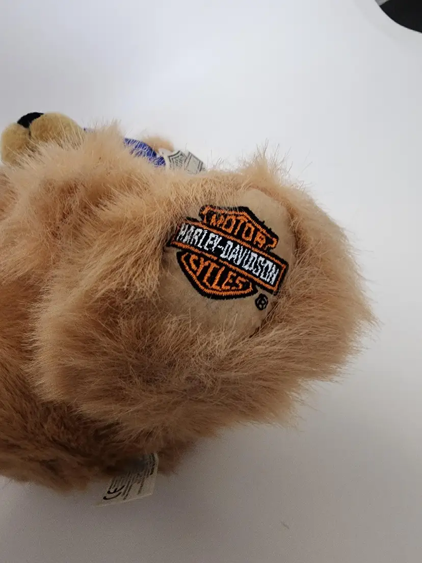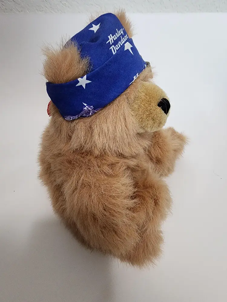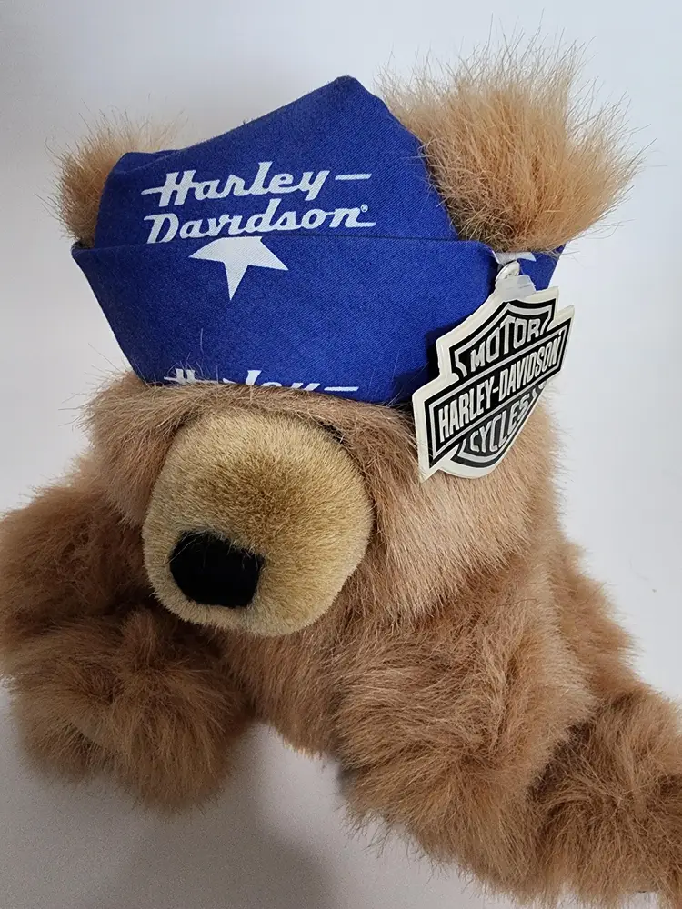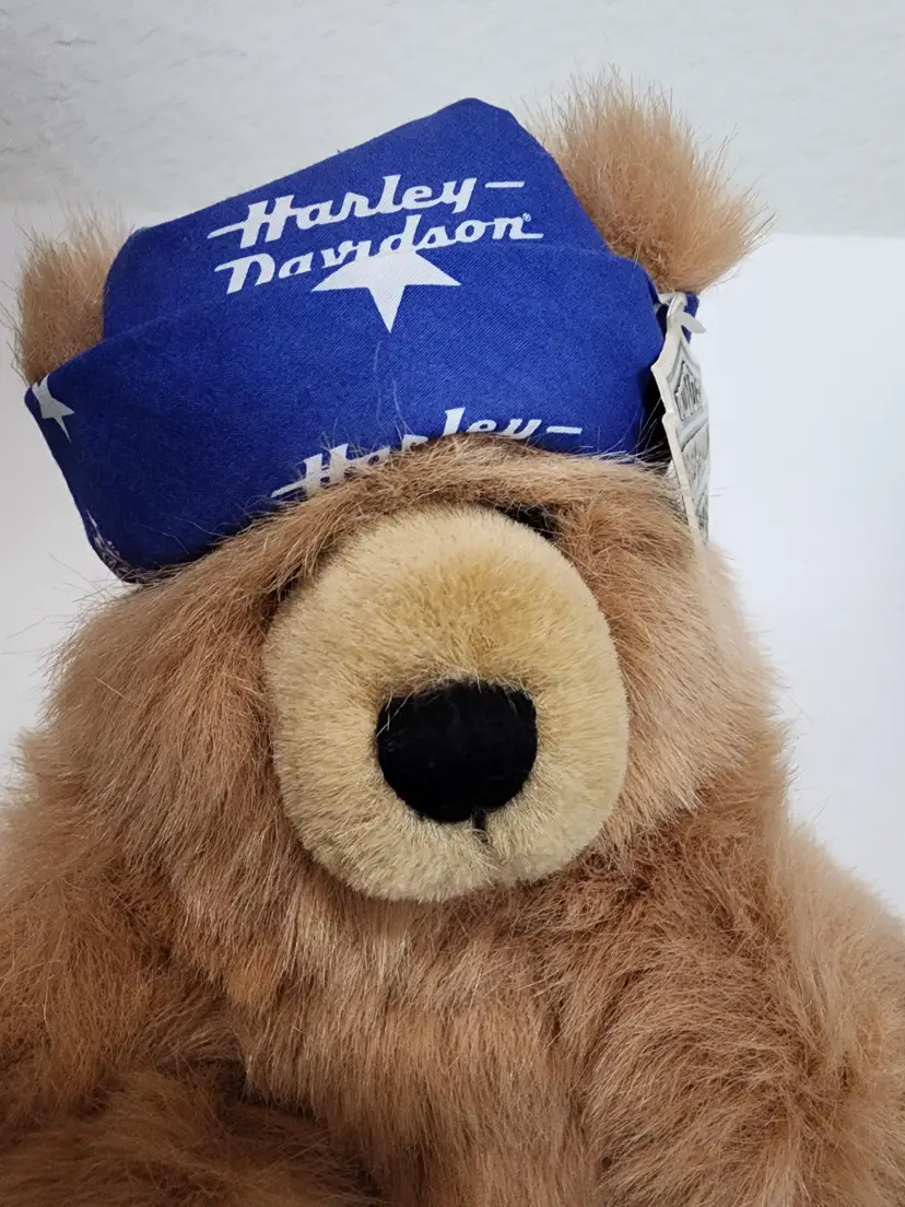 This vintage Harley Davidson Teddy Bear by Cavanah is in good condition with no noted stains or damage. Features a blue bandana and the original hang tag. Made in 2000.