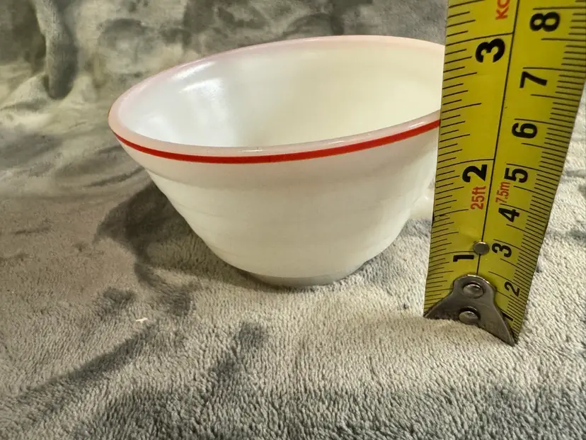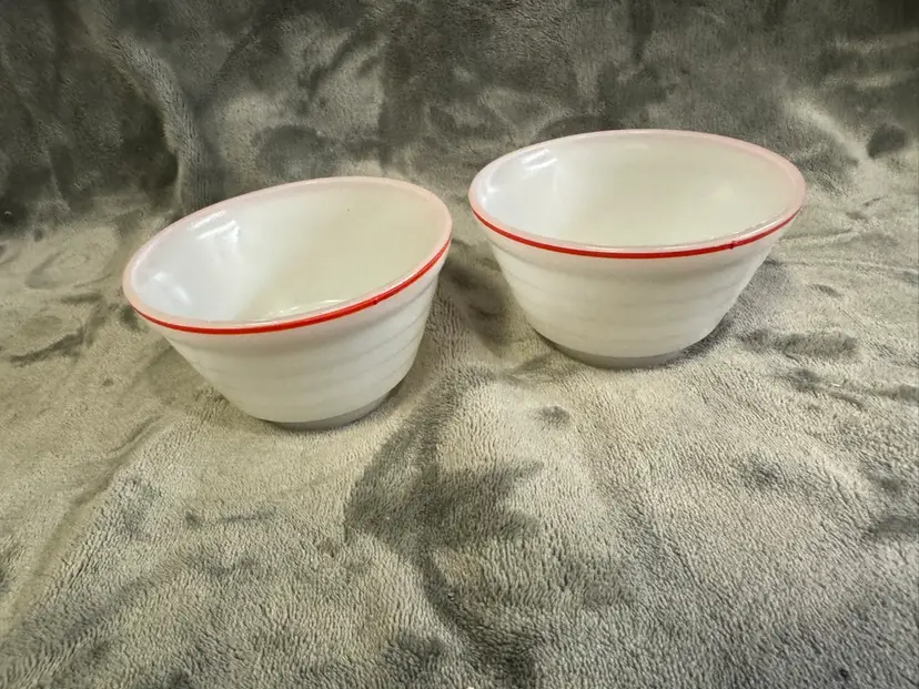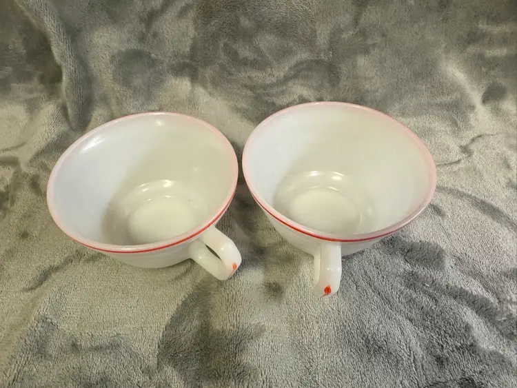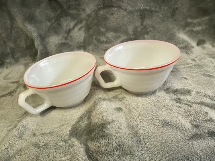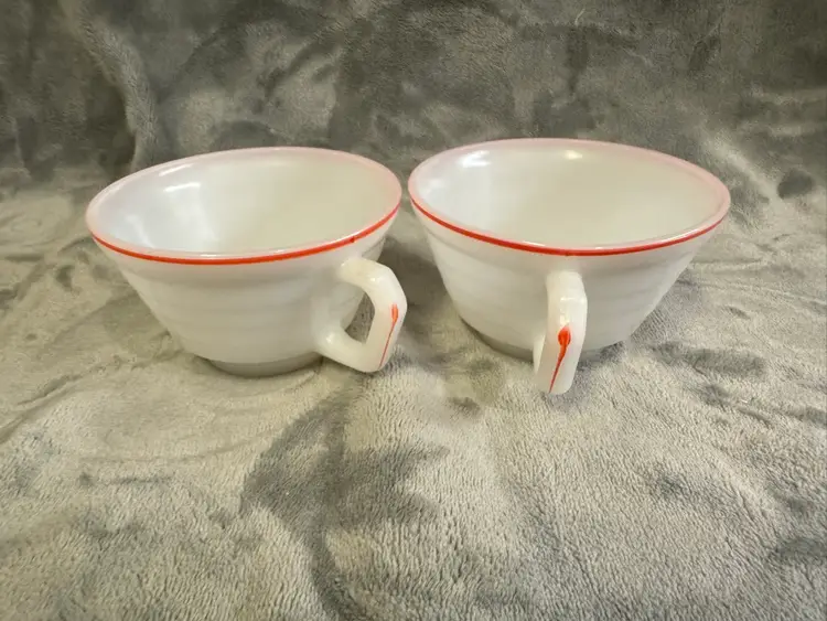 This product is a set of two vintage Hazel Atlas Platonite white and red opaque glass Moderntone coffee mugs tea cups. These round mugs are in a retro style with a glossy finish, featuring a handle for easy carrying. Made in the United States in the 1950s, they are a part of the Moderntone product line, known for their milk glass production technique. These classic mugs are perfect for all occasions and are signed by the Hazel-Atlas brand, adding a unique touch to your drinking experience. Remember to hand wash only to preserve their vintage charm. Pristine condition. No chips, cracks, or staining. Red detail around rim shows no wear or discoloration.