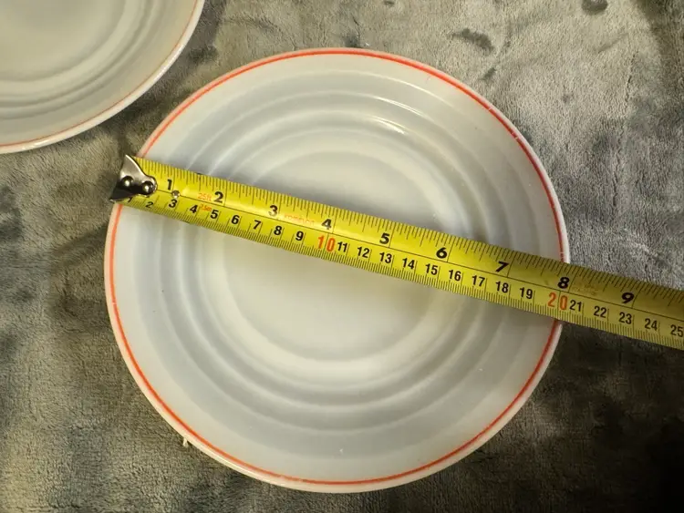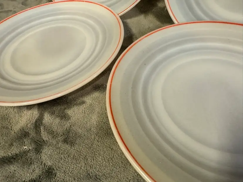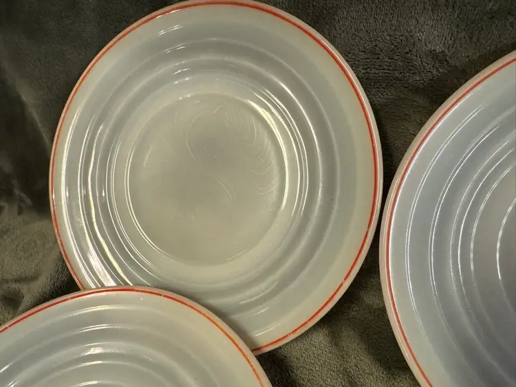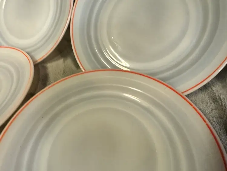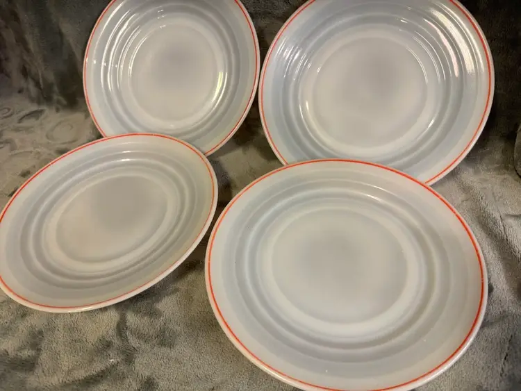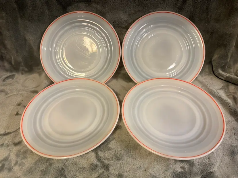 The product is a set of four 8-inch round white opaque glass salad dessert plates from the VTG Hazel Atlas Platonite collection. These vintage plates bear a retro Moderntone style and were manufactured in the United States during the early 20th century. Made of milk glass with a glossy finish, these Luncheon Plates are perfect for all occasions and are stackable for easy storage. The brand, Hazel-Atlas, is known for producing high-quality glassware, making these plates a valuable addition to any adult's dining collection. Excellent condition. No chips or cracks. There is very slight wear to the red stripe around the edge (see photos).