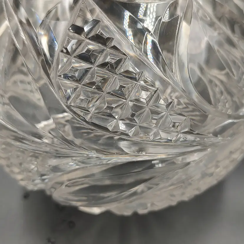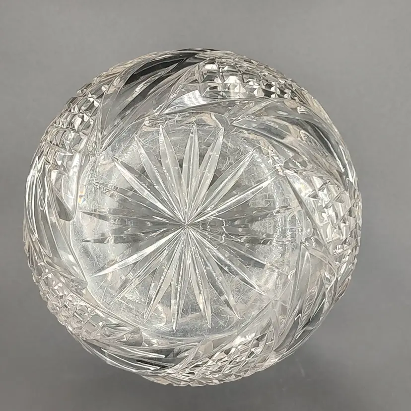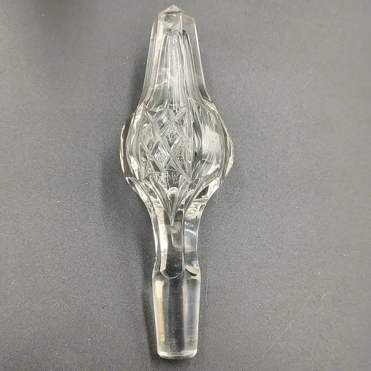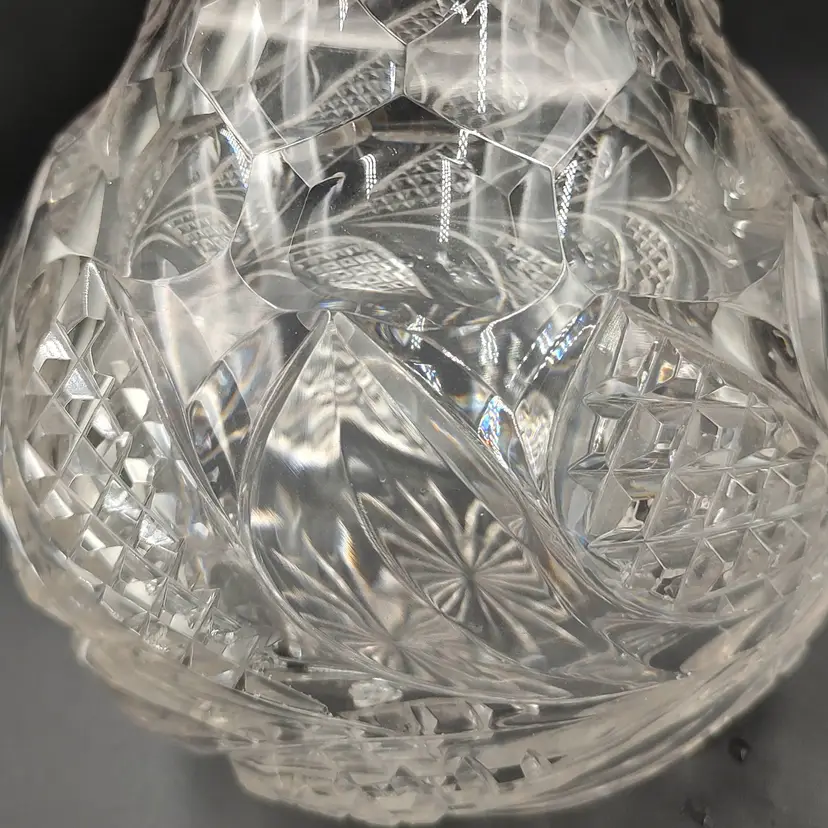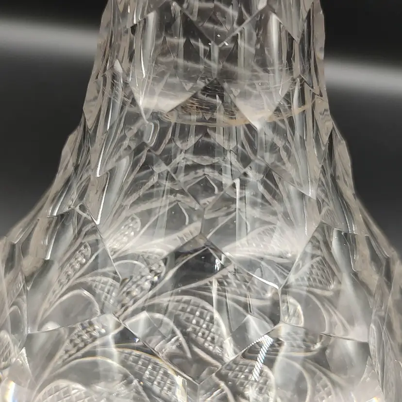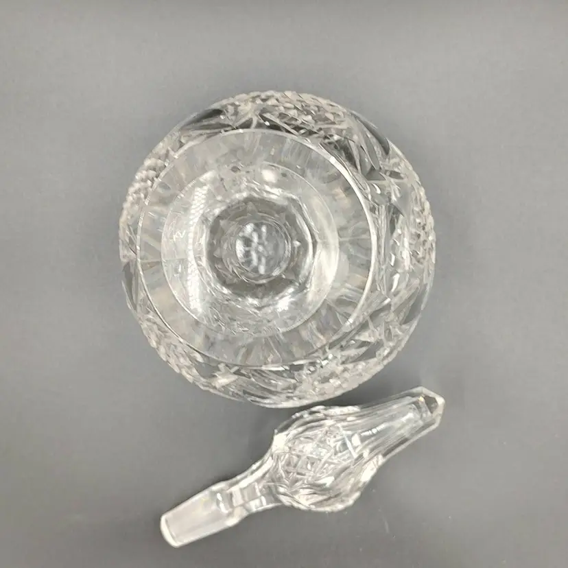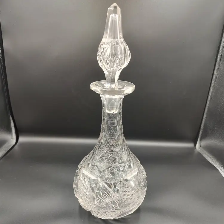 Vintage Heavy Clear Cut Glass Decanter With Stopper height with stopper 13" x diameter 6". Holds 5 cups.