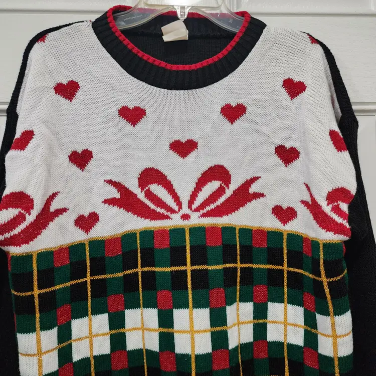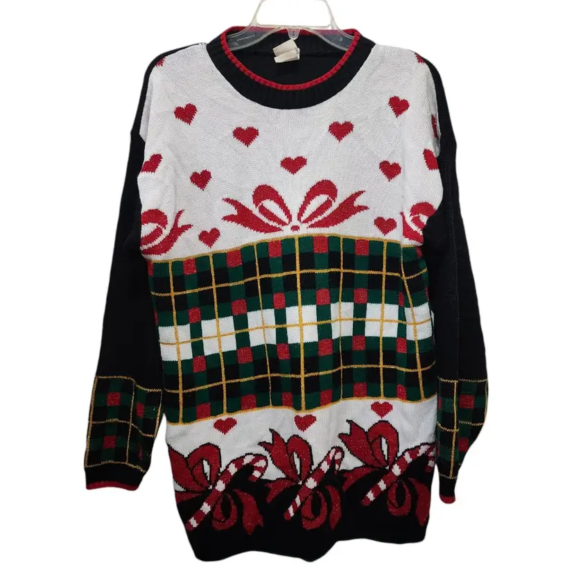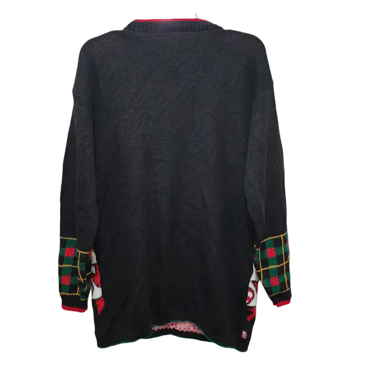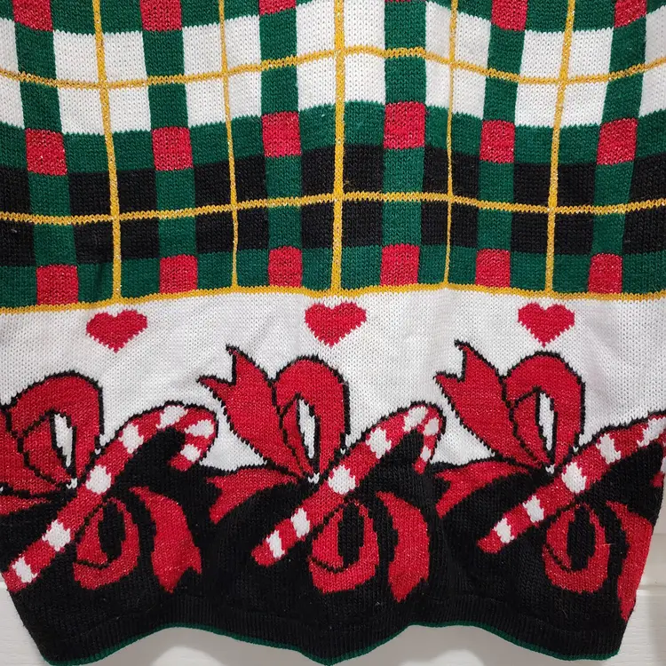Vtg Holiday Time Christmas Sweater Sz M Black Red Candy Canes Plaid