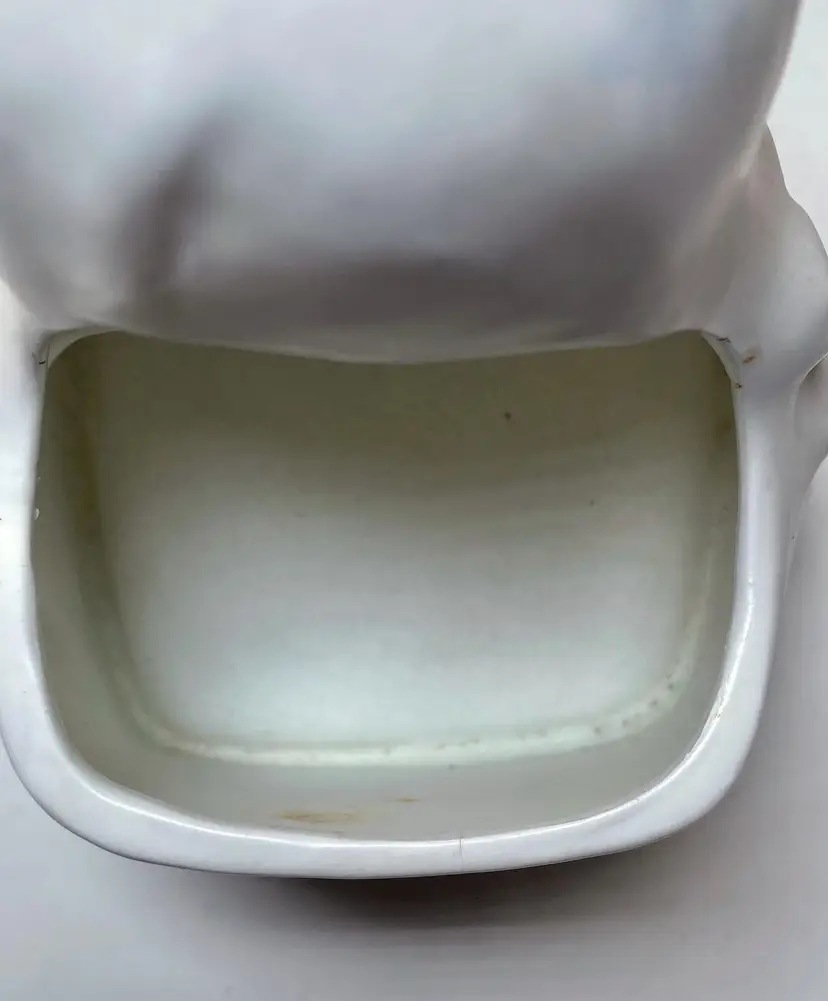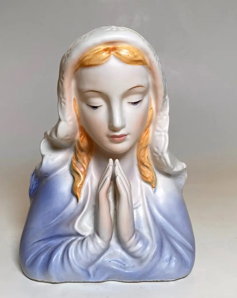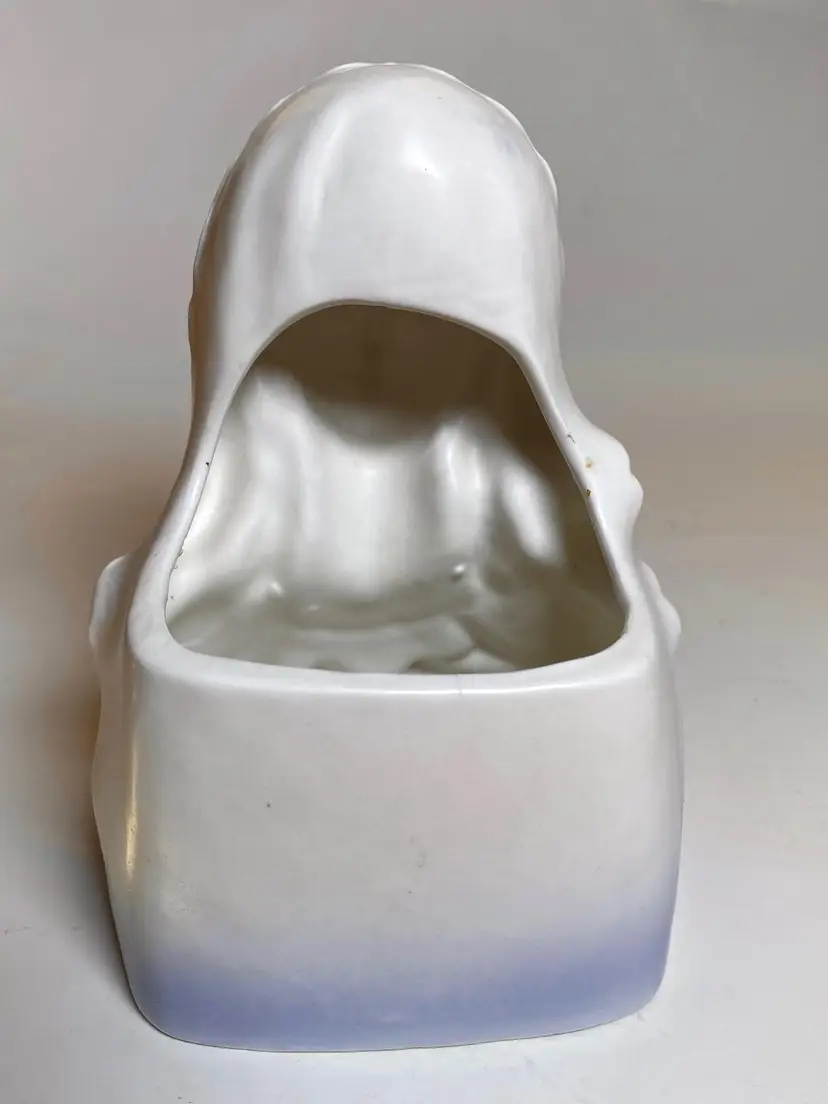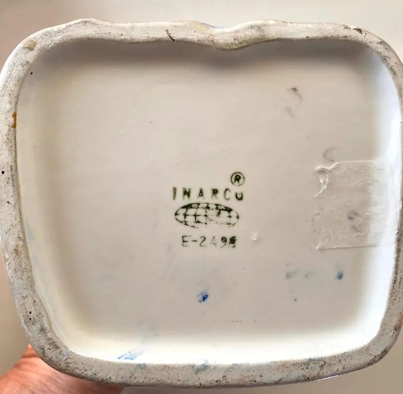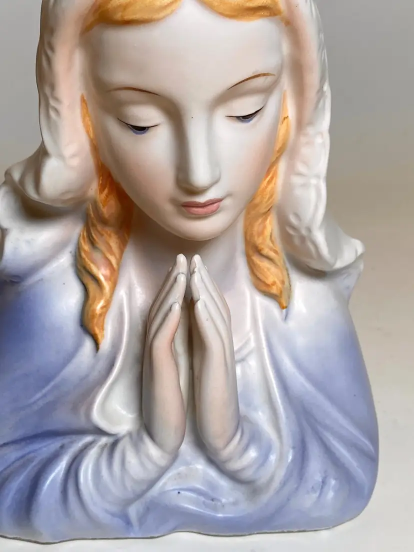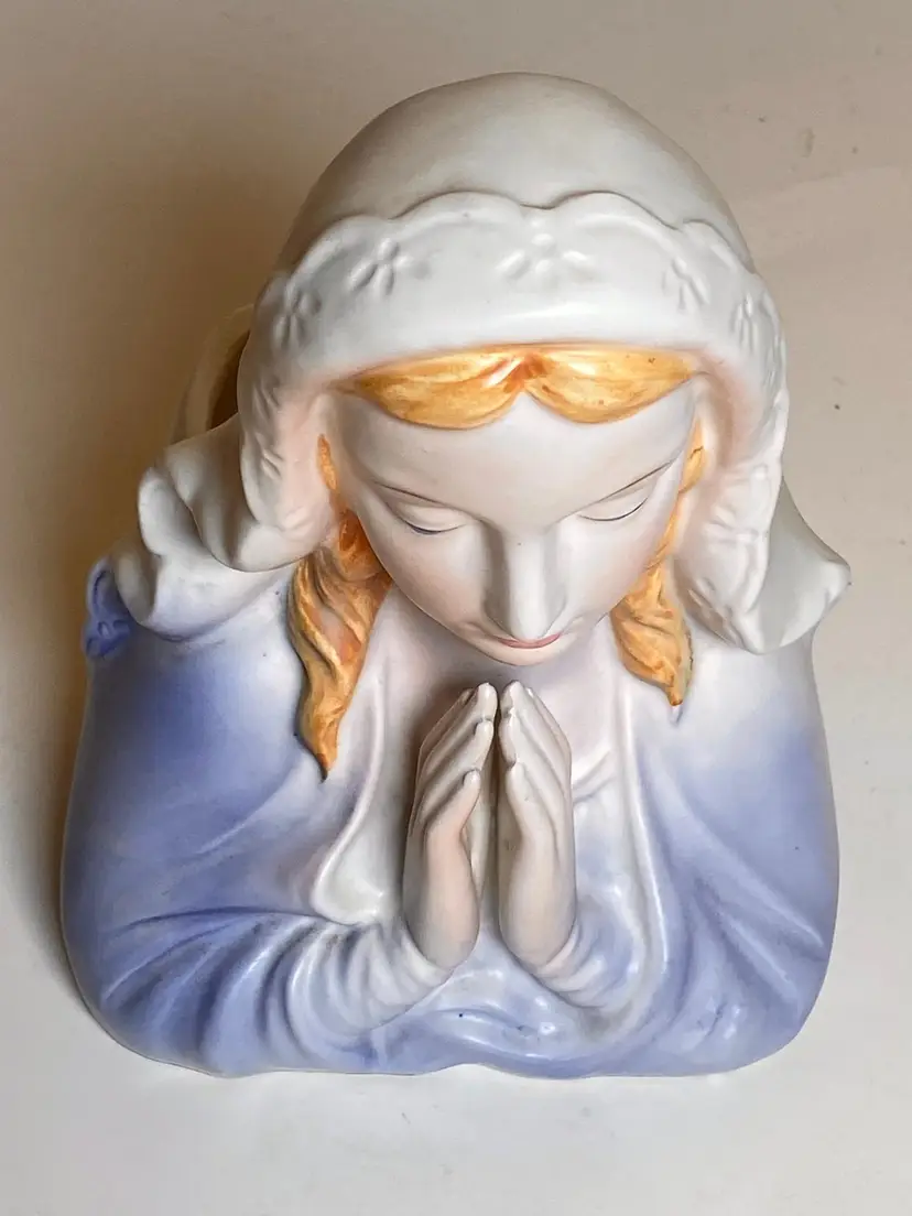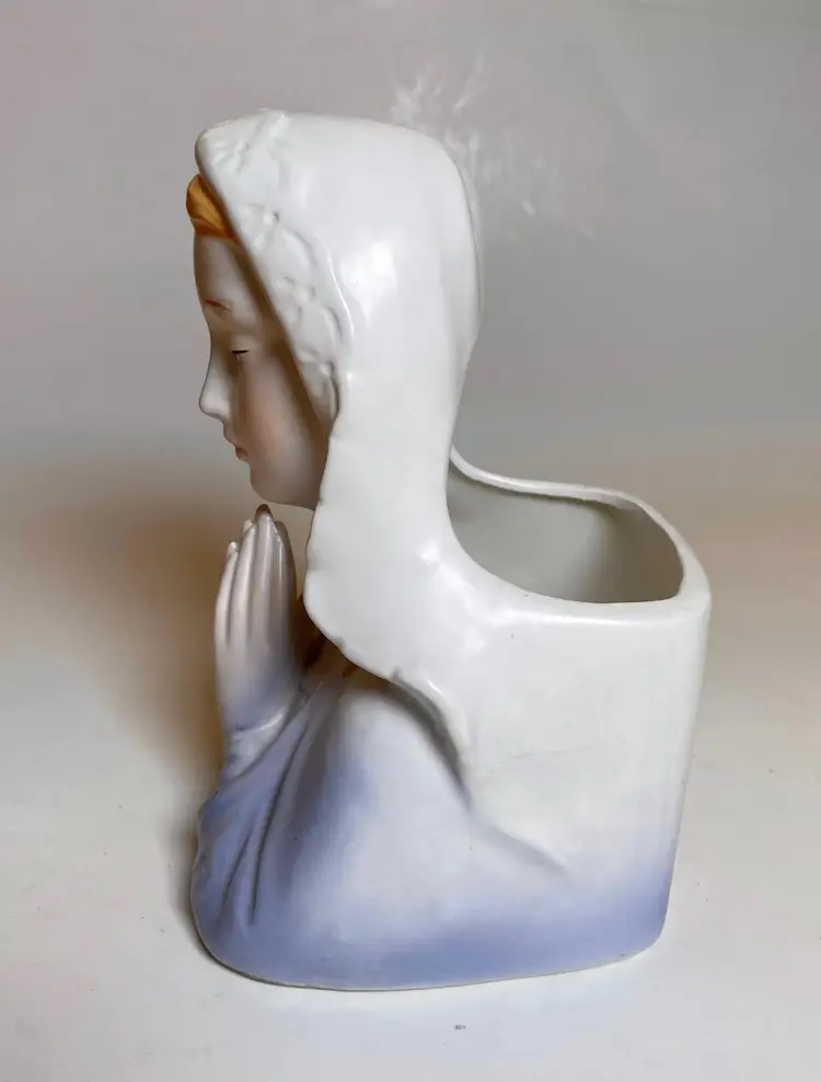 This vintage 1962 Inarco planter features a beautiful depiction of the Virgin Mary. Made from fine porcelain, this piece is a testament to the skill of Japanese artisans of the 1960's. It is adorned with delicate details and a gentle expression of peace and tranquility. Hand painted with lovely hues of blue, white and golden yellow. This item is perfect for collectors of religious artifacts as well as those who appreciate the beauty of vintage porcelain. In excellent pre-owned condition. No chips or cracks. Measures: 6.5": Tall x 4.75" width x 3" Planter depth.