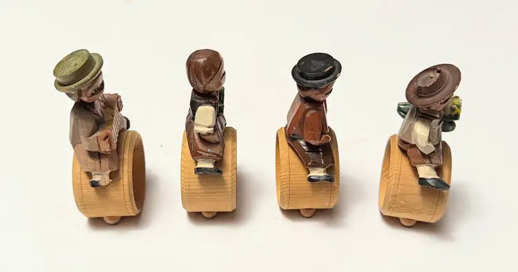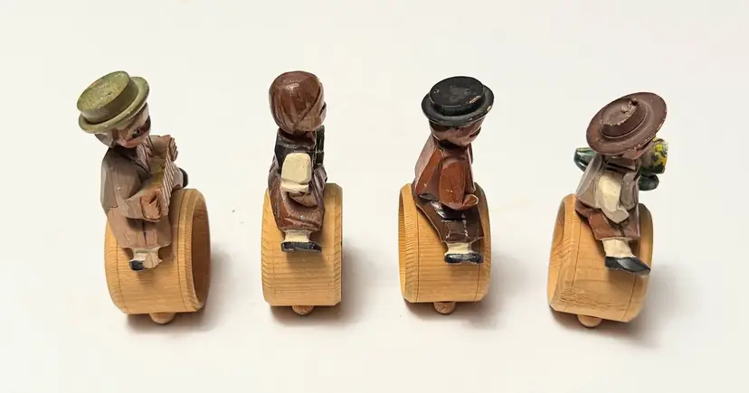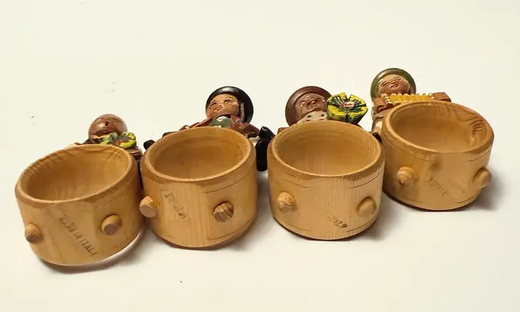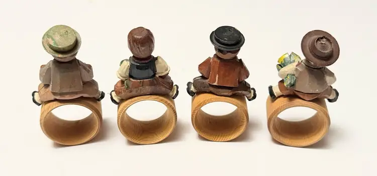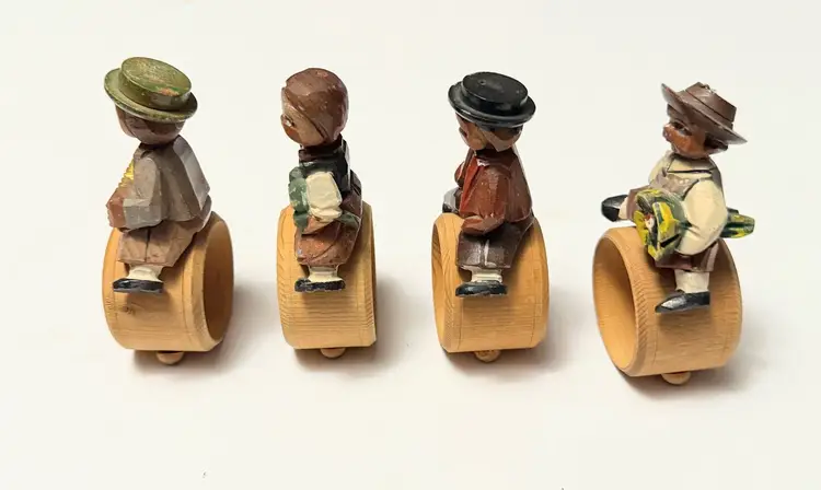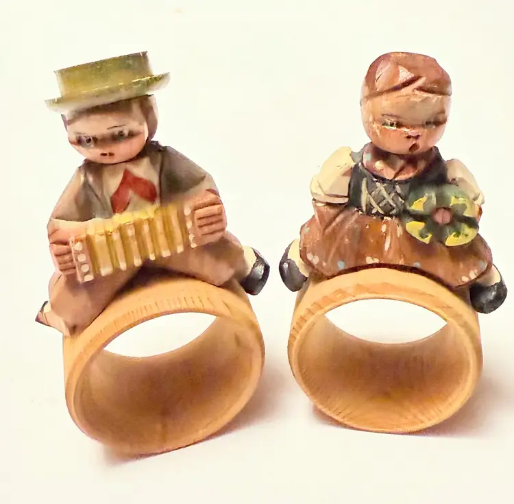 This VTG Italian Anri Folk Art Carved Wooden Napkin Ring features a hand-painted bobblehead design, adding a whimsical touch to your table setting. Crafted in wood with intricate detailing and vibrant multicolor hues, this small figurine brings a touch of mid-20th-century Italian style to your decor. Perfect for all occasions, this unique piece appeals to collectors of folk art and those with a fondness for fairy tales and vintage aesthetics. Made in Italy in the 1950s, this original vintage item is sure to be a conversation starter in your home.