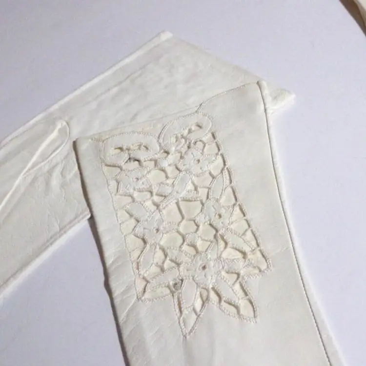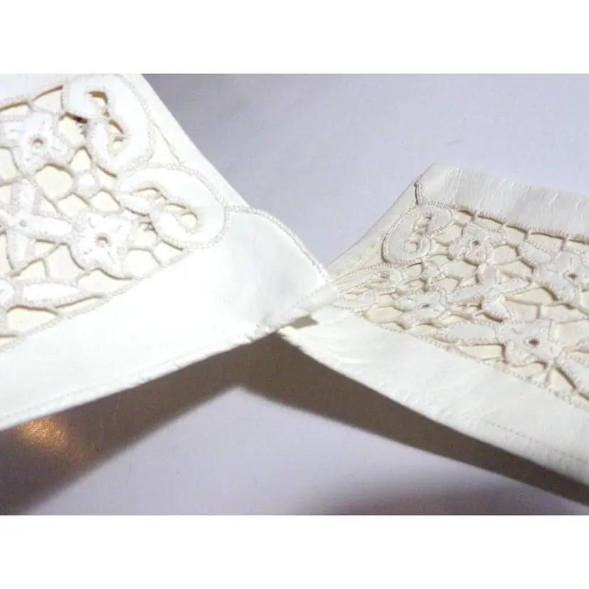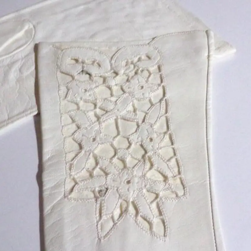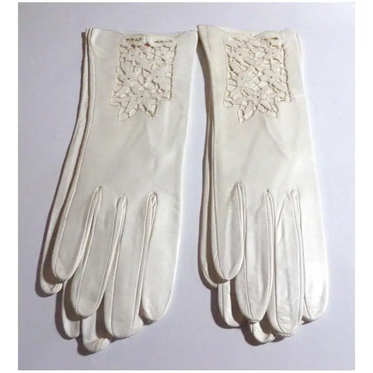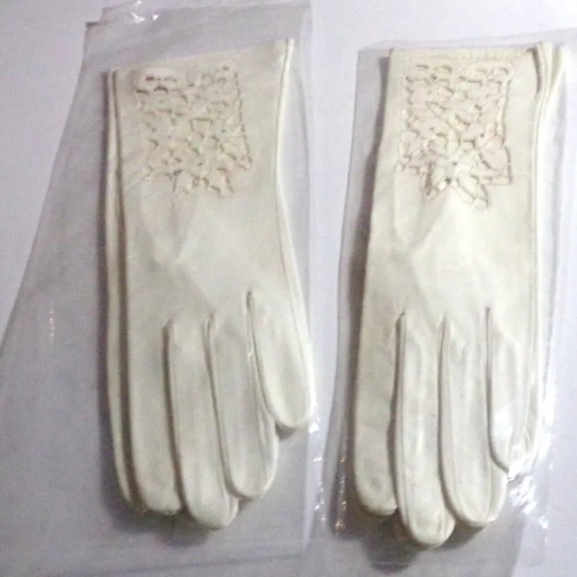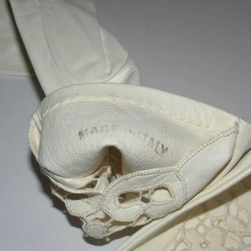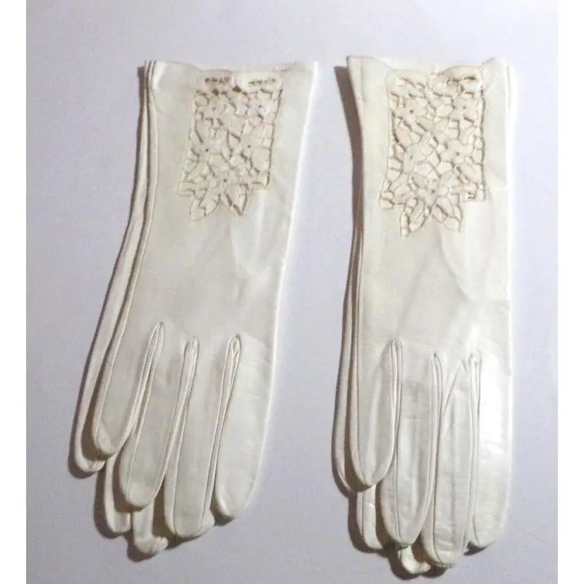 These are gorgeous, Vintage 1940s, Italian Ladies Cutwork Ivory/Cream, Size 8, Kid Leather Evening Gloves. They are 12" long each. I have 2 Pair Available-each pair is sold separately! They are new old stock. Each pair, is attached to each other with a stitch. They were stored away in their original clear plastic bags and found in a small shopping bag, from a store in Rome, Italy. Please see all pics, as they are part of the description.