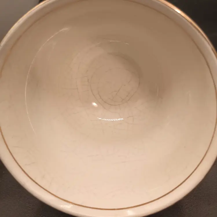 Measurements: Teacup 2 3/4 tall x 3 1/2 diameter x 4 1/2 handle to opposite side Saucer: 5 3/4 diameterPreowned: There is heavy crazing on the teacup. There are no chips or cracks to either piece but there may be wear to the gold accents.