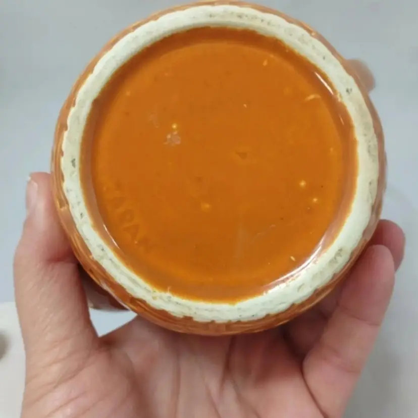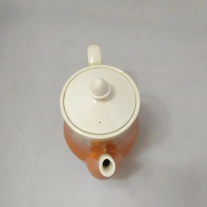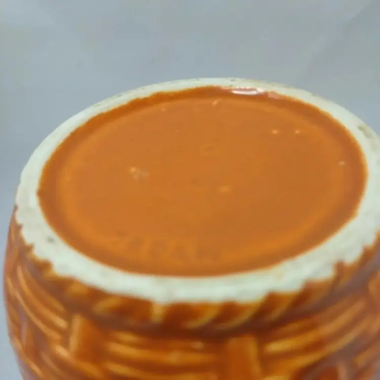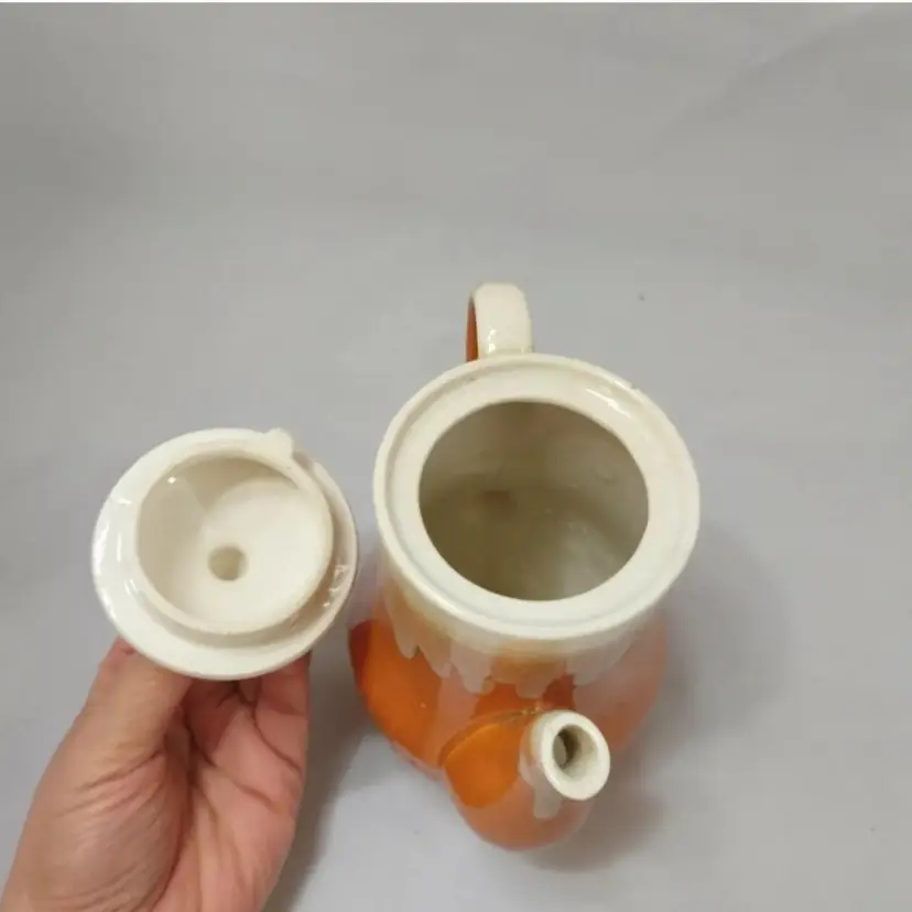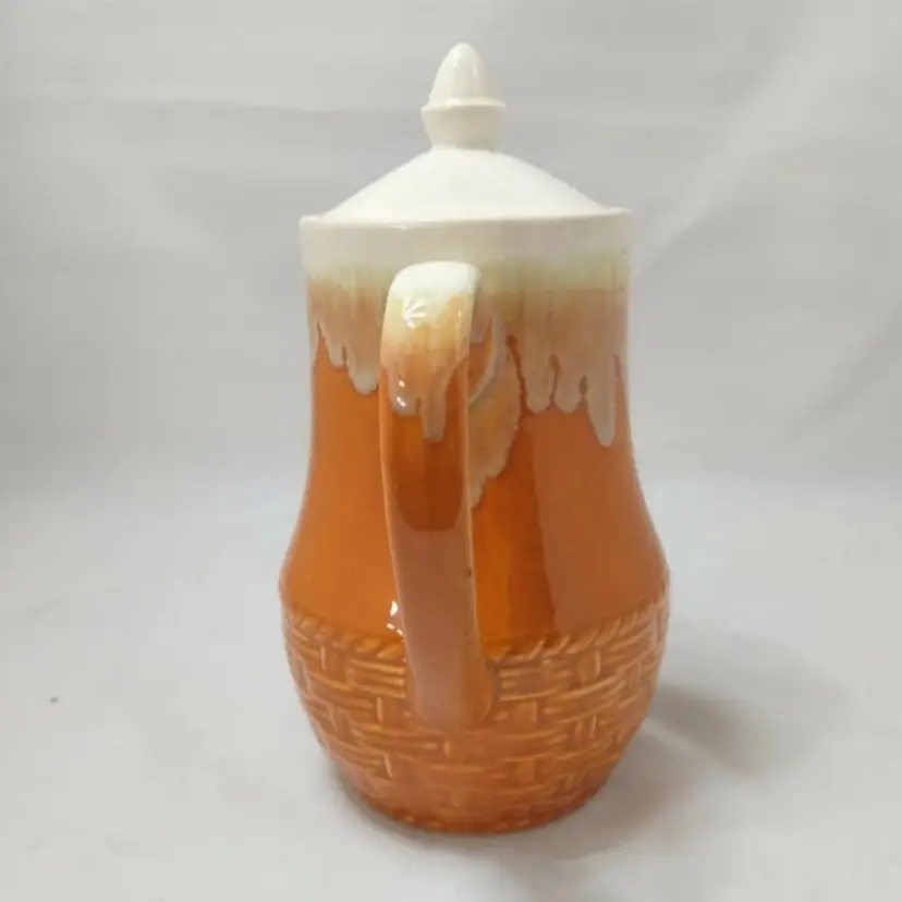 Small 2 cup coffee or cocoa serving pot Orange glaze with cream drip and basket weave design No chips or cracks 7 3/4" tall 6 1/2" at widest point