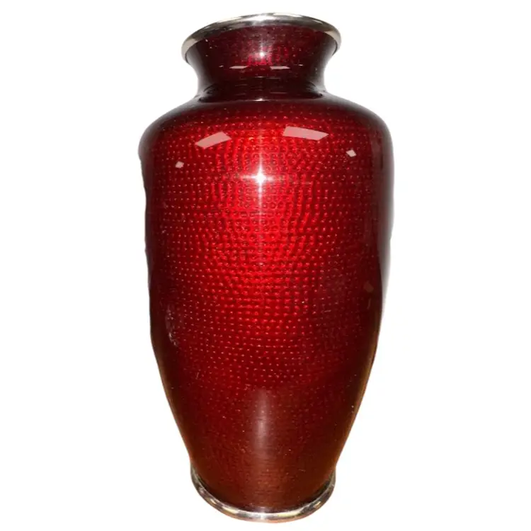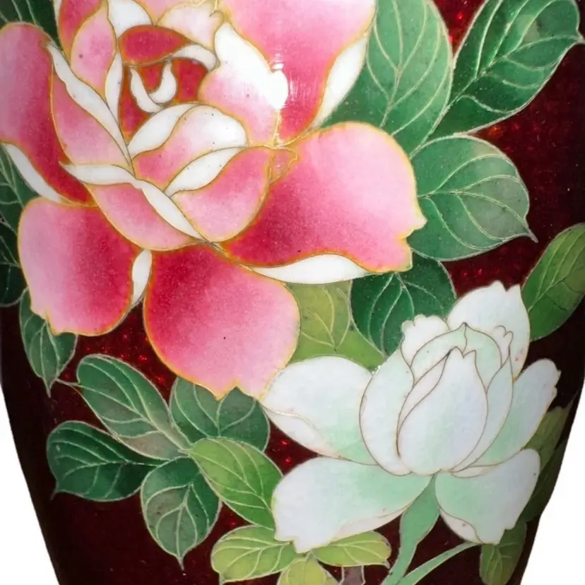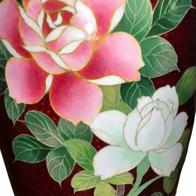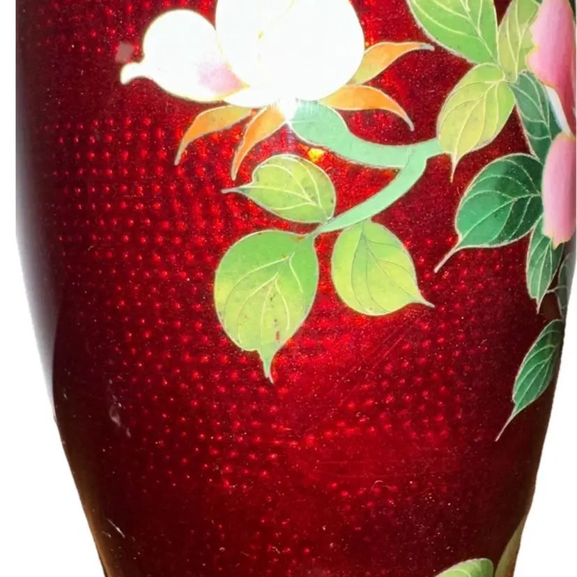 Absolutely stunning is this Vintage Japanese Ginbari Cloisonné Ando Sato Pigeon Blood Red Floral Roses Vase 7.5” tall x 3.75”-4” in diameter Fantastic condition!